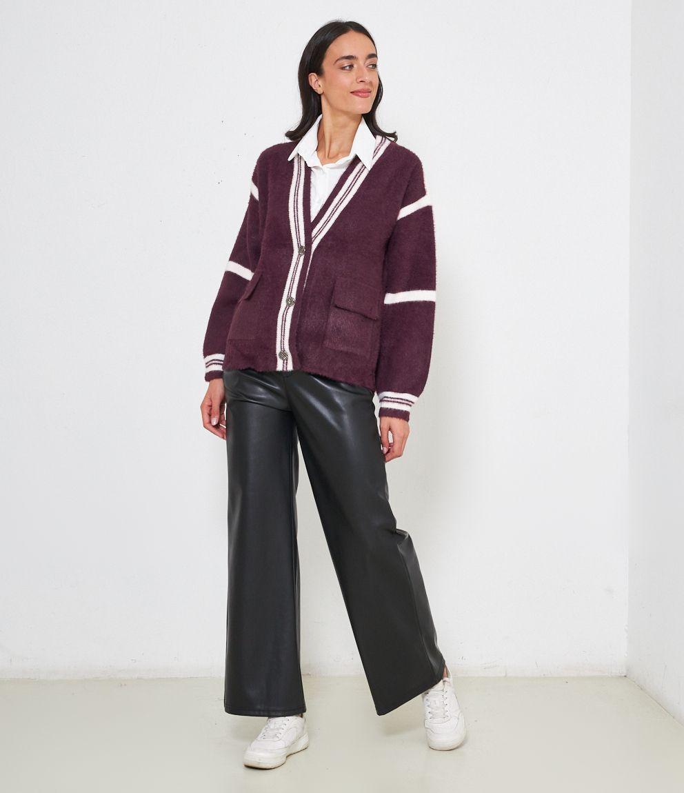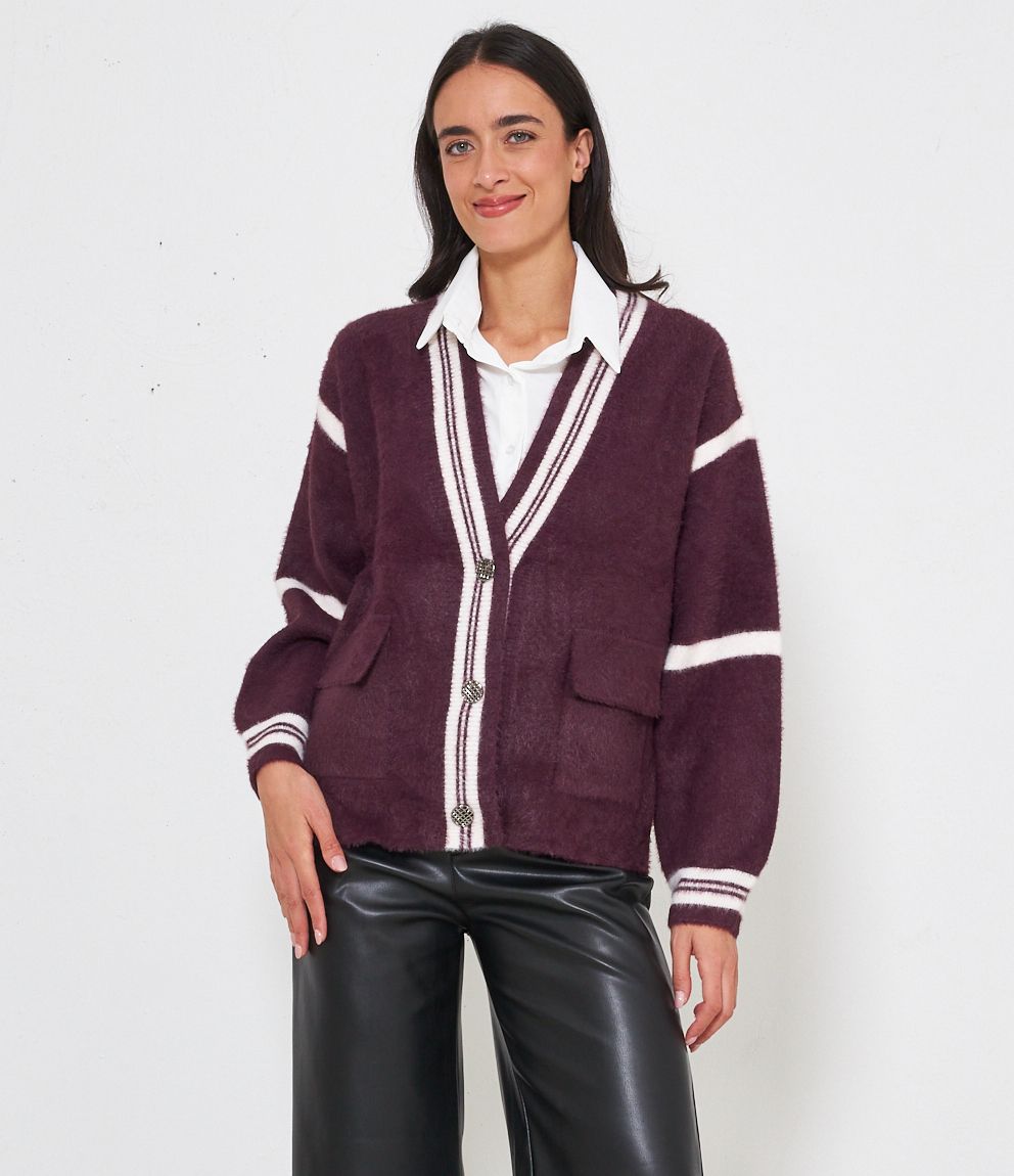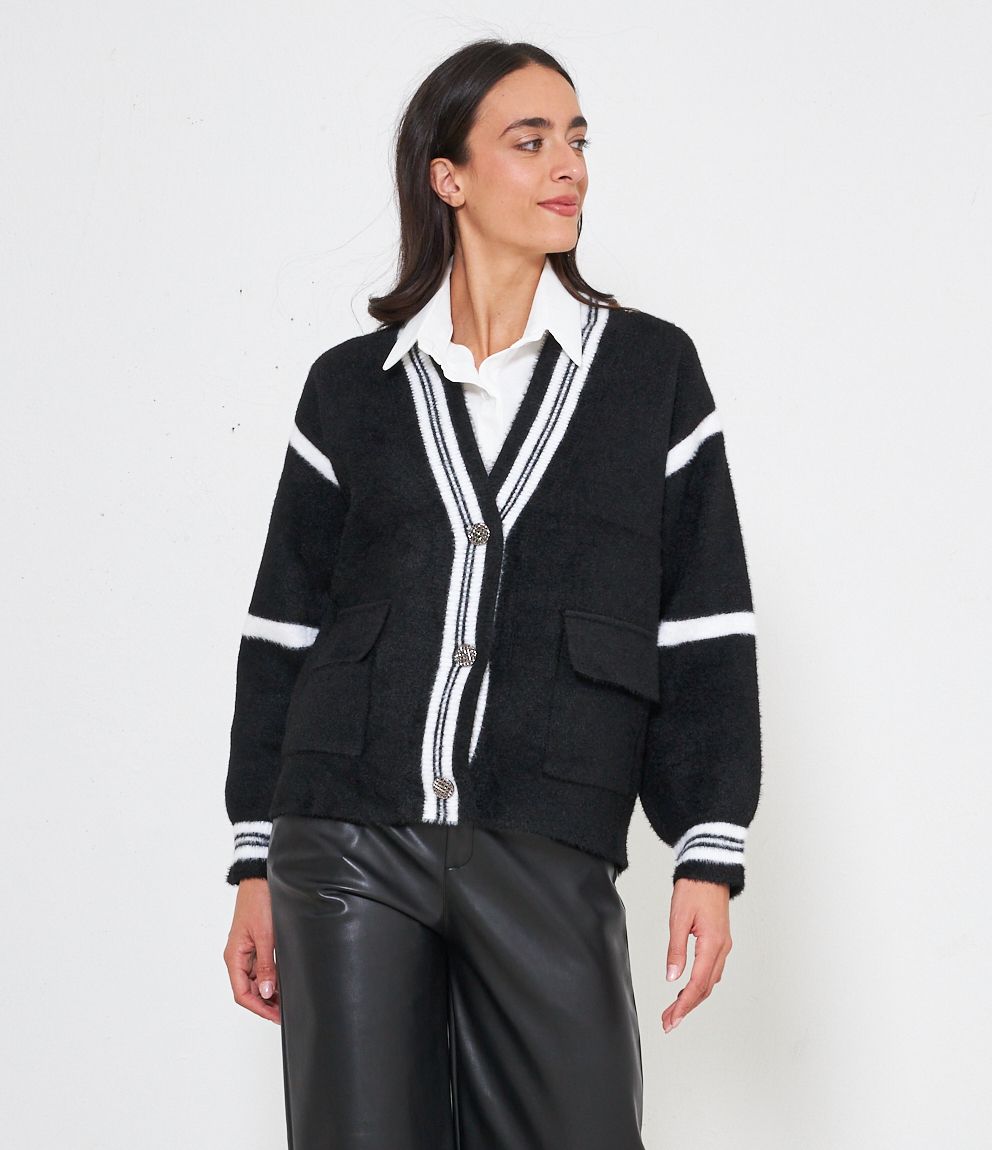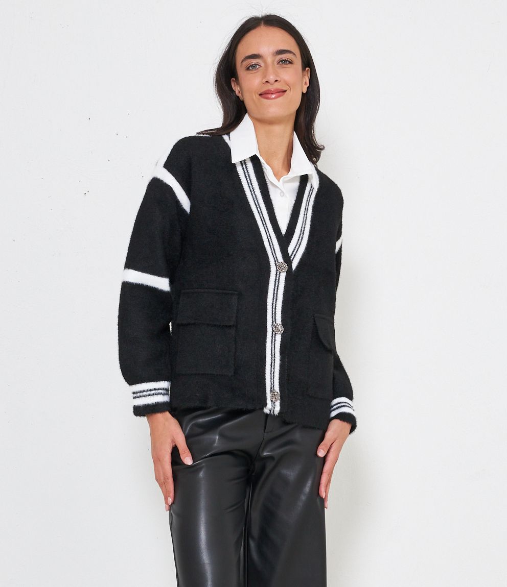 Cardigan modello over con scollo a V e bottoni gioiello. Tasche con patta.