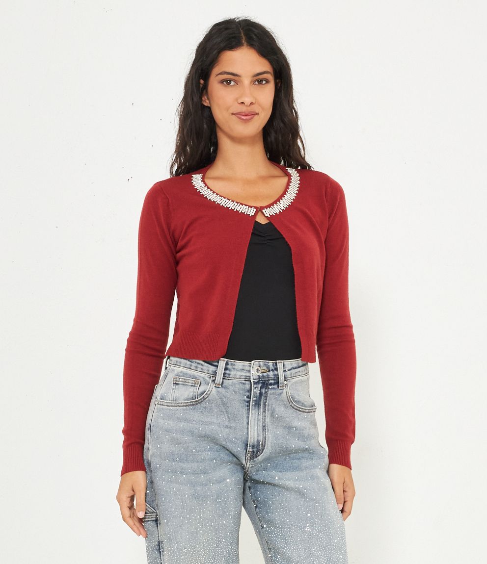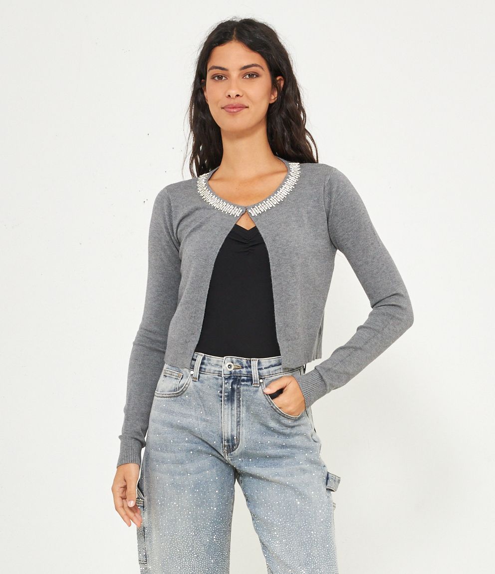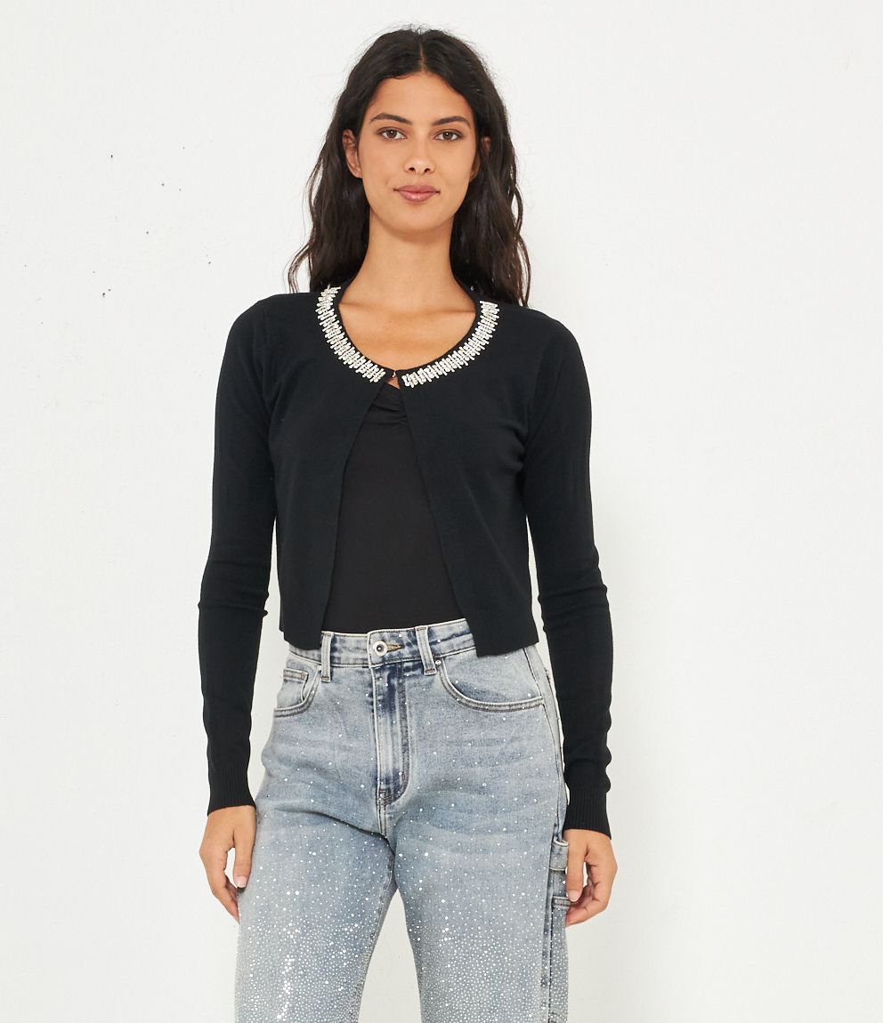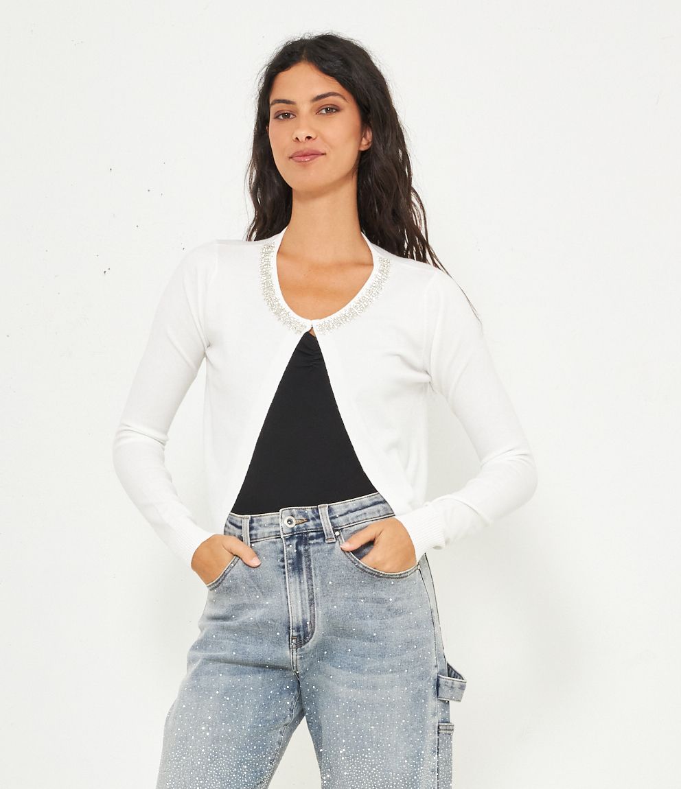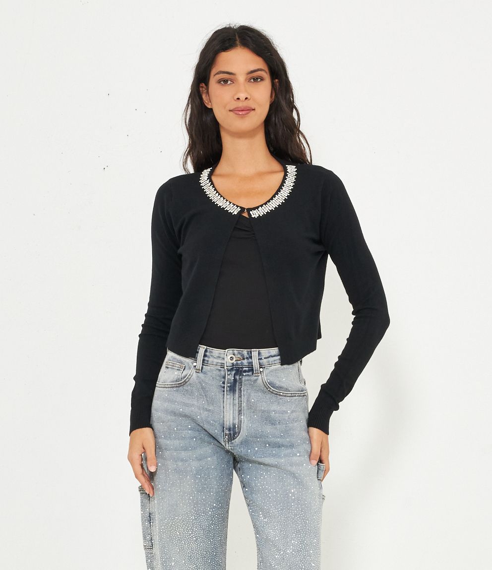 Cardigan in viscosa con scollo di strass e chiusura con gancio metallico.