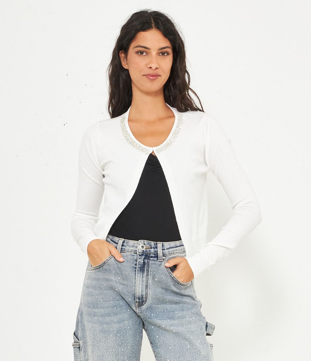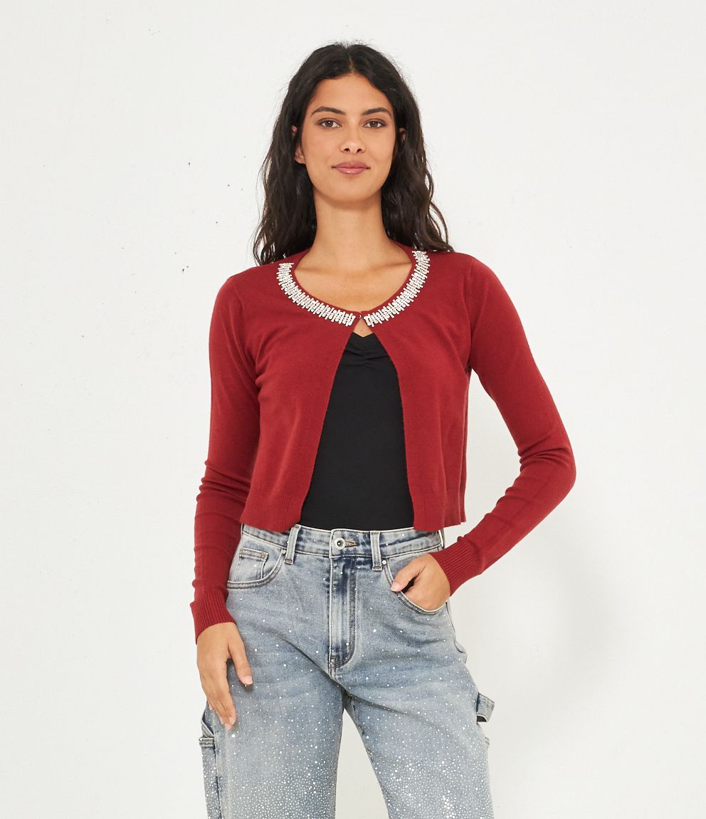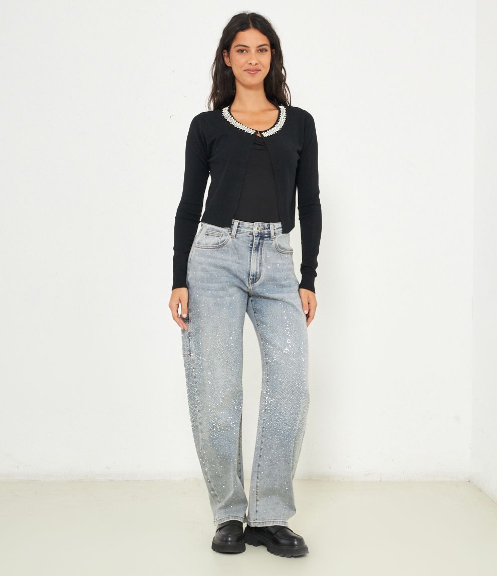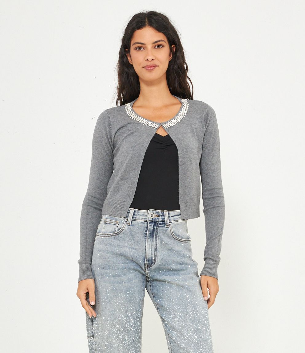 Cardigan in viscosa con scollo di strass e chiusura con gancio metallico.