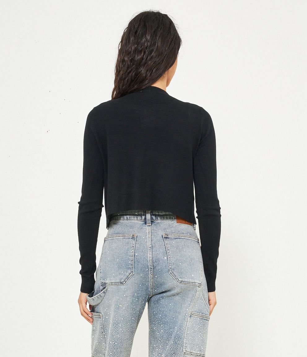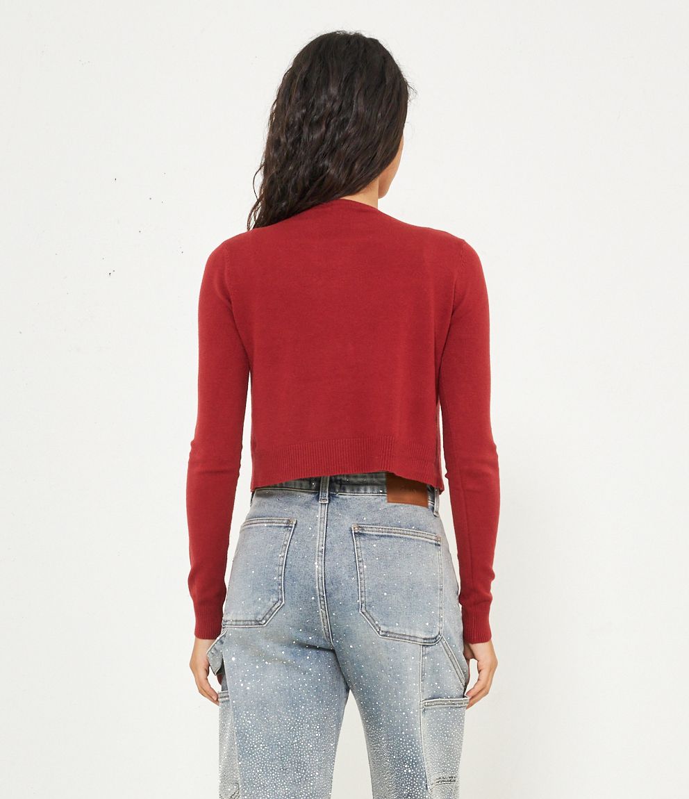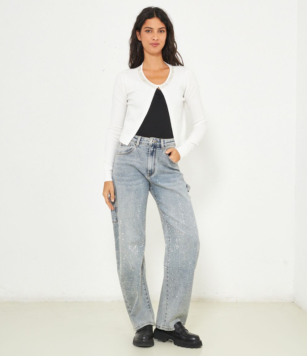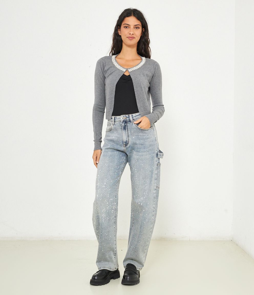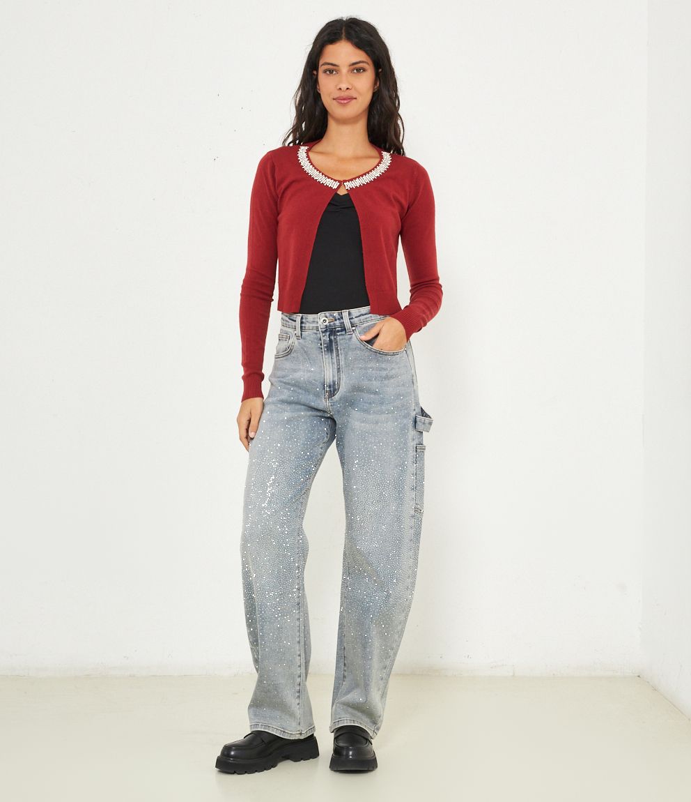 Cardigan in viscosa con scollo di strass e chiusura con gancio metallico.
