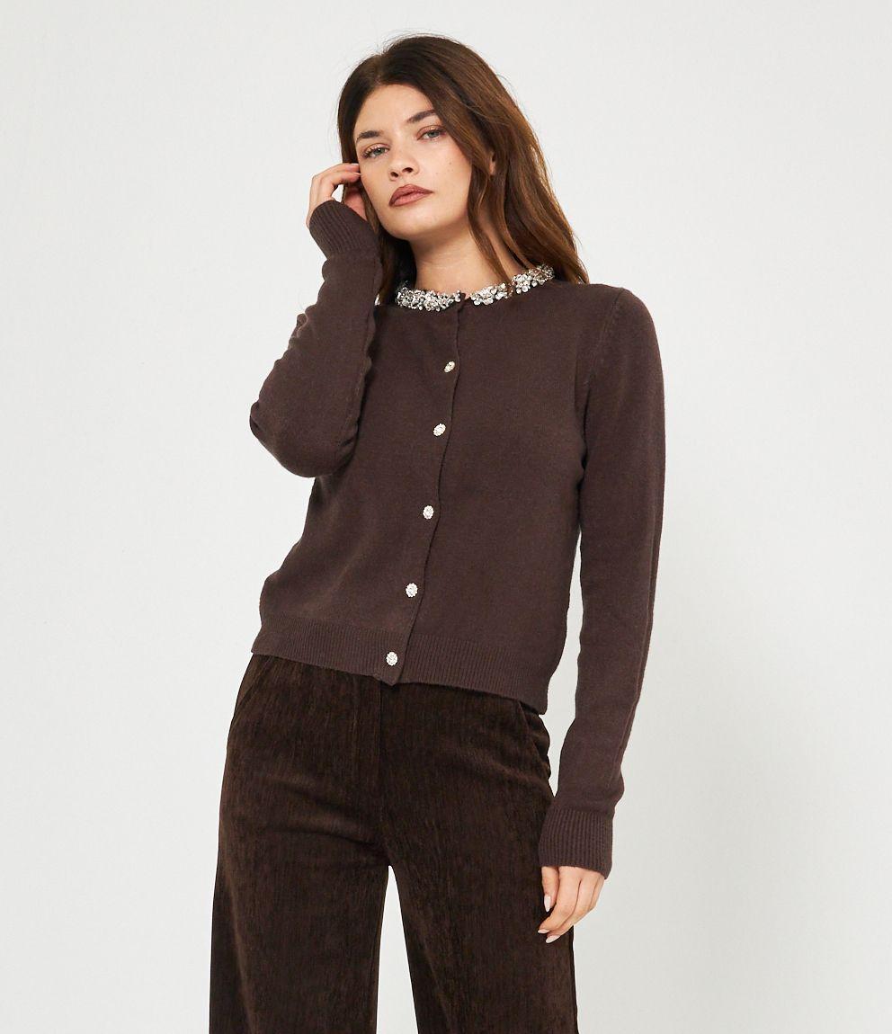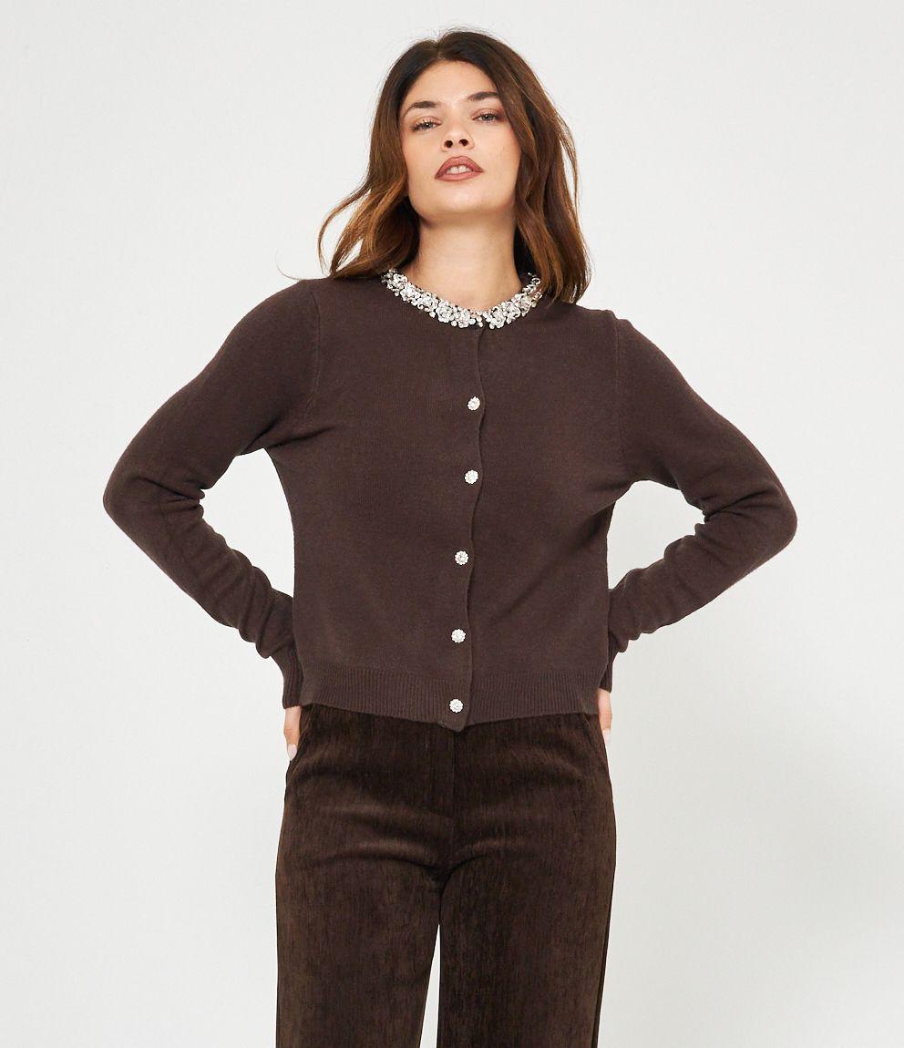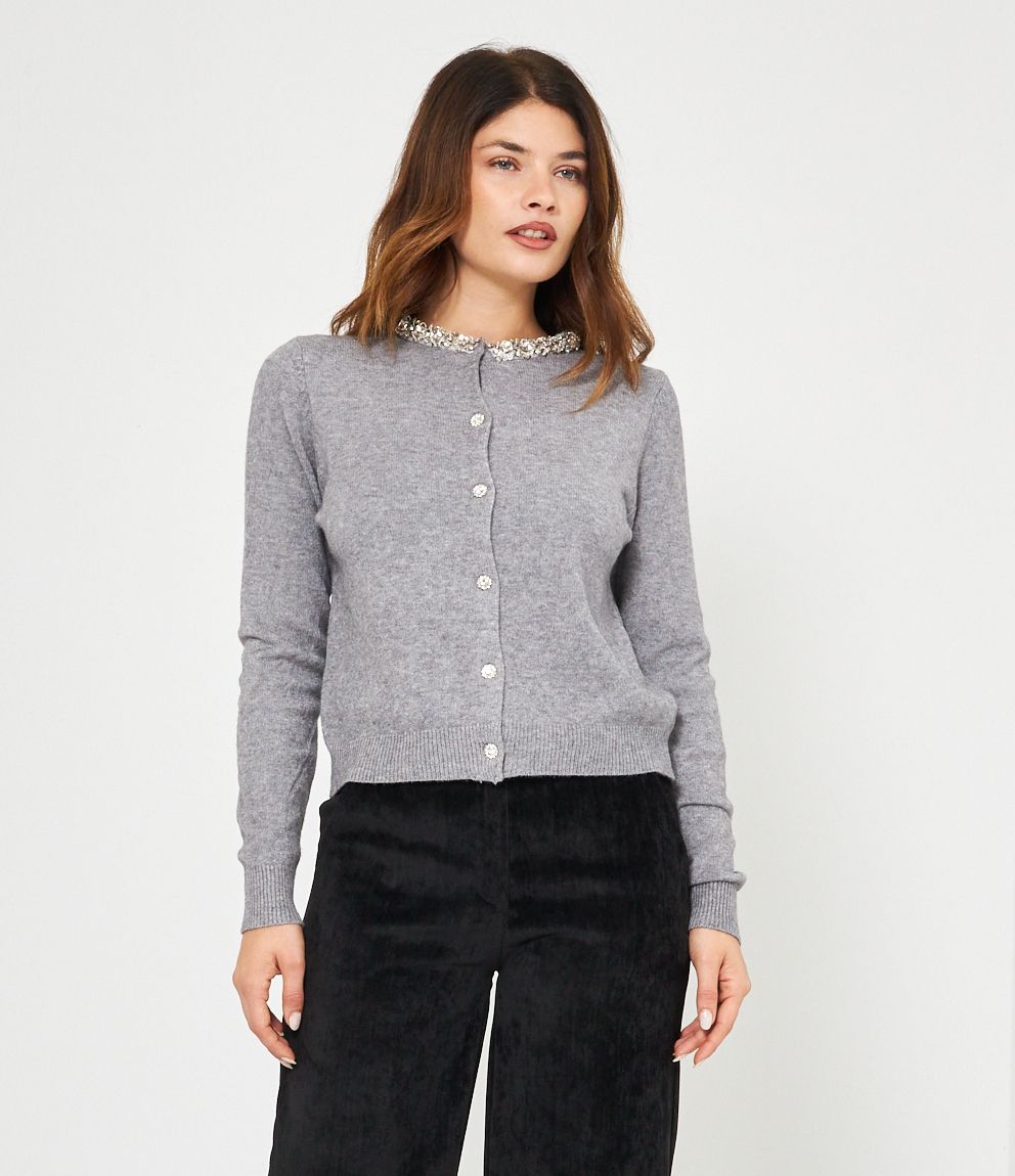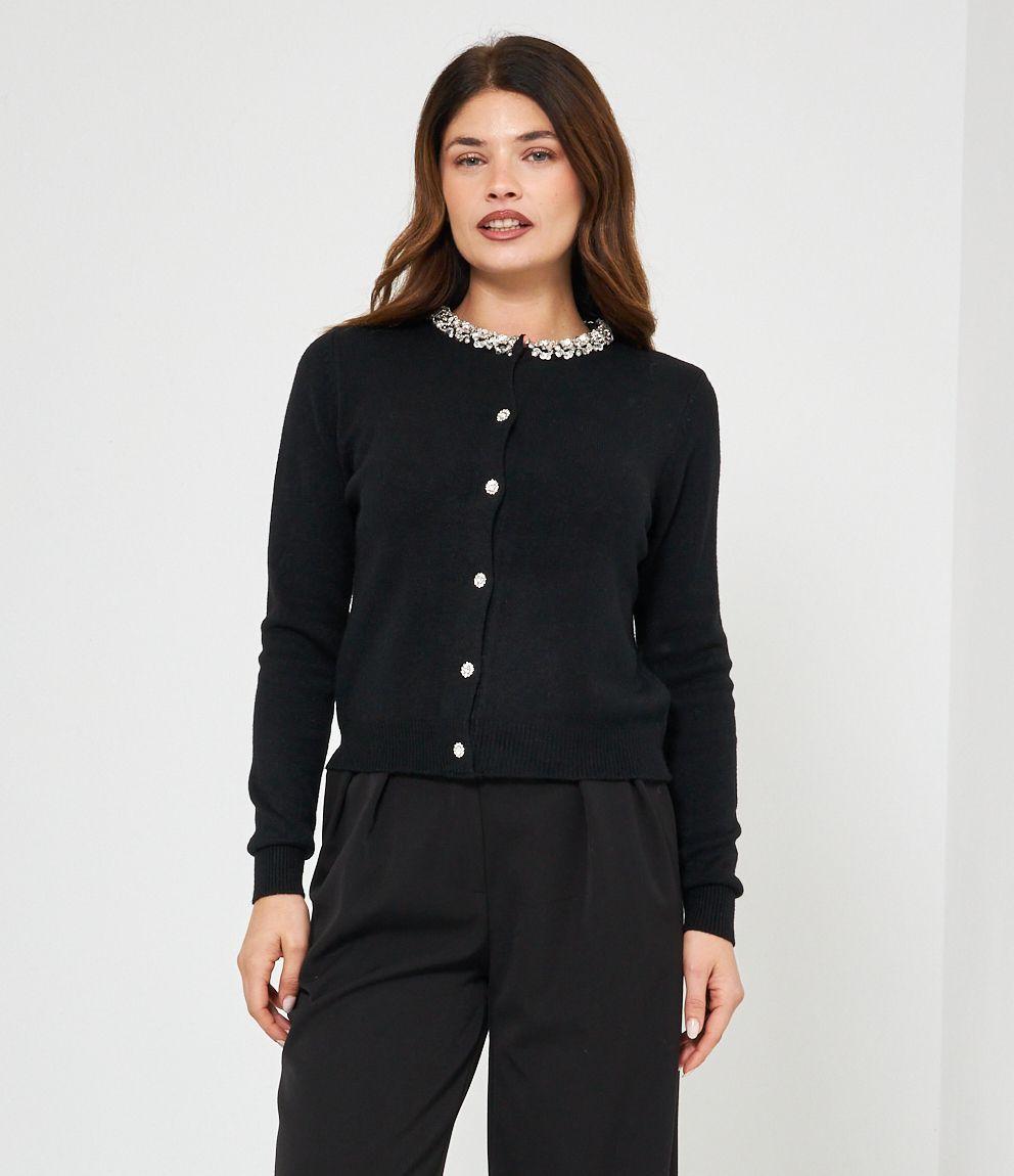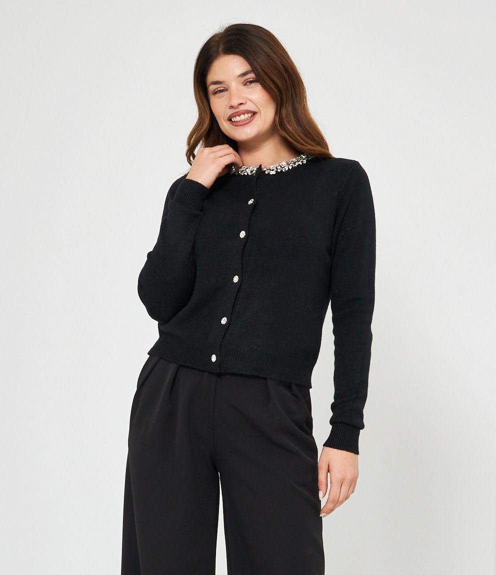 Cardigan con scollo di strass e bottoni a scatto gioiello.