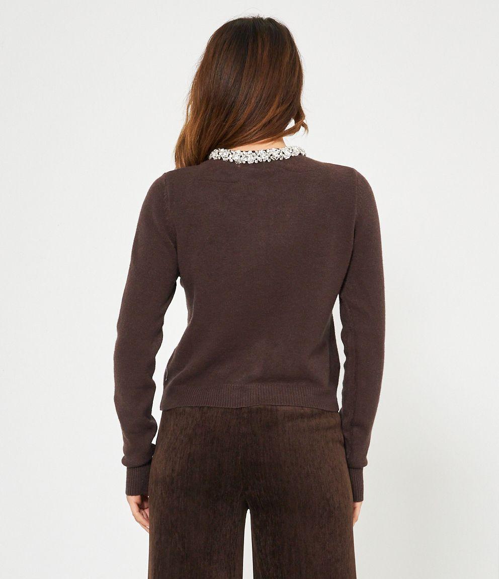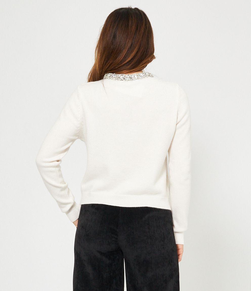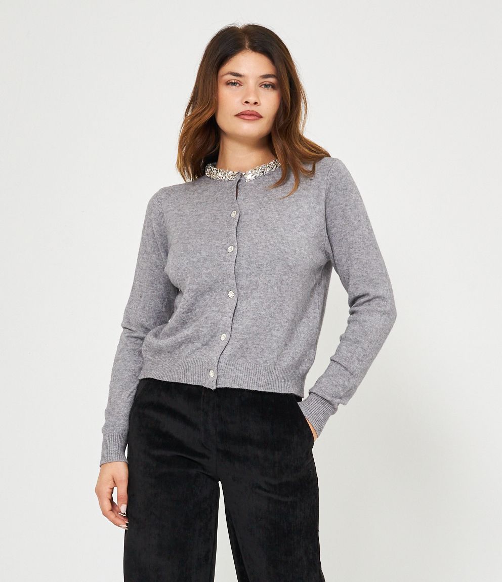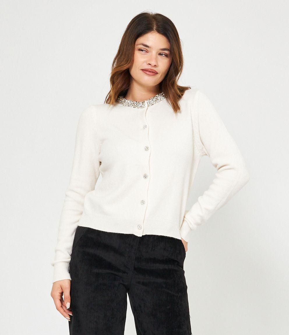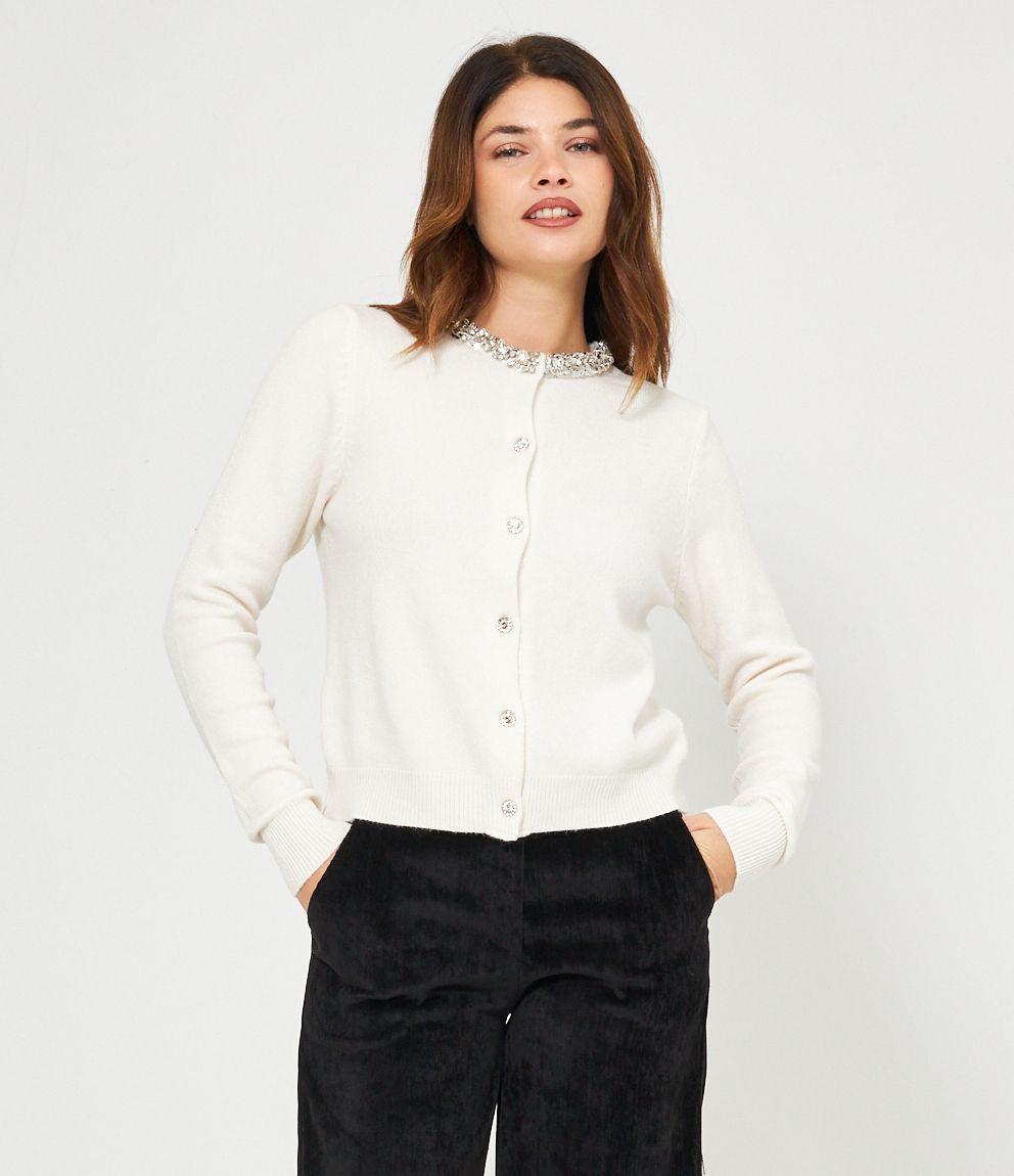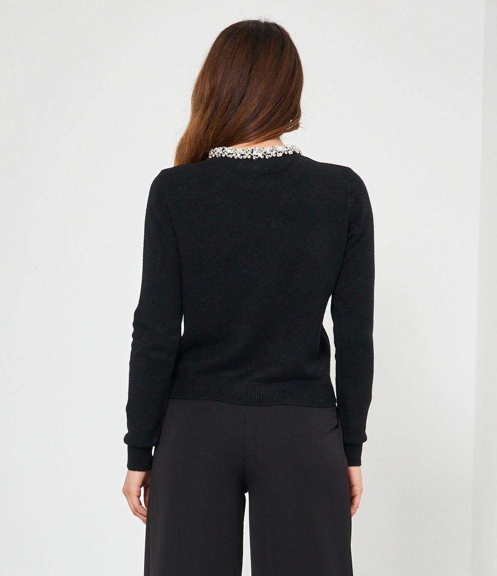 Cardigan con scollo di strass e bottoni a scatto gioiello.