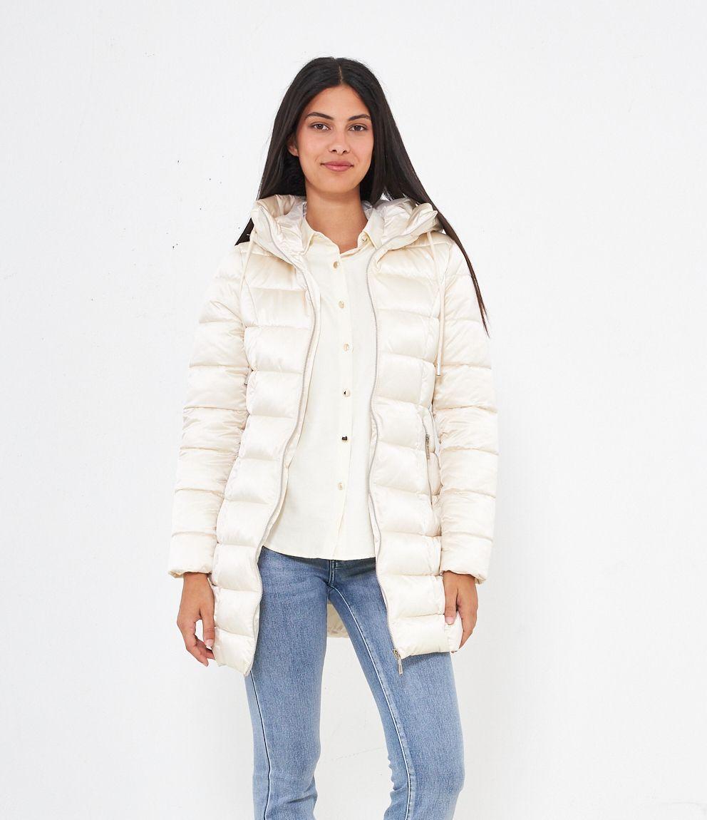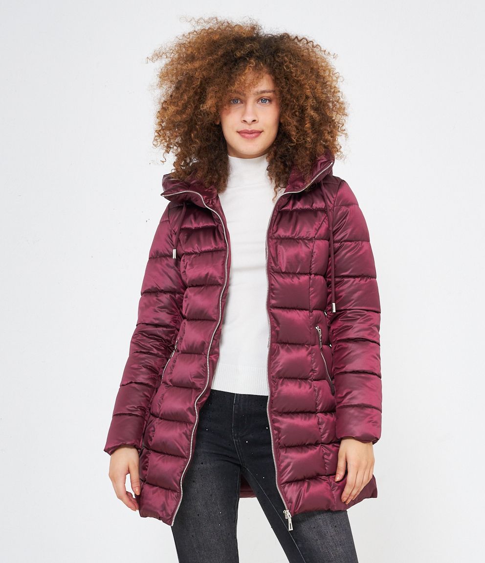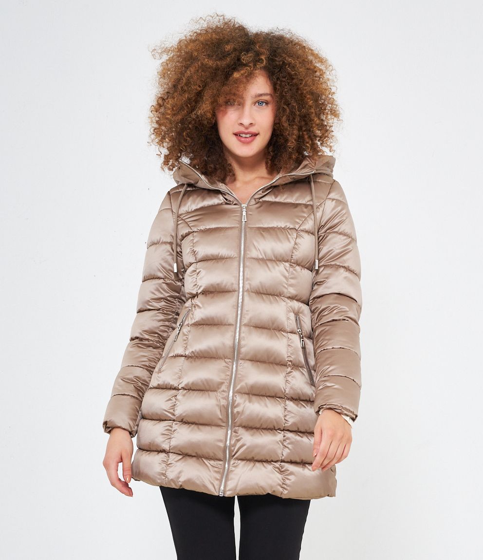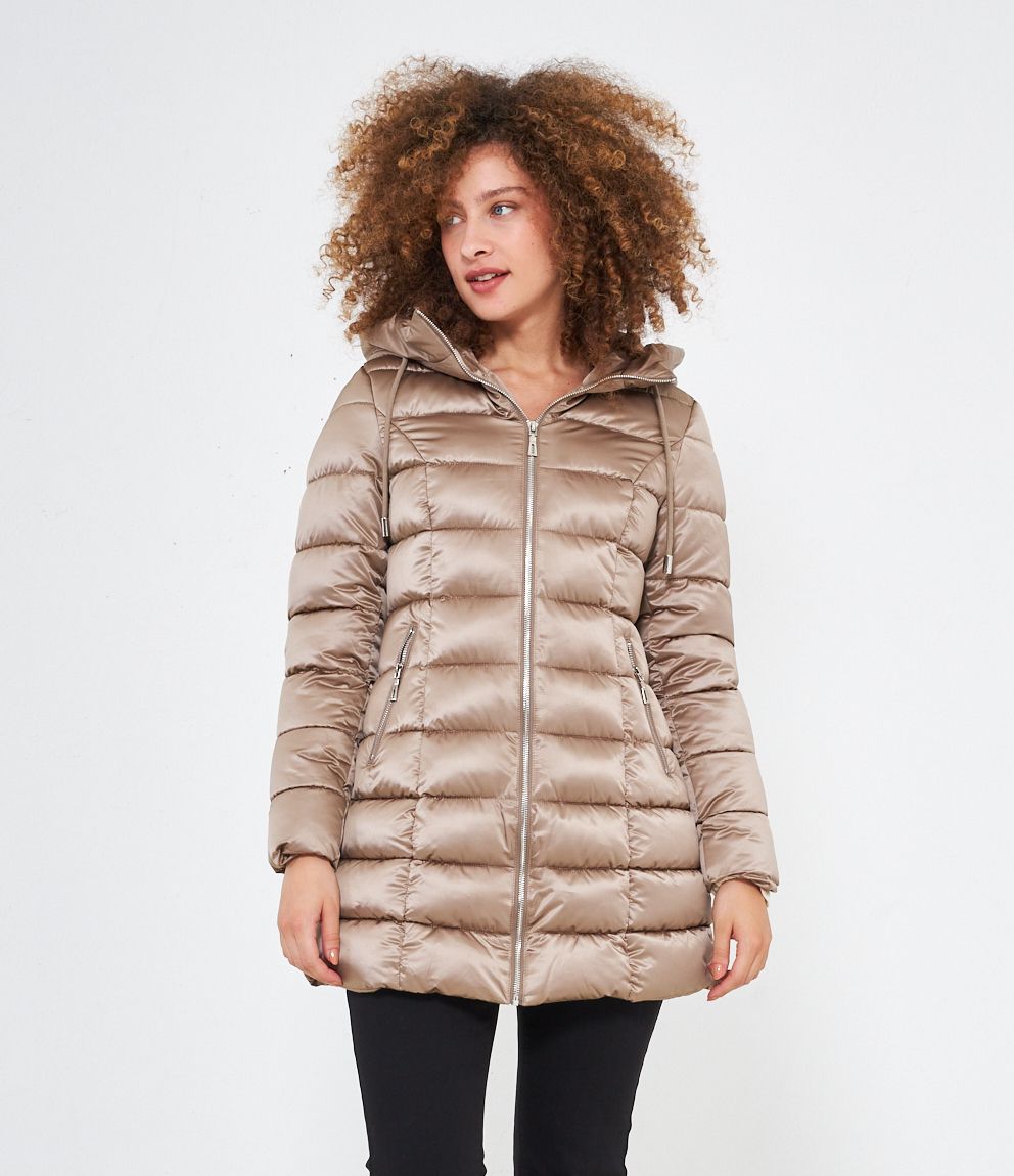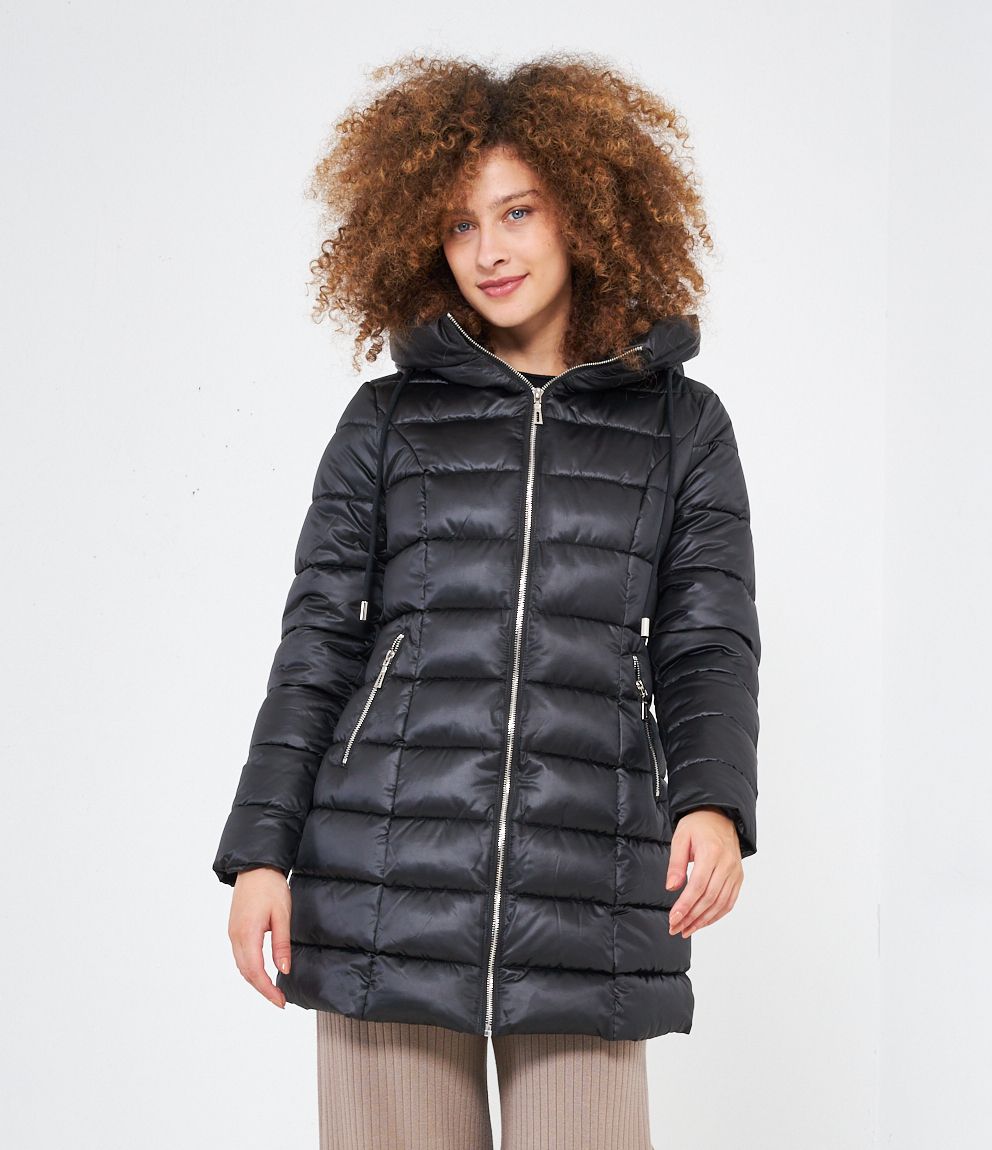 Piumino modello midi con impunture a vista, cappuccio con coulisse e tasche laterali. Chiusura con zip.