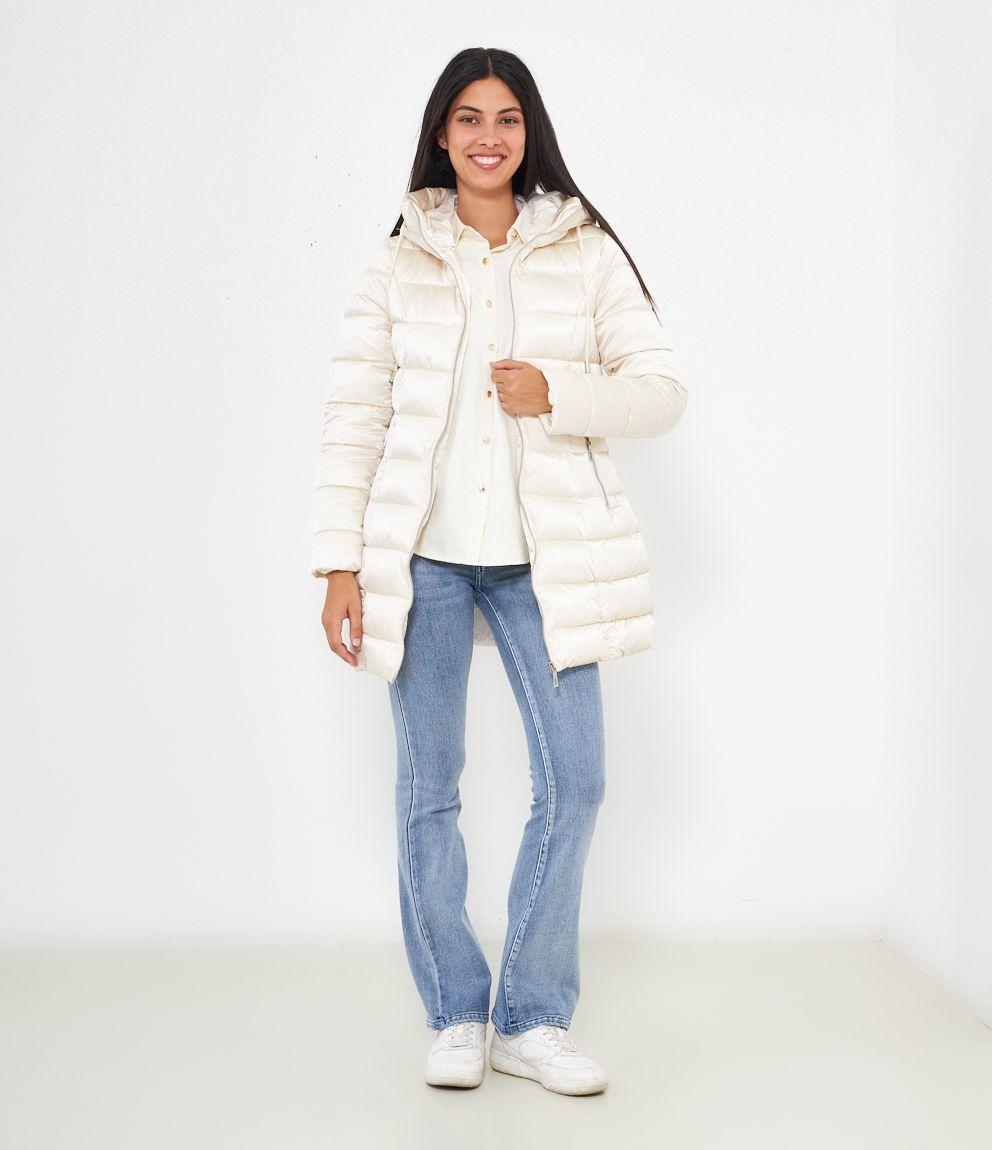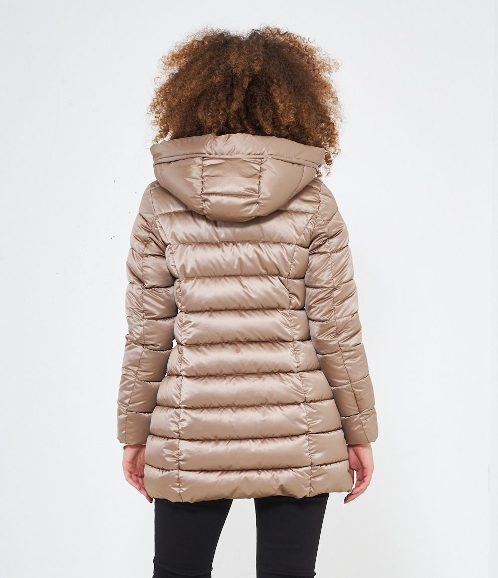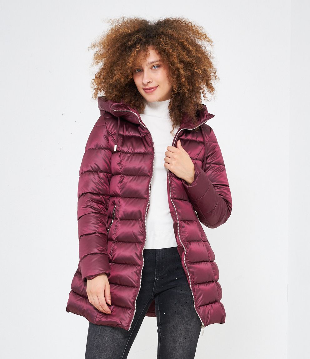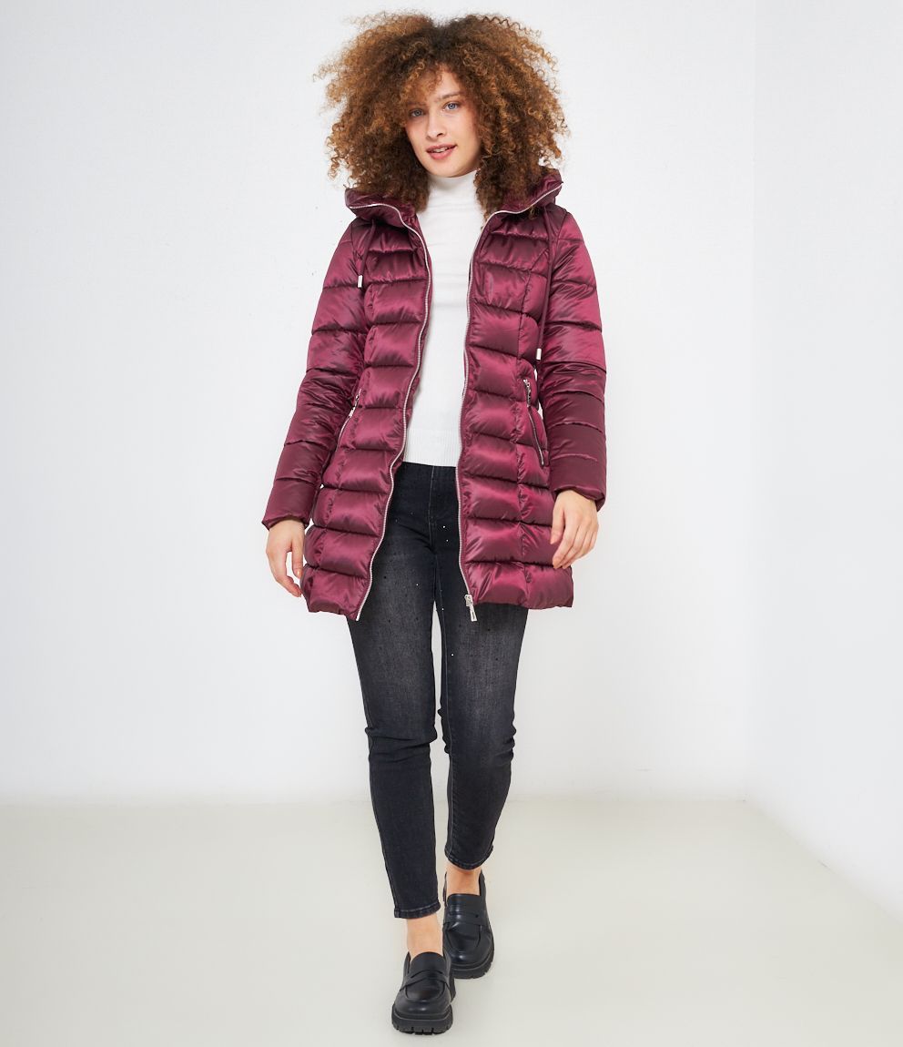 Piumino modello midi con impunture a vista, cappuccio con coulisse e tasche laterali. Chiusura con zip.