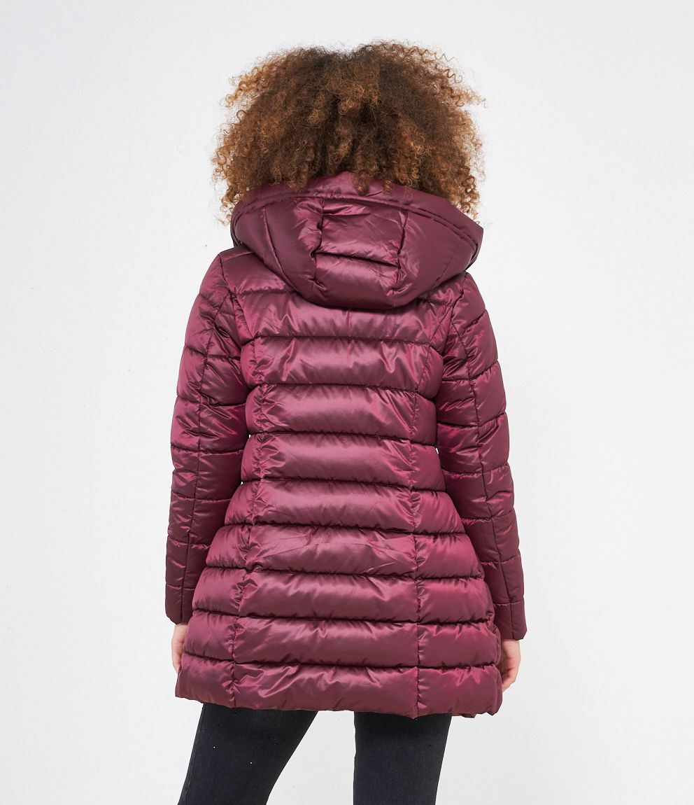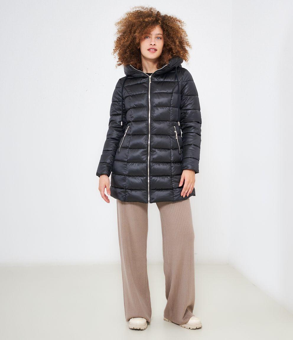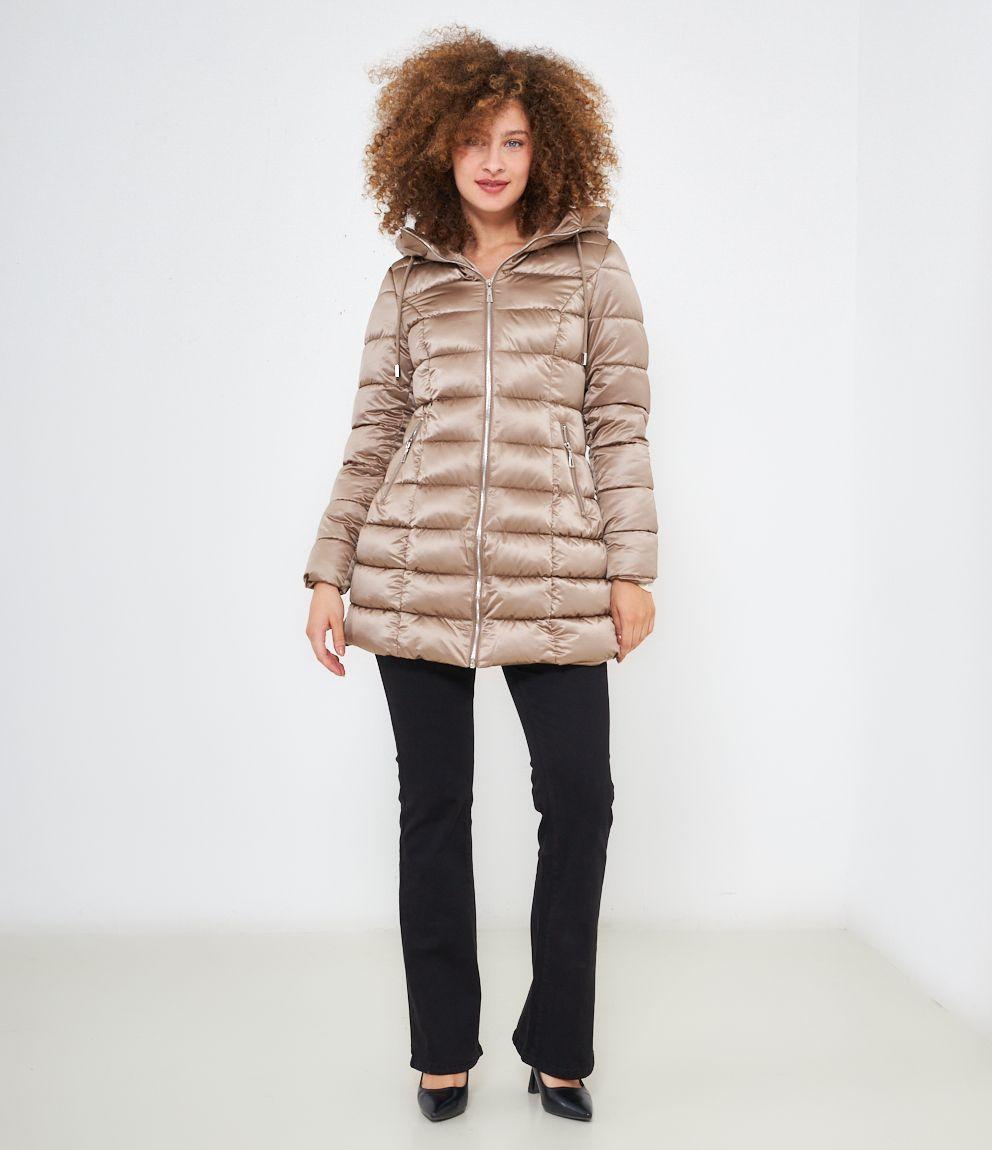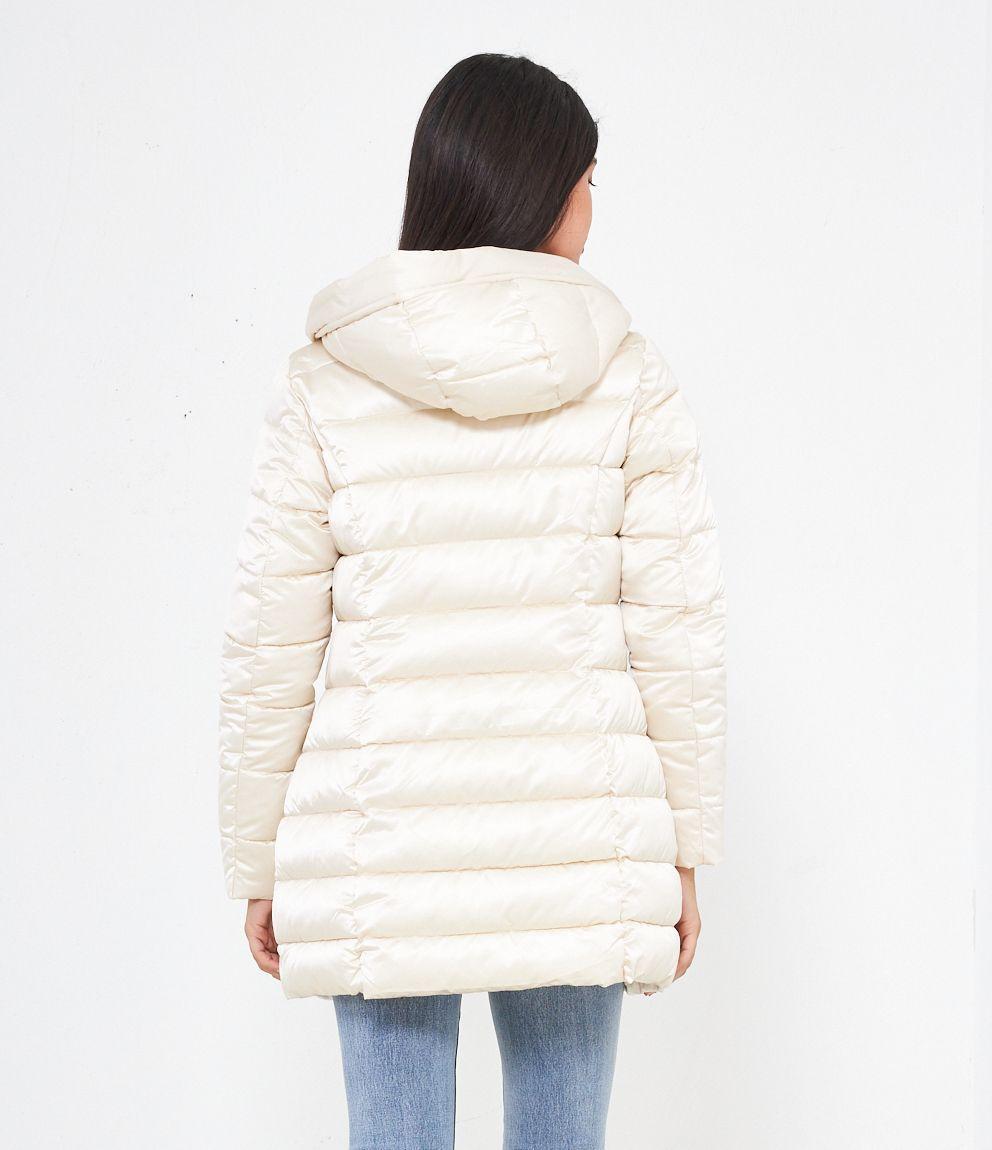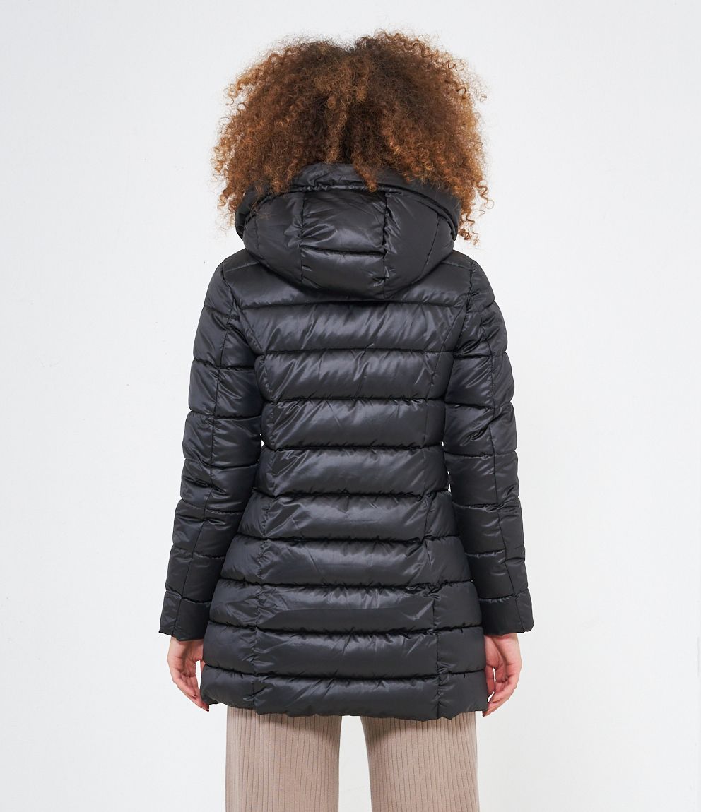 Piumino modello midi con impunture a vista, cappuccio con coulisse e tasche laterali. Chiusura con zip.