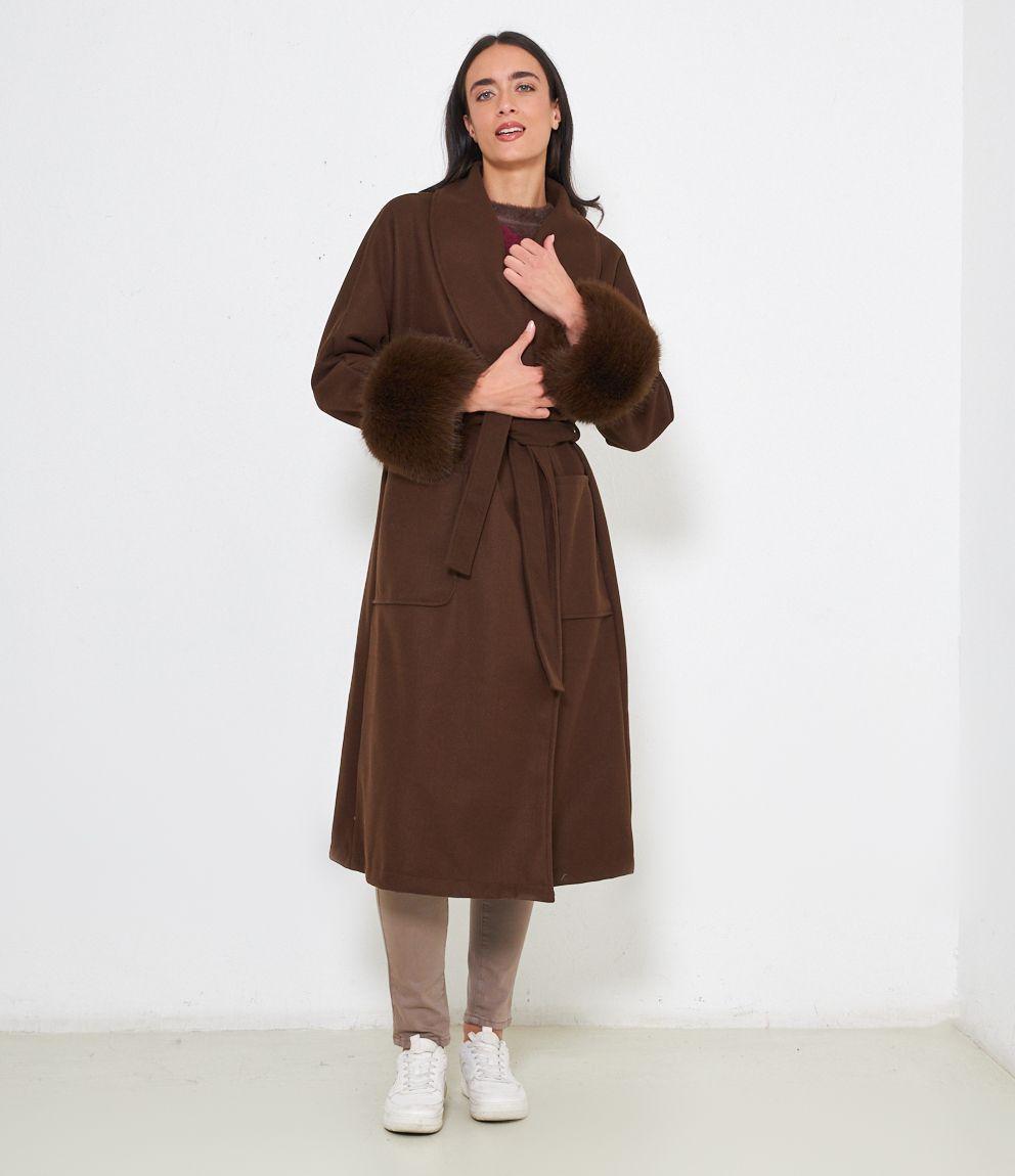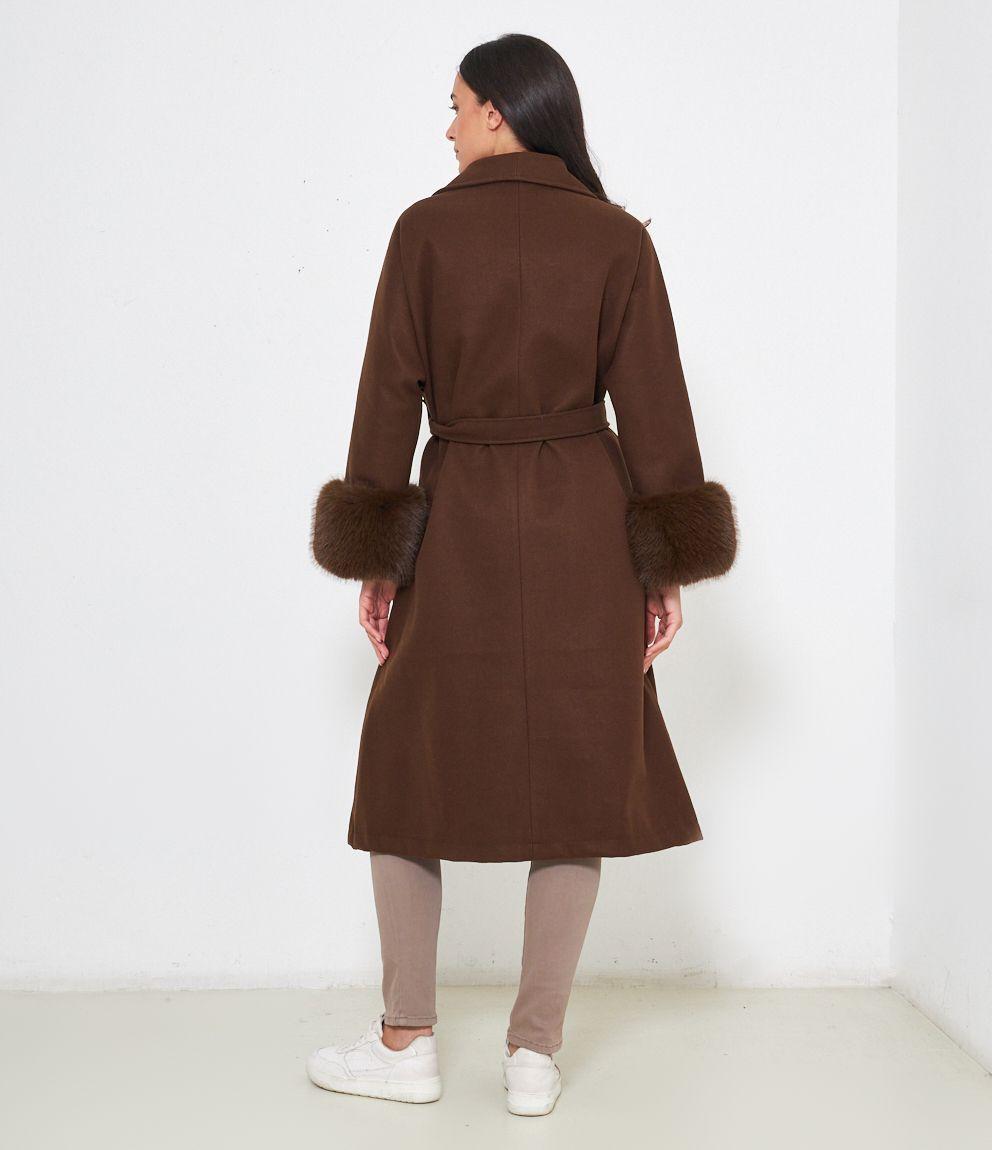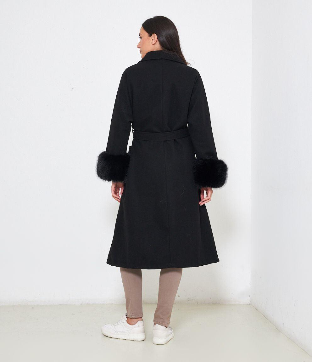 Cappotto lungo con manicotti in pelliccia rimovibili. Collo revers e chiusura con cintura. Tasche frontali.