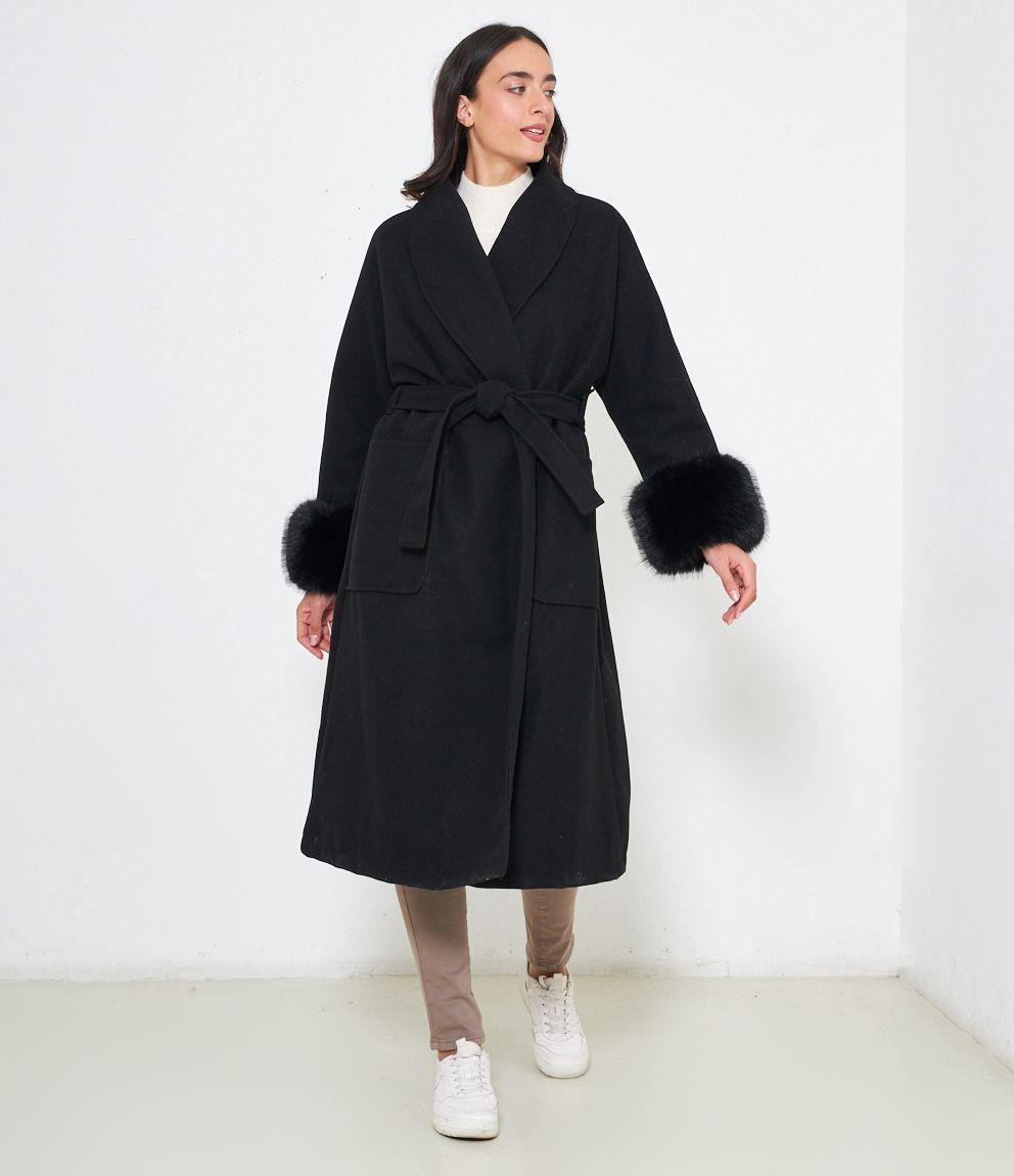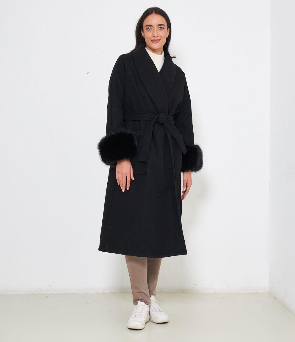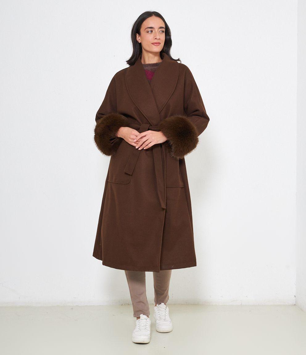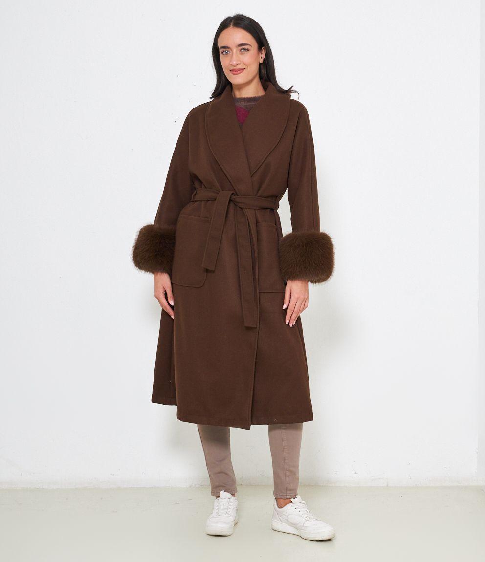 Cappotto lungo con manicotti in pelliccia rimovibili. Collo revers e chiusura con cintura. Tasche frontali.