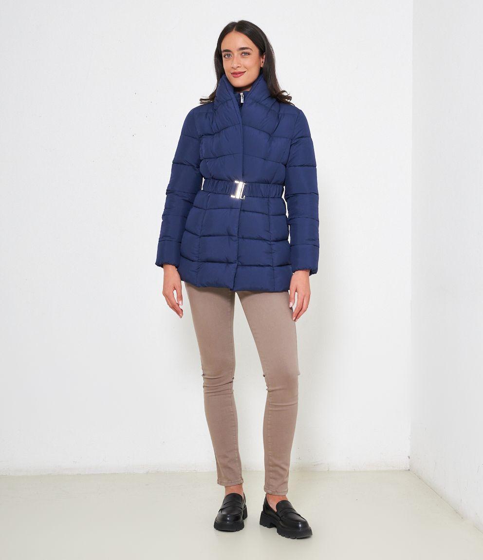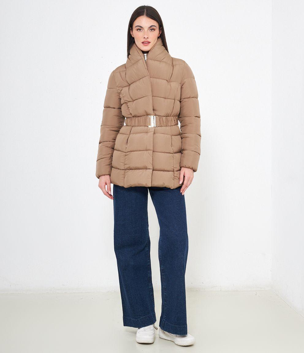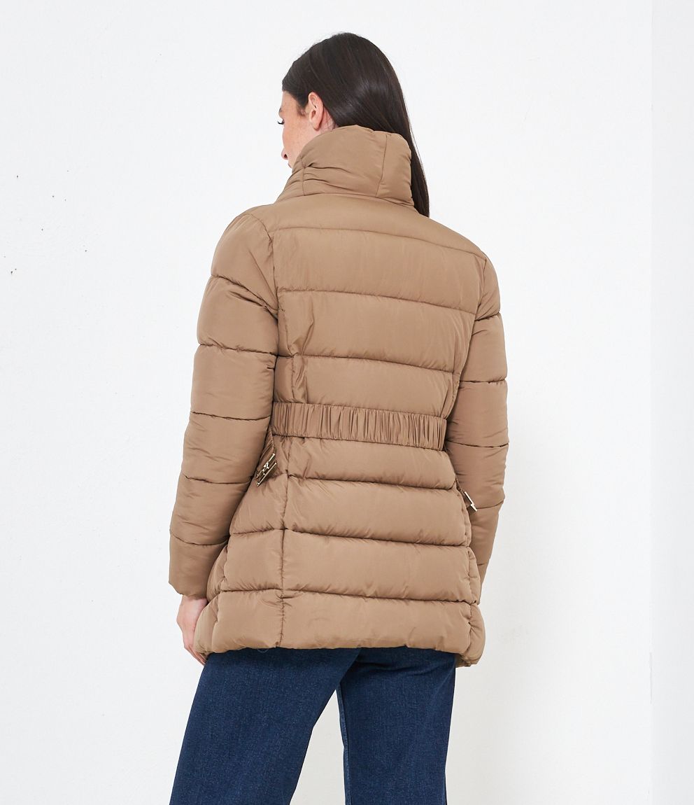 Piumino modello midi con collo revers, chiusura con zip e cintura elastica.