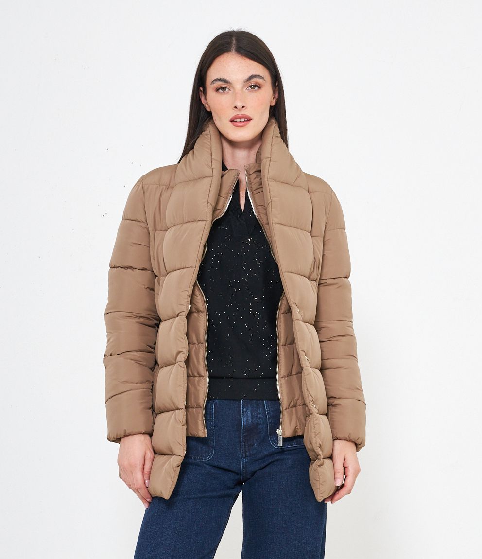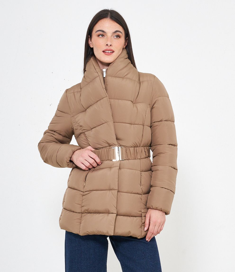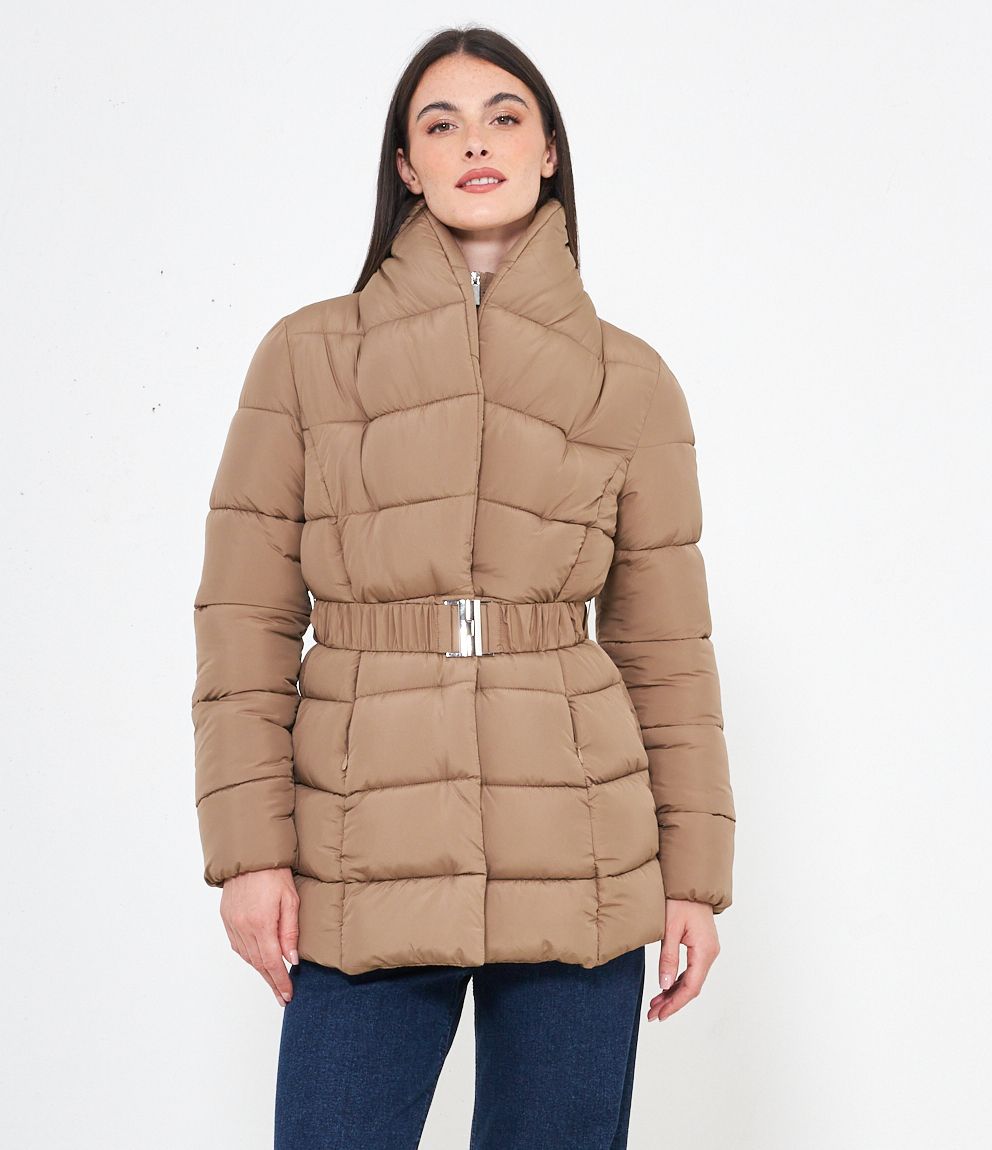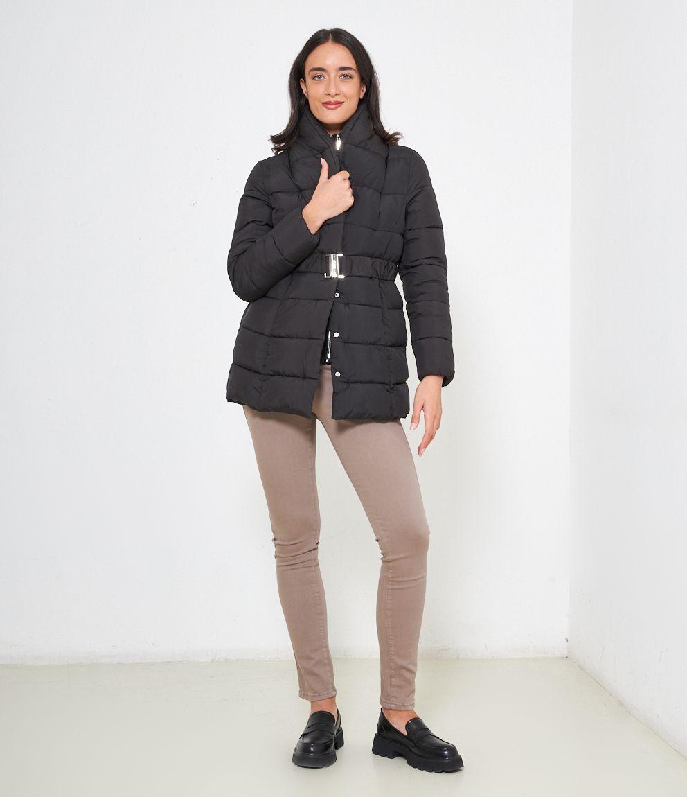 Piumino modello midi con collo revers, chiusura con zip e cintura elastica.