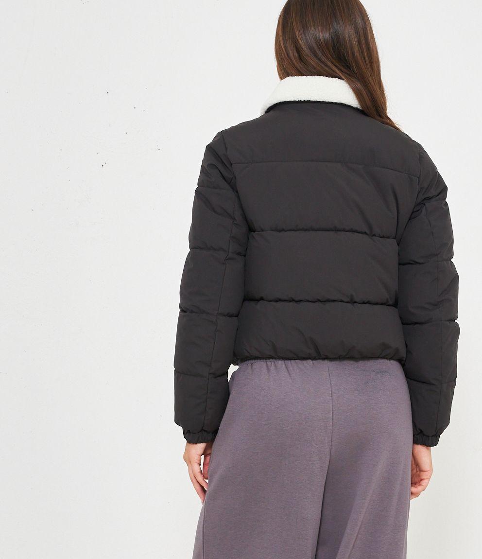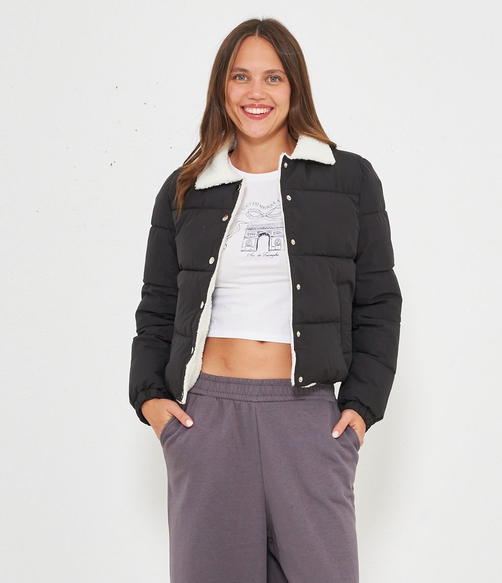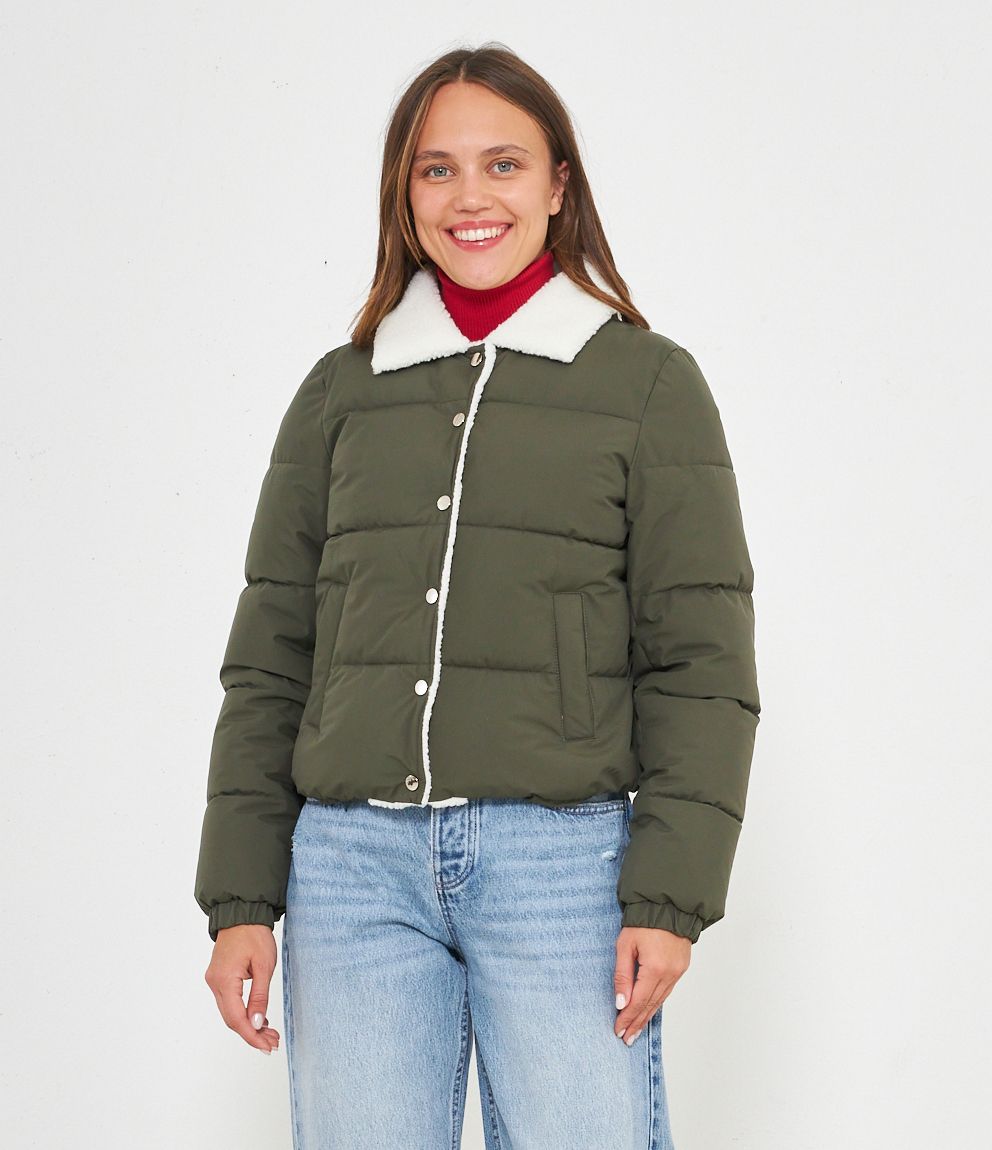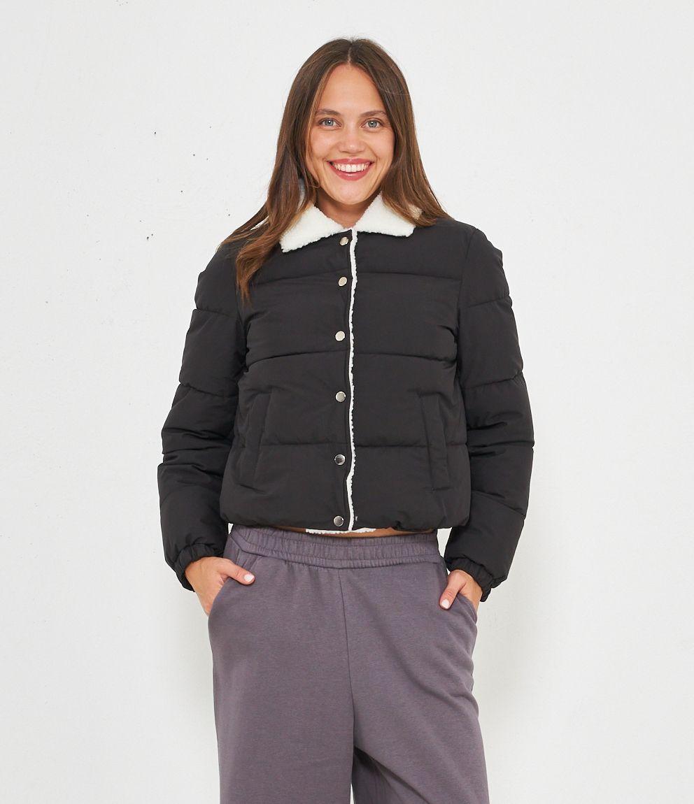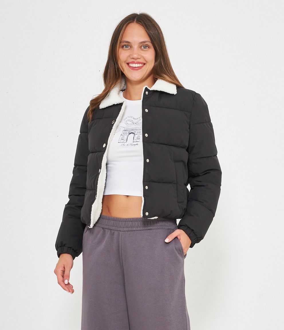 Piumino modello crop con impunture a vista, tasche laterali a filetto e chiusura con bottoni a scatto. Risvolti in teddy.