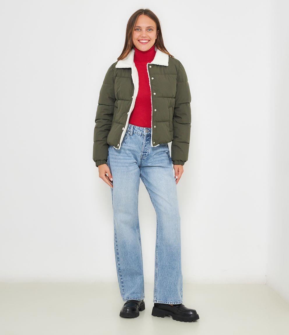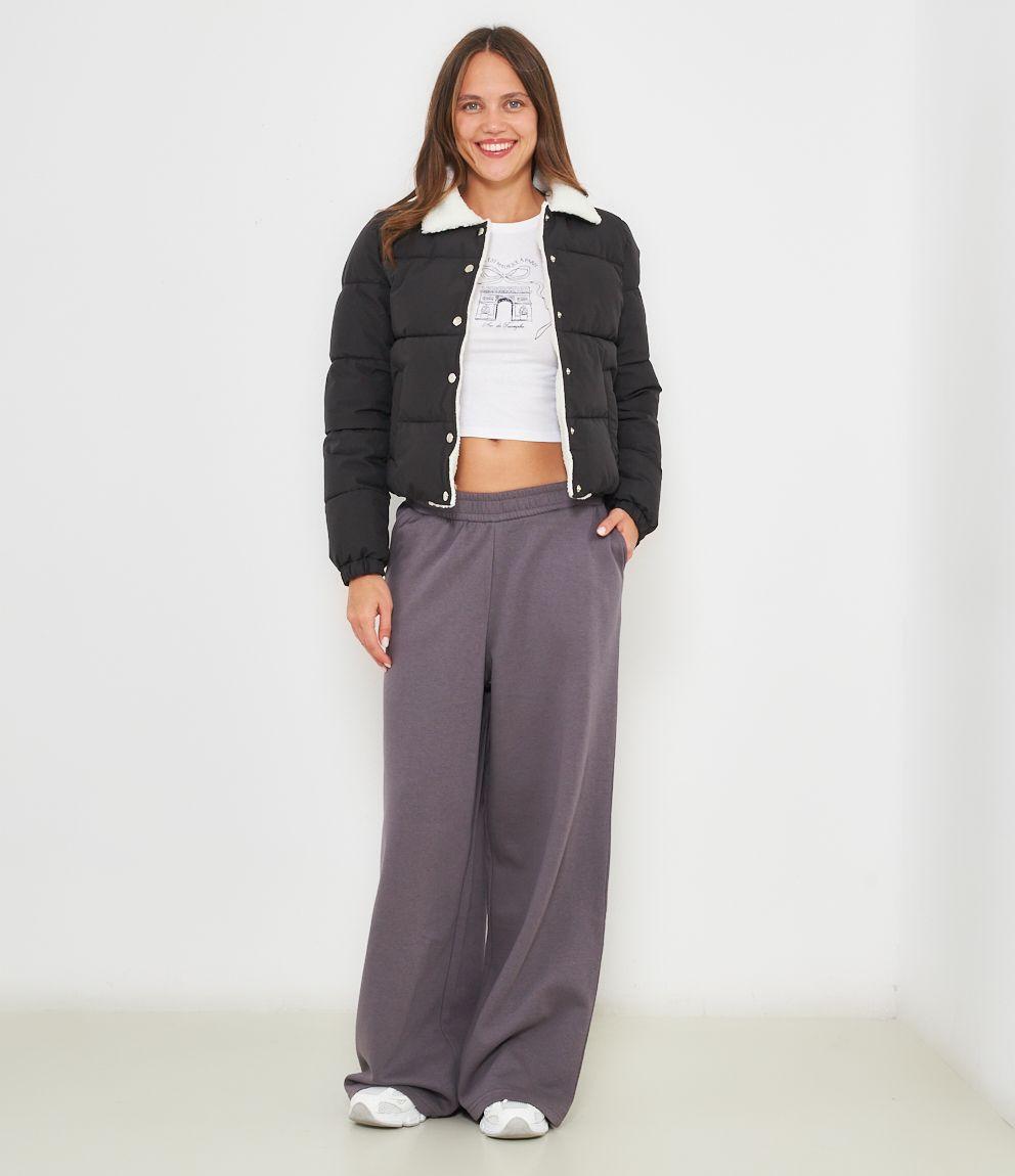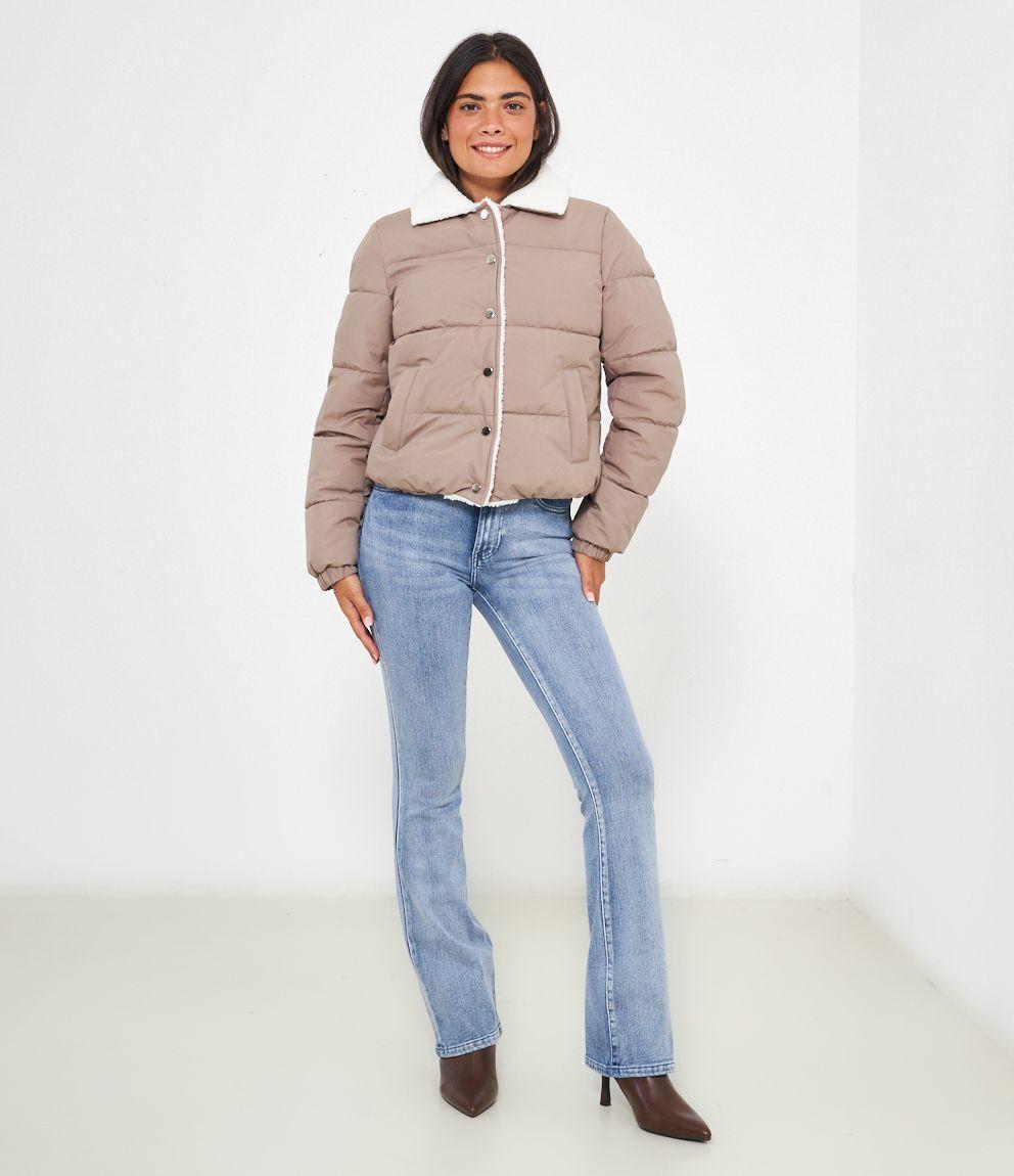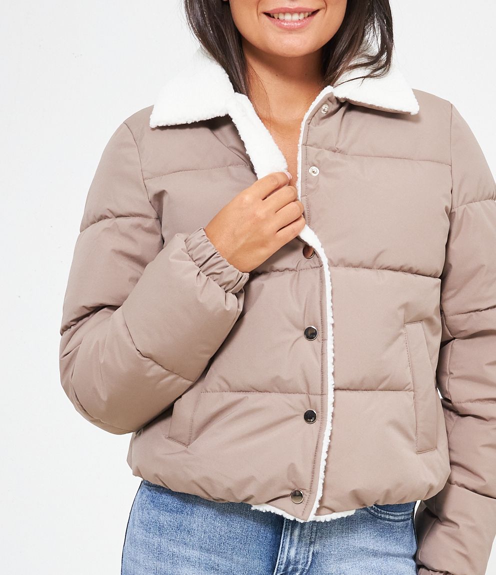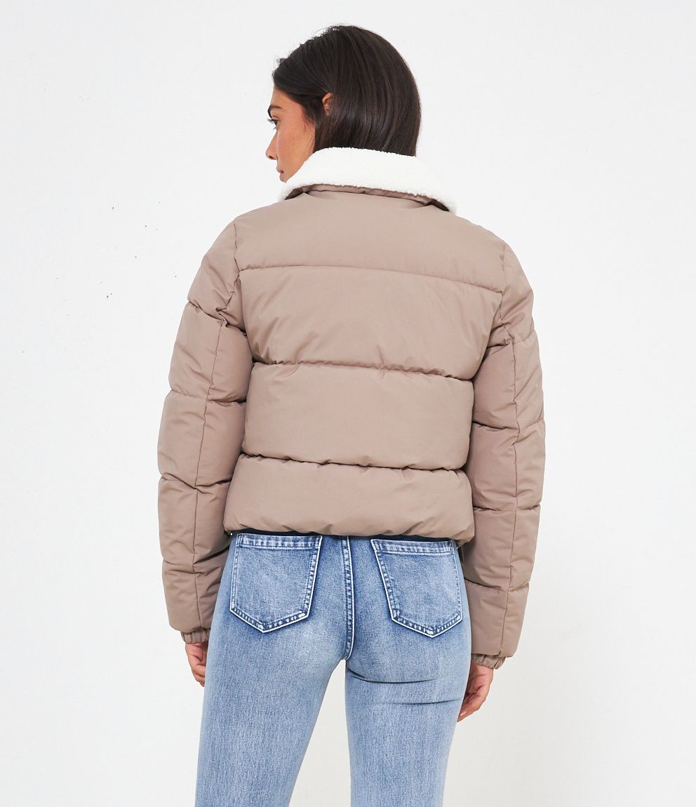 Piumino modello crop con impunture a vista, tasche laterali a filetto e chiusura con bottoni a scatto. Risvolti in teddy.