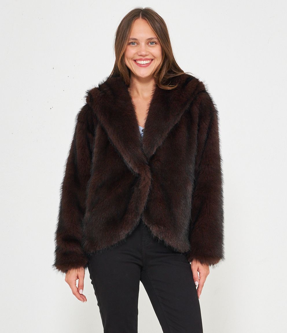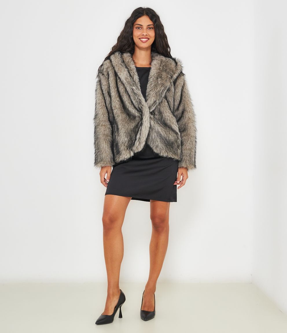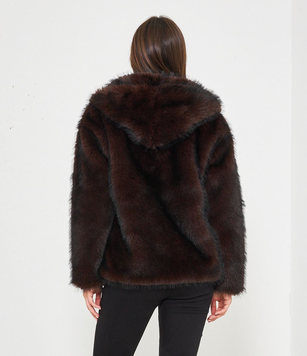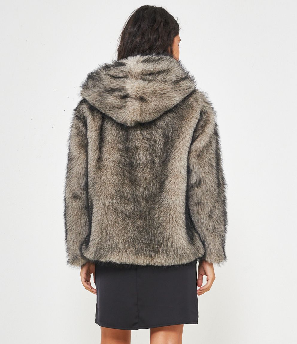 Pelliccia modello over con cappuccio e chiusura con bottone centrale.