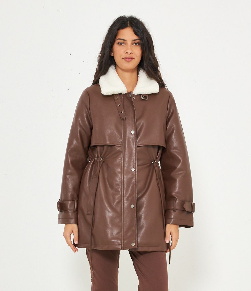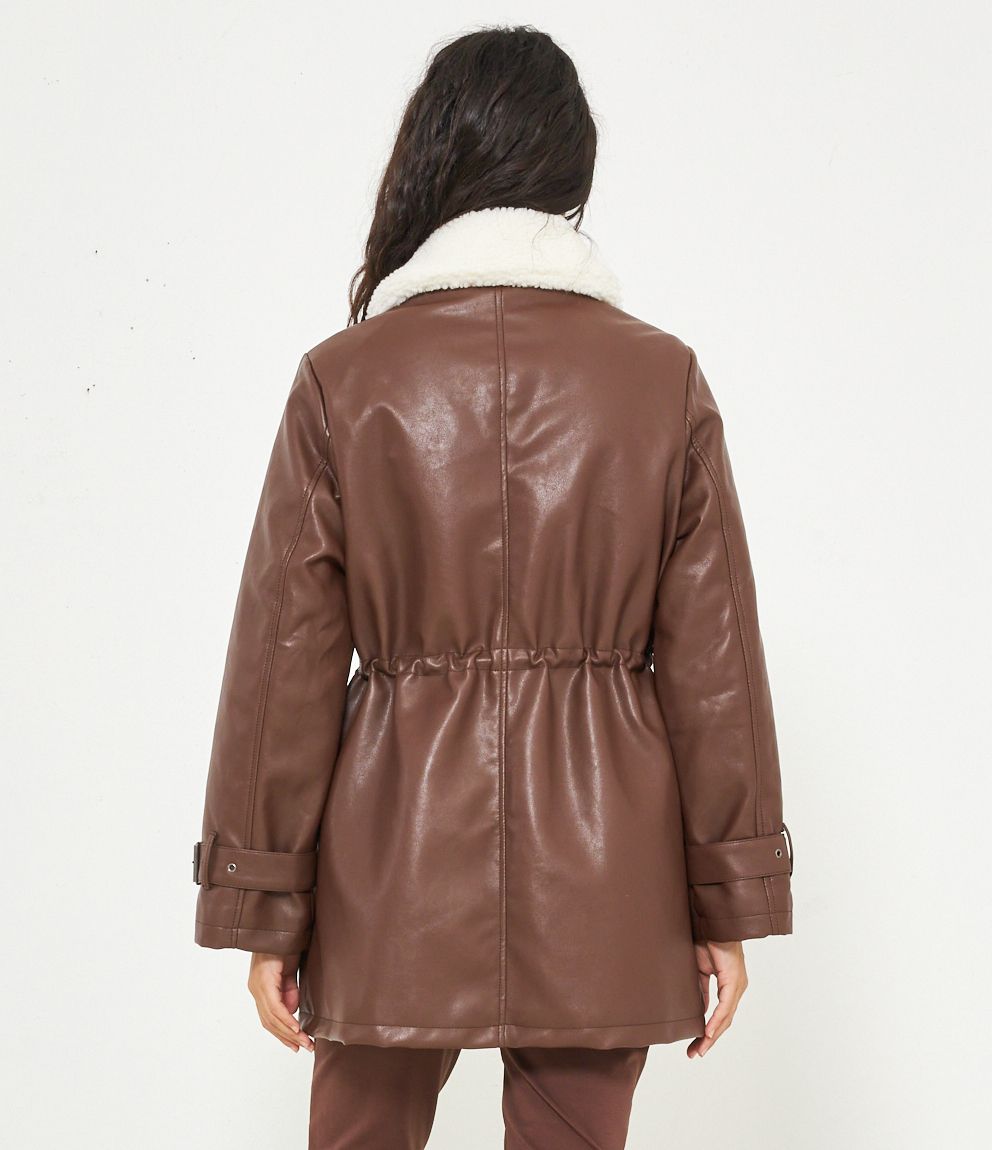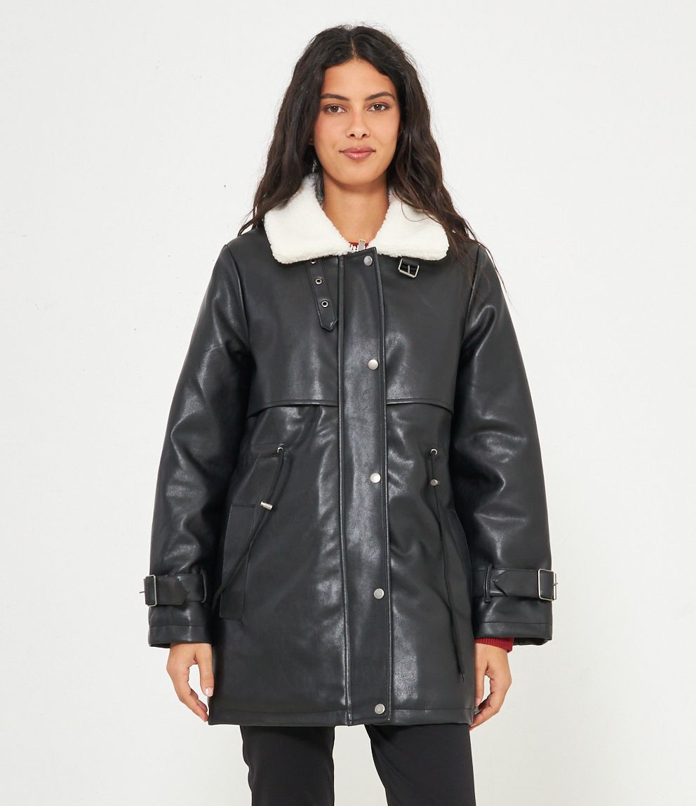 Parka effetto pelle con collo in teddy, coulisse laterali regolabili e tasche. Chiusura con zip e bottoni.