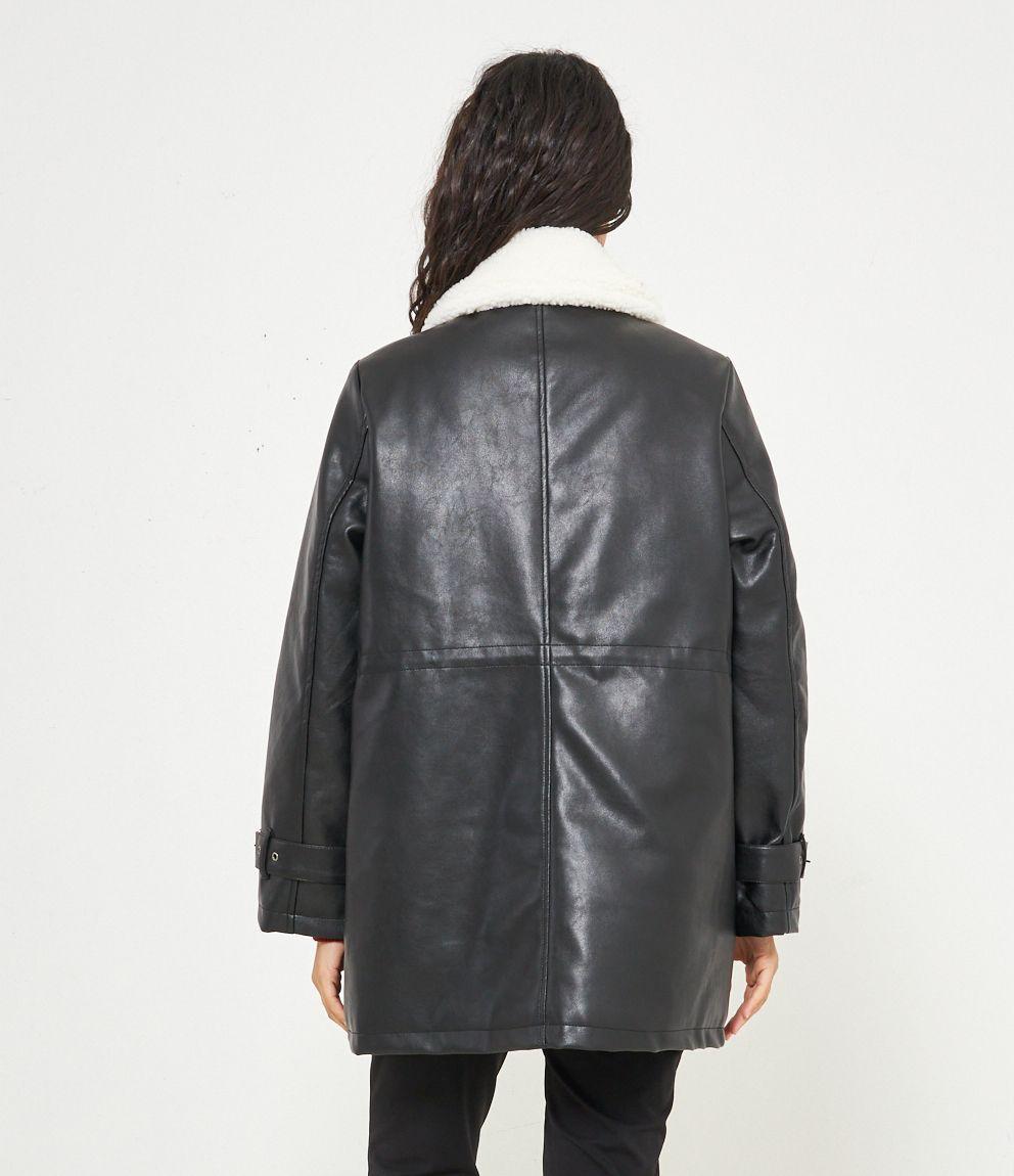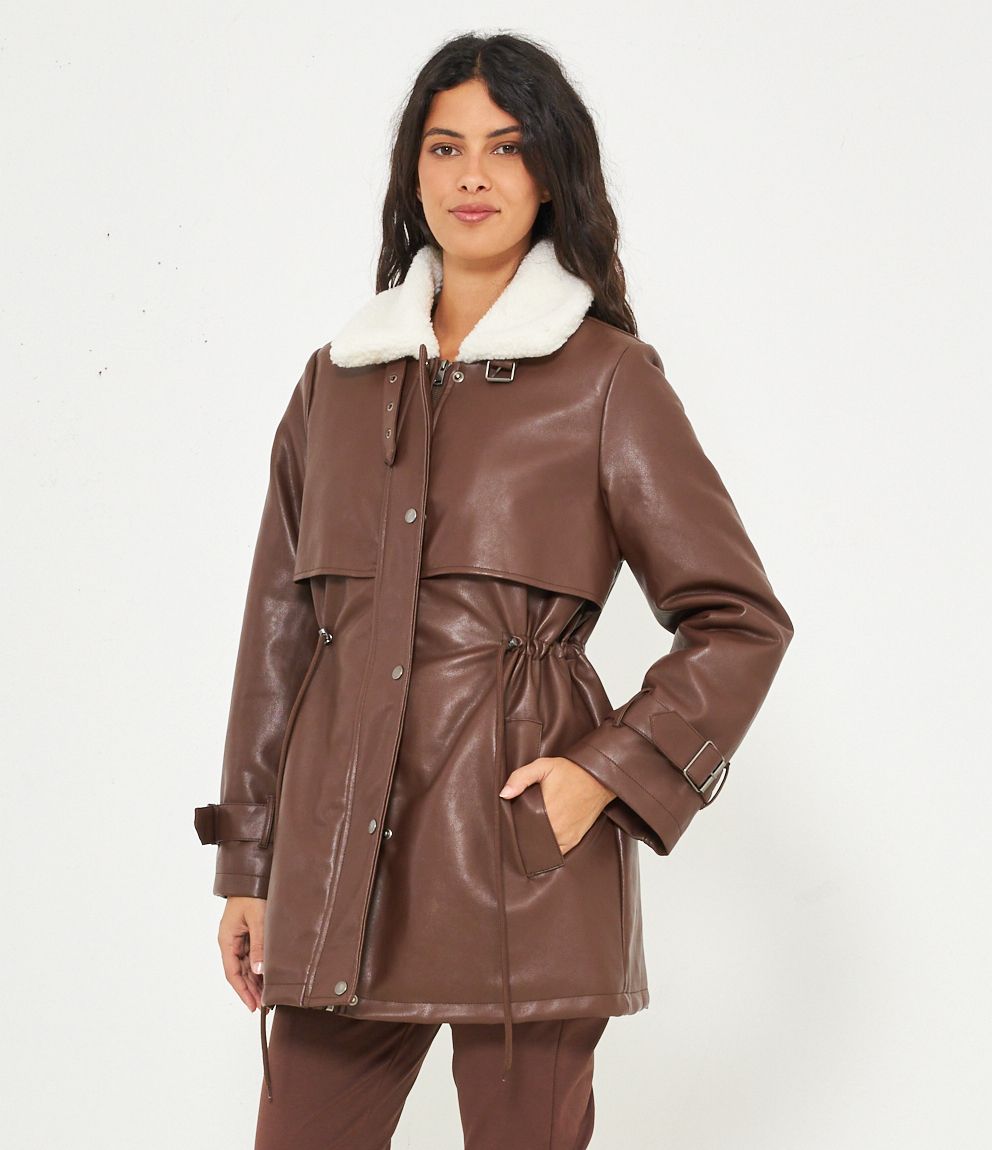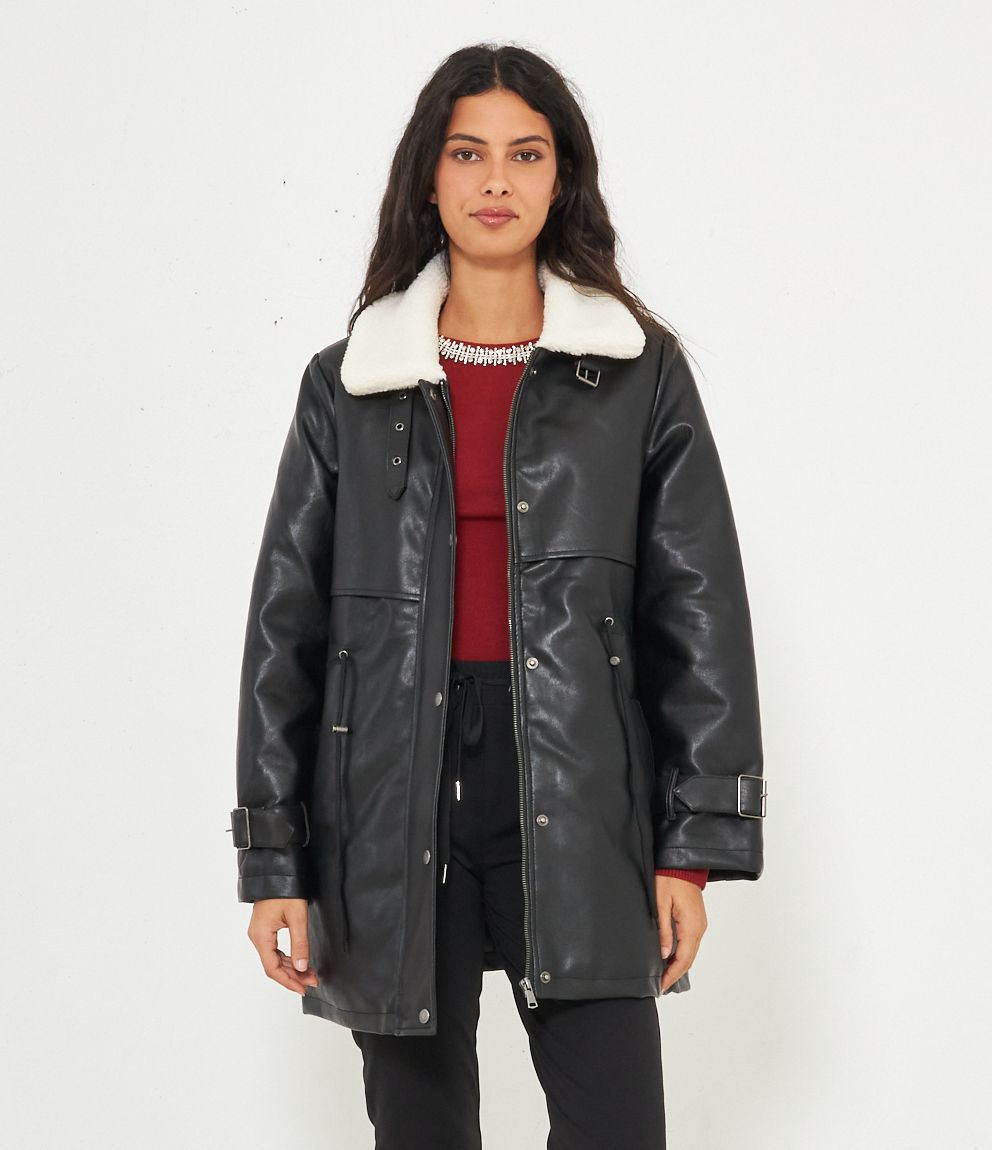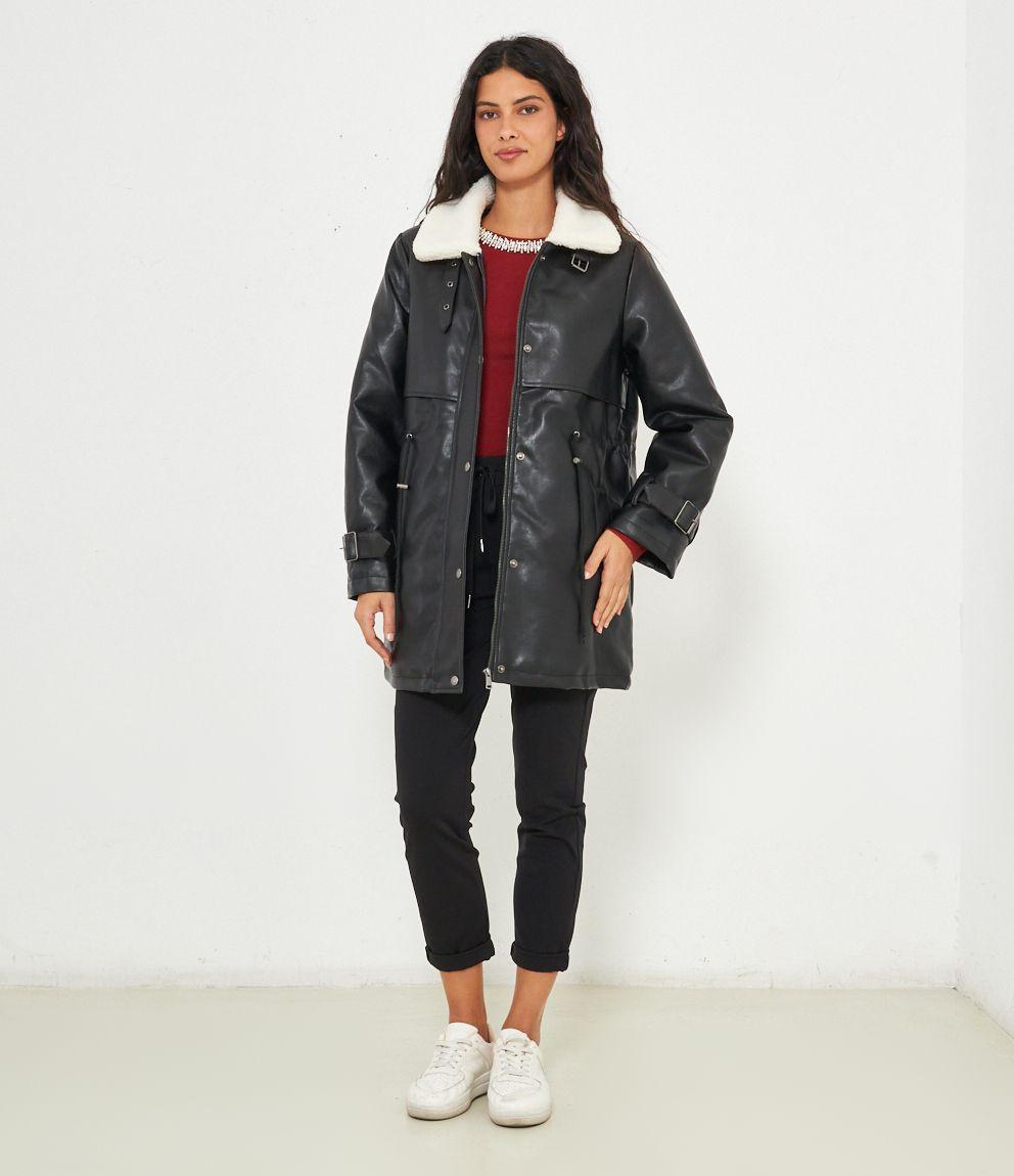 Parka effetto pelle con collo in teddy, coulisse laterali regolabili e tasche. Chiusura con zip e bottoni.