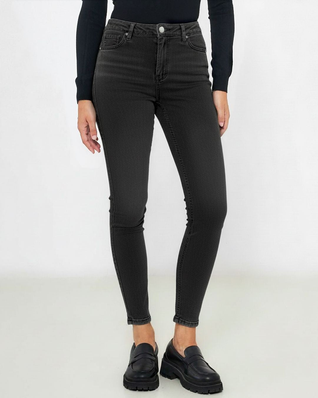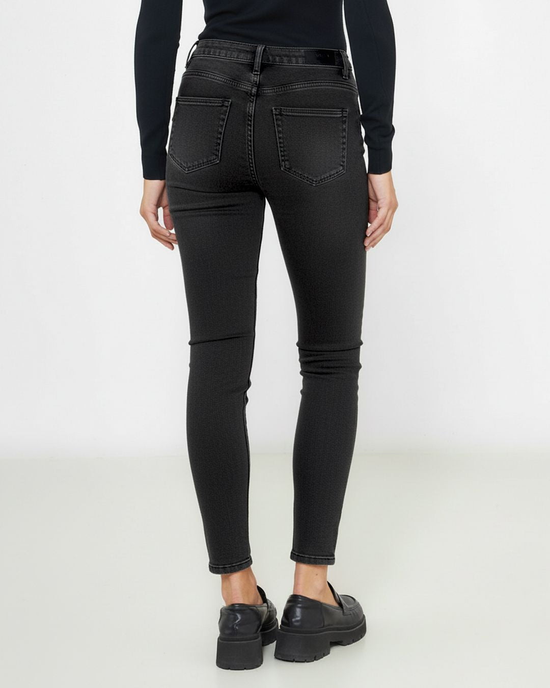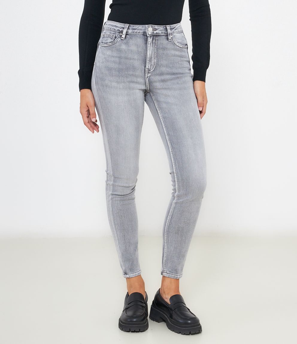 Jeans modello push up con cinque tasche e chiusura con zip e bottone.