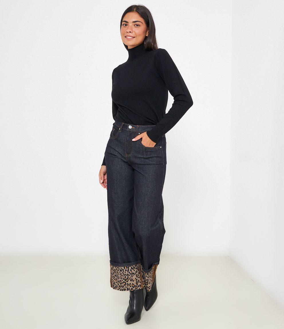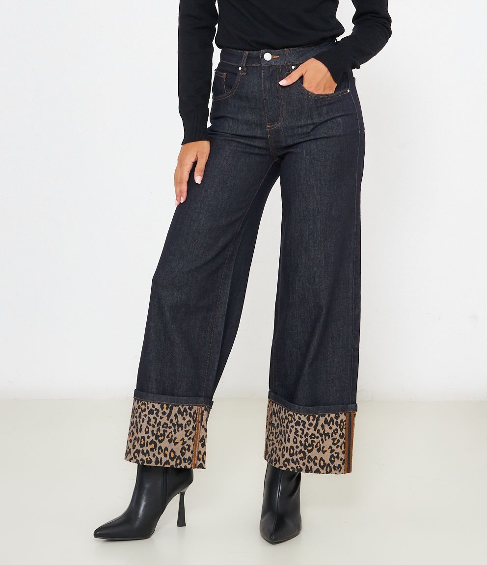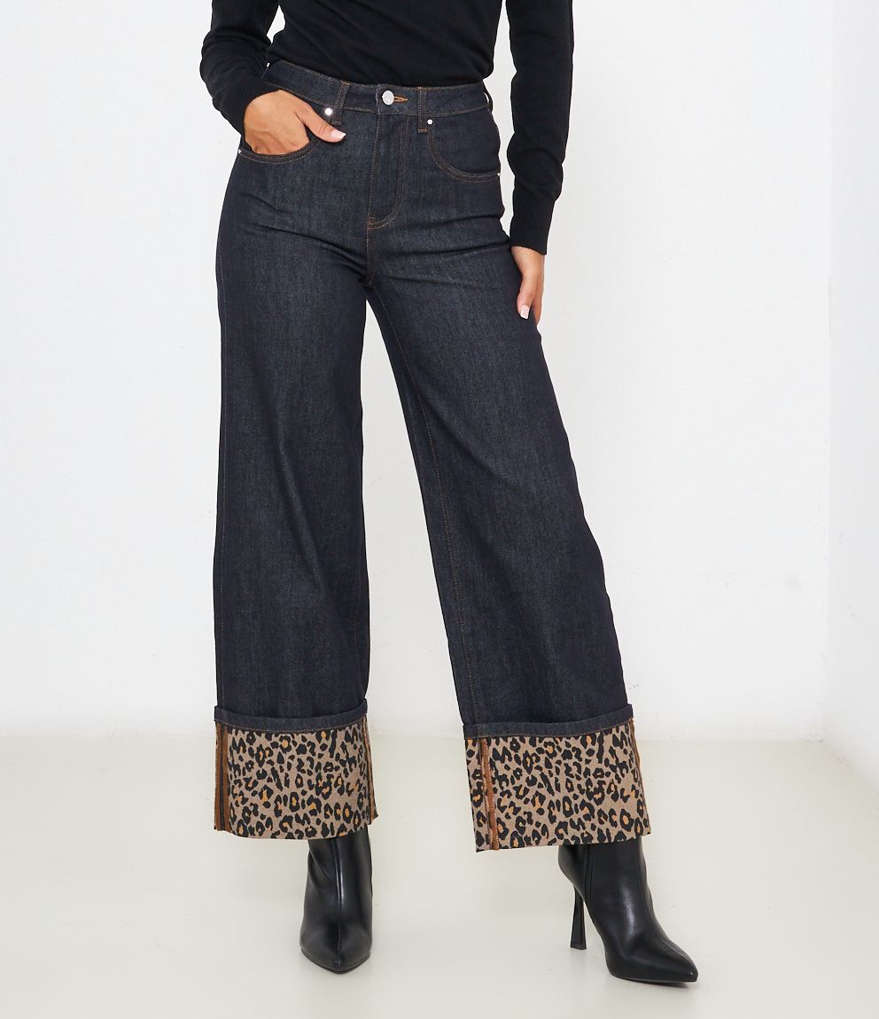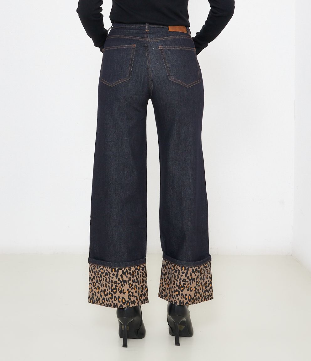 Jeans modello straight con risvolto alto sul fondo a fantasia animalier. Cinque tasche e chiusura con zip e bottone.