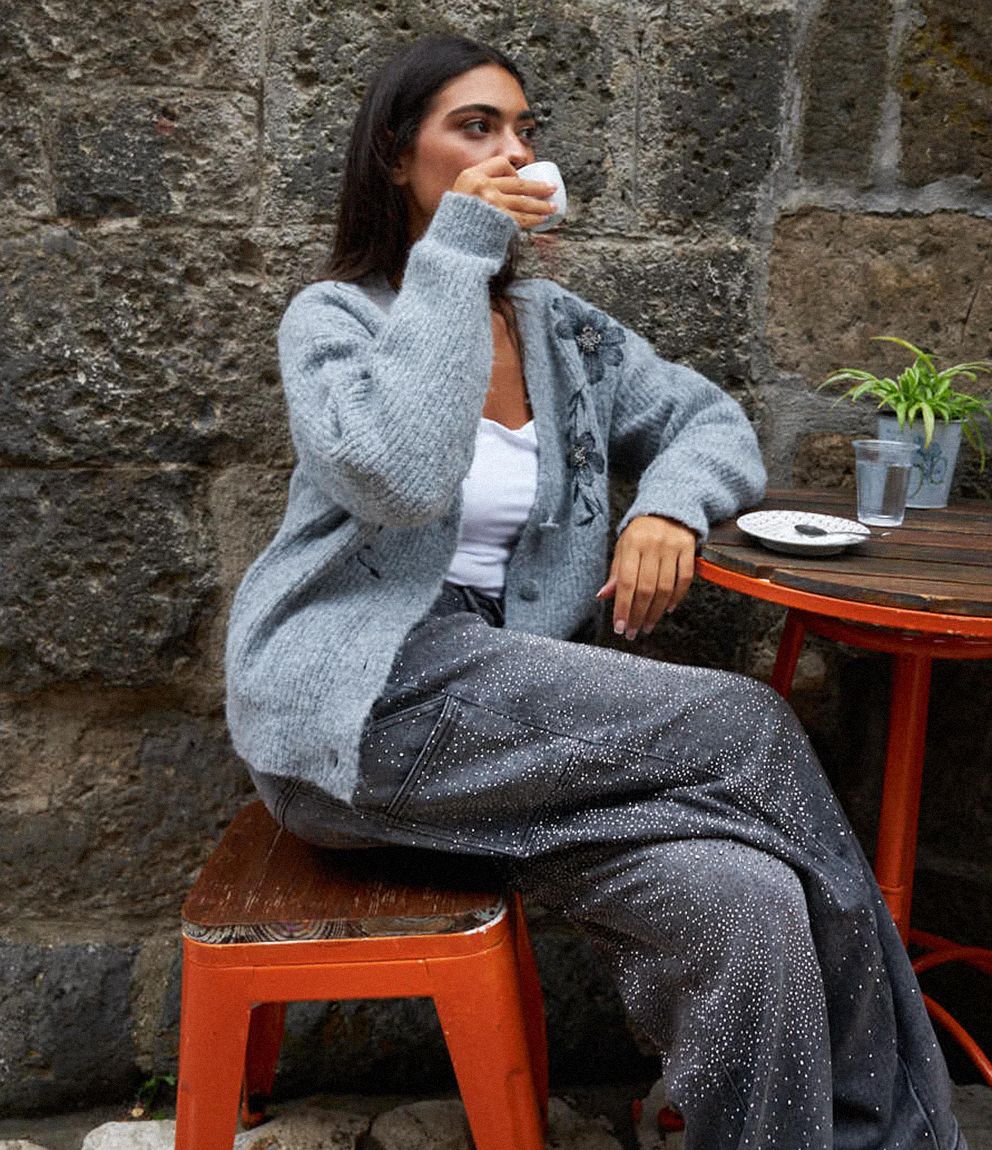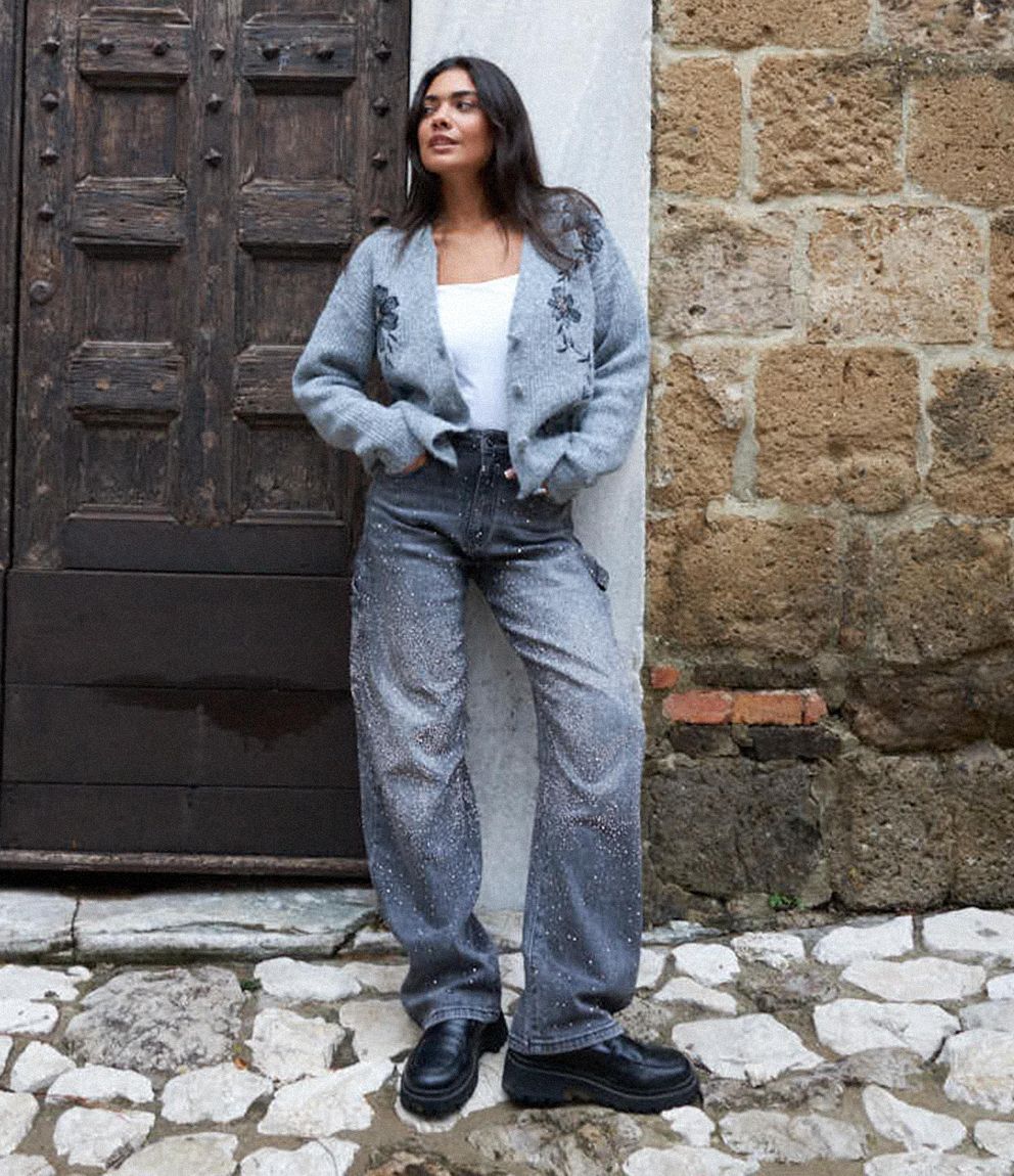 Jeans modello mom fit con tasconi laterali, strass applicati e chiusura con zip e bottone.