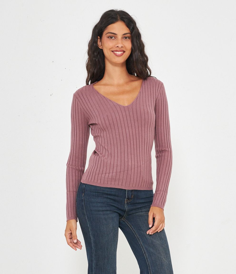 Maglia in viscosa a costine, modello slim fit con scollo a v.