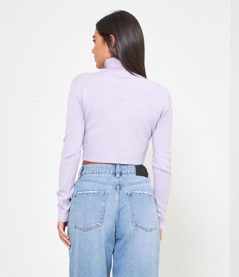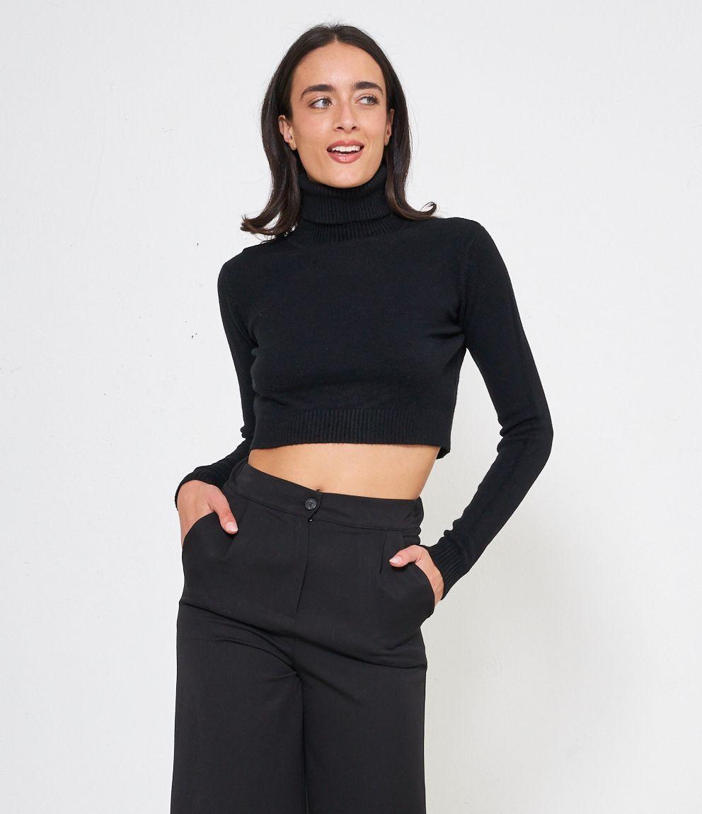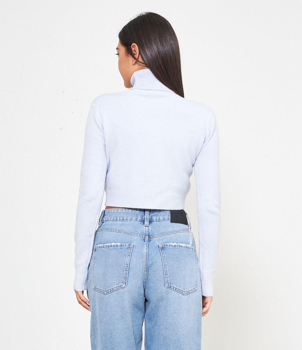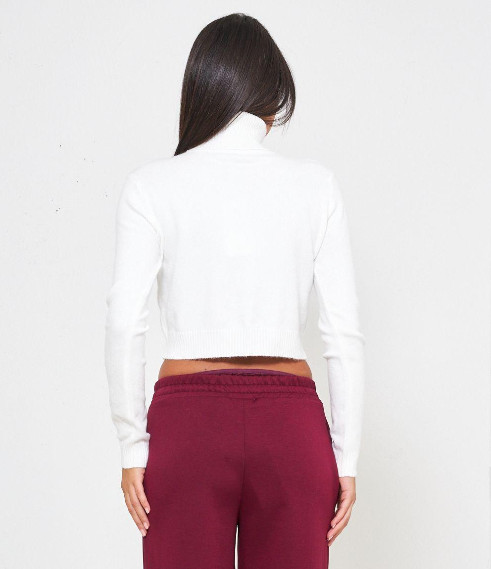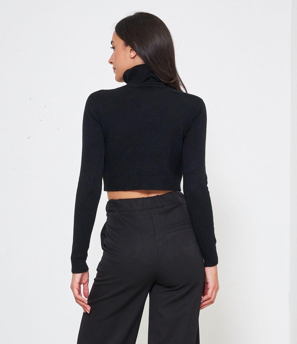 Maglia modello crop a collo alto con risvolto e bordi a costine.
