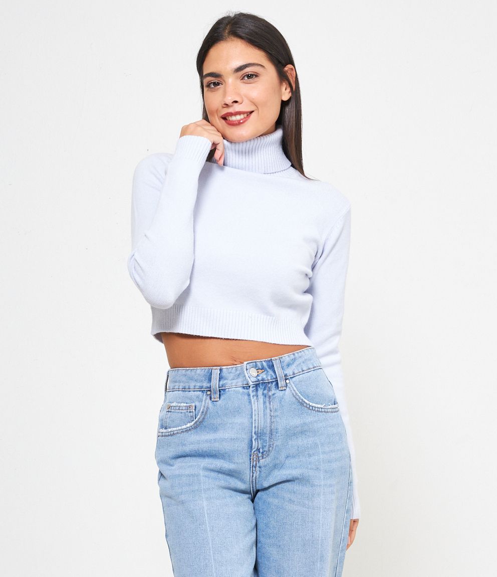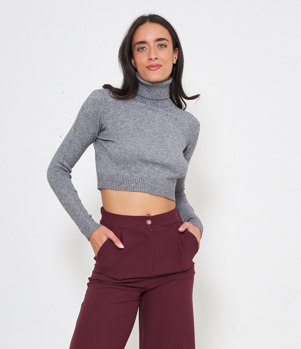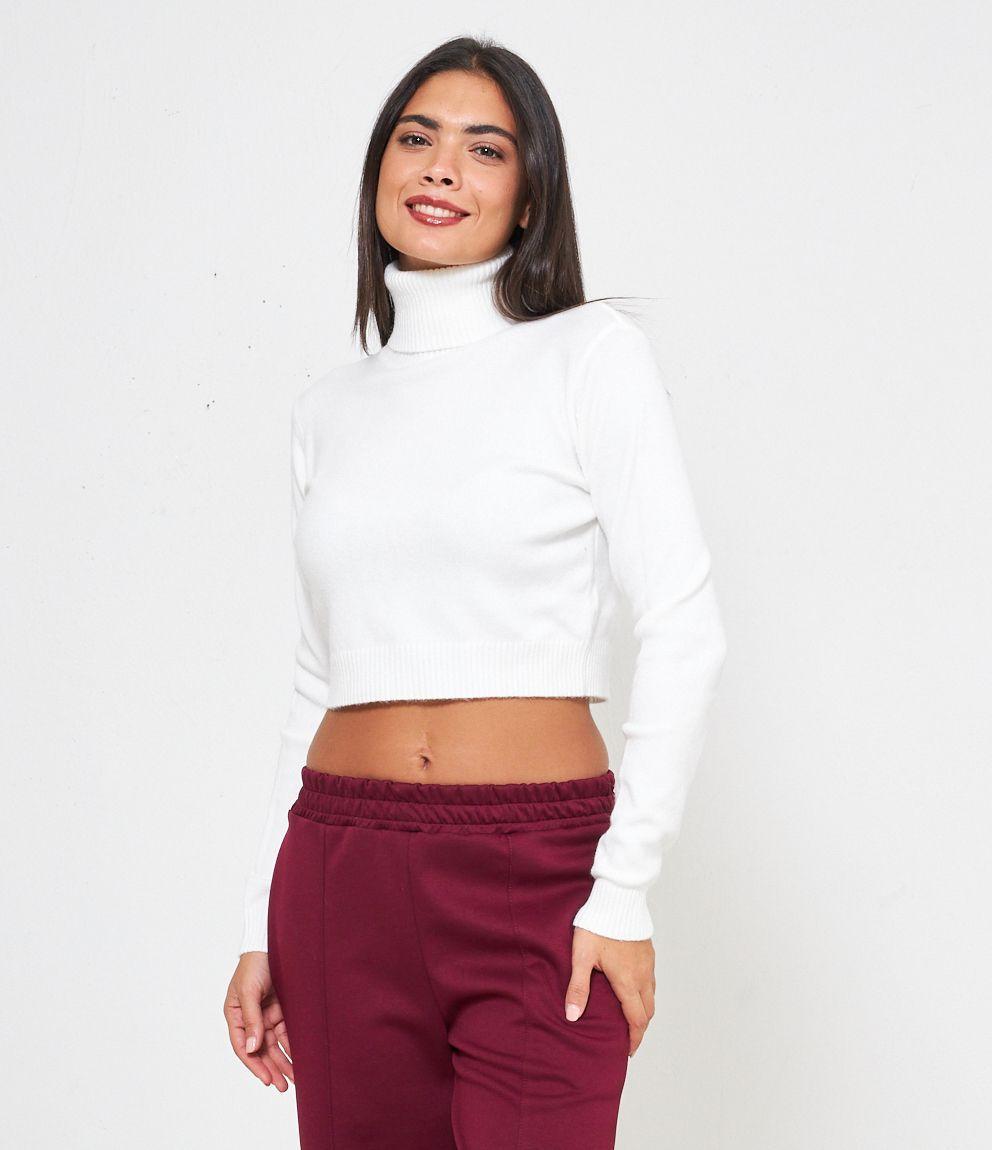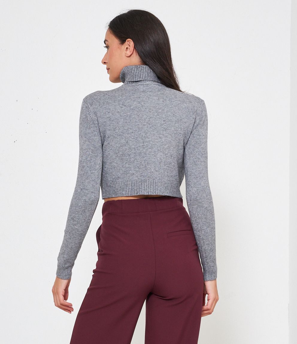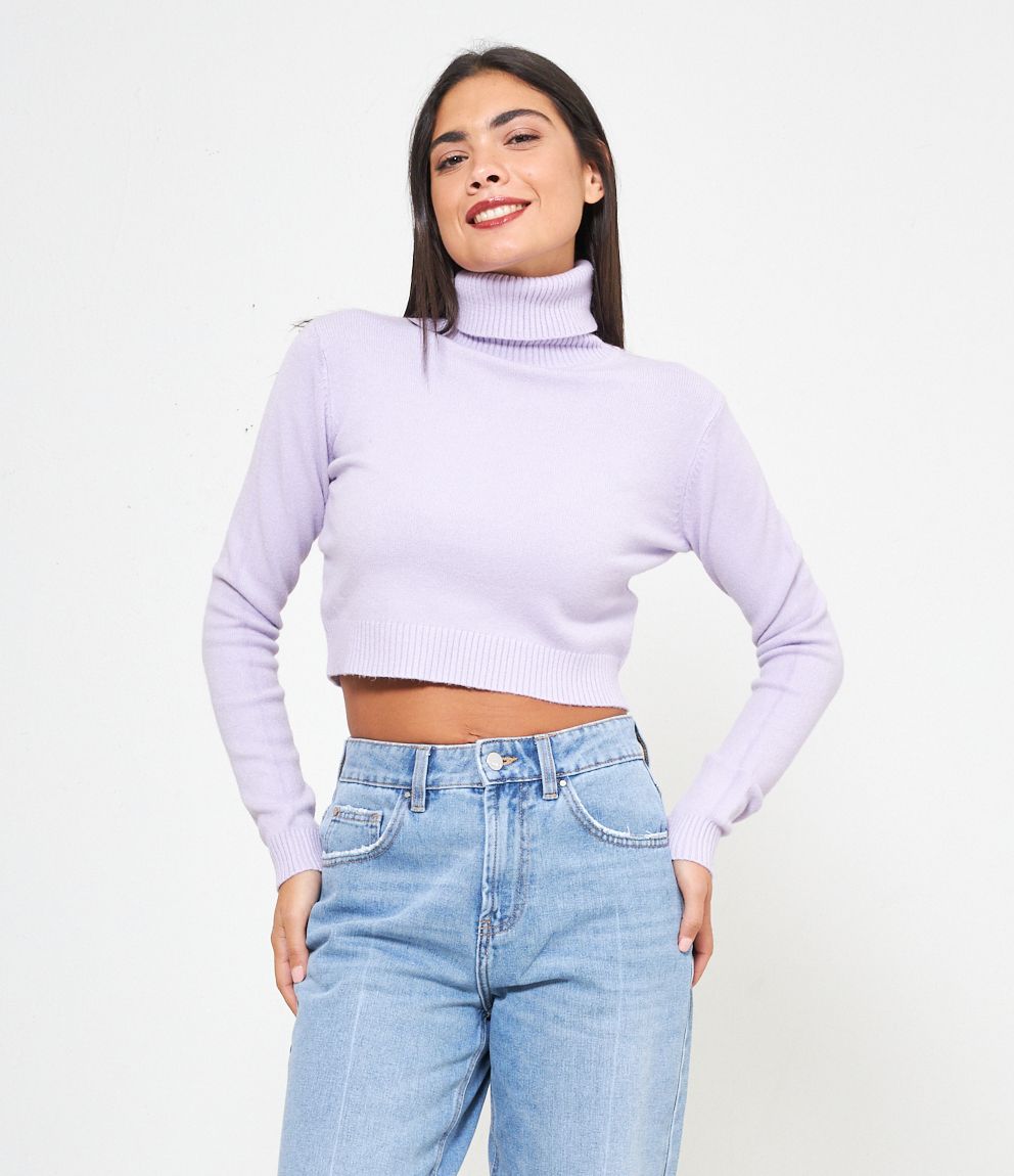 Maglia modello crop a collo alto con risvolto e bordi a costine.