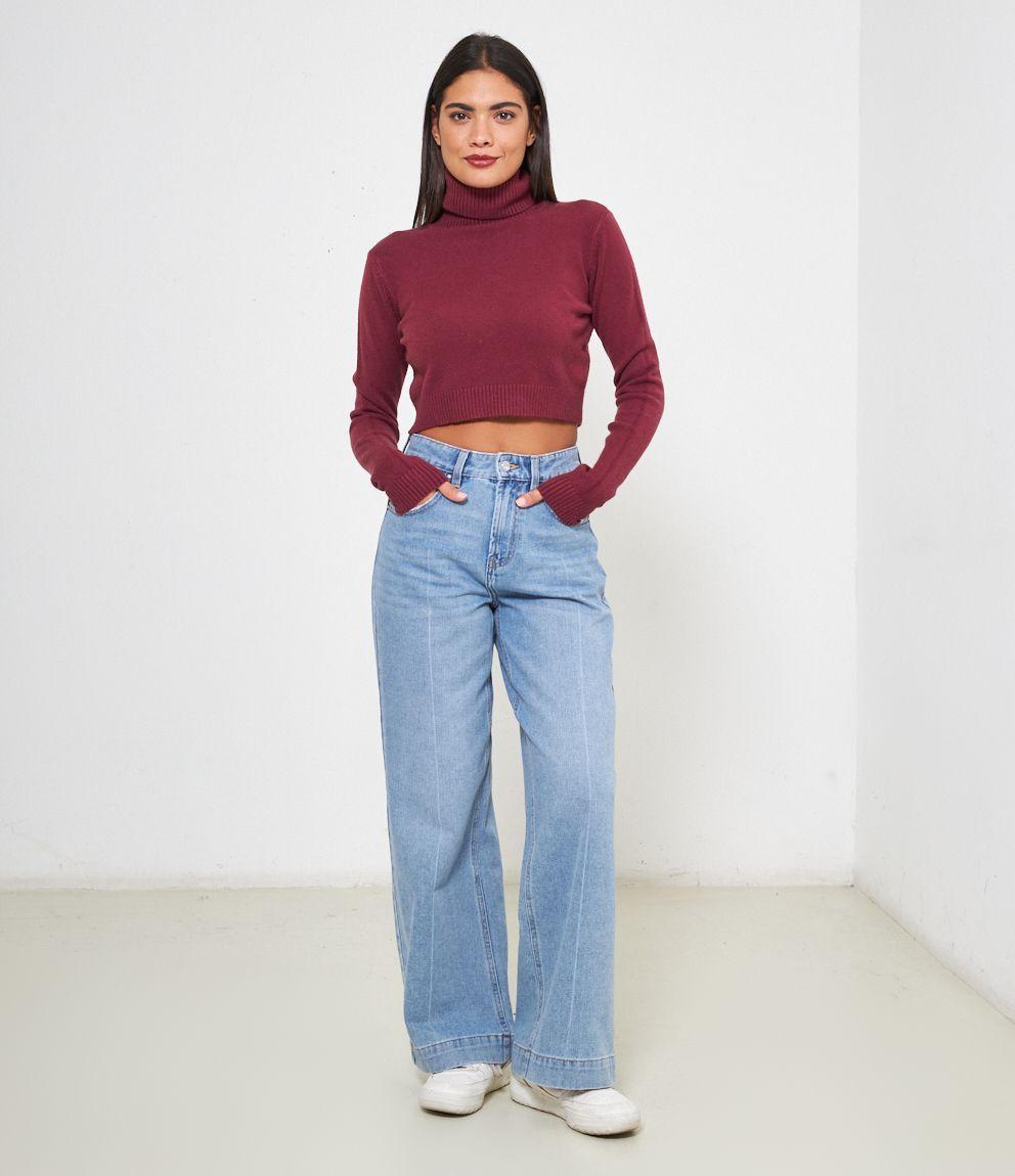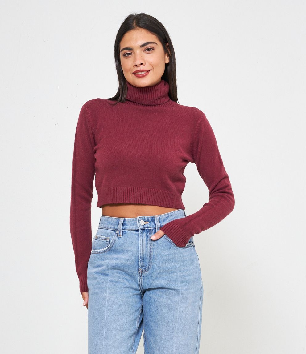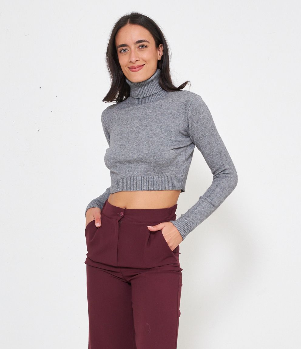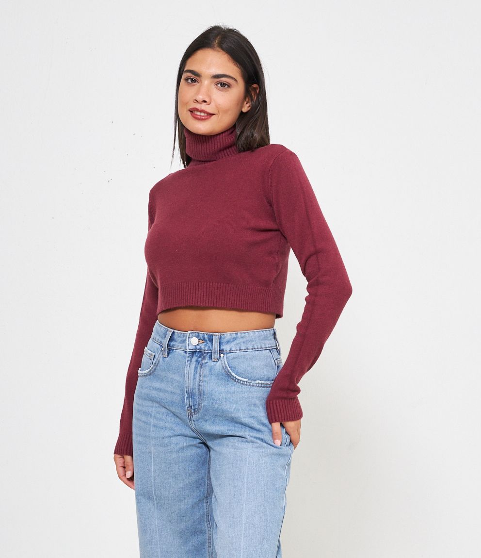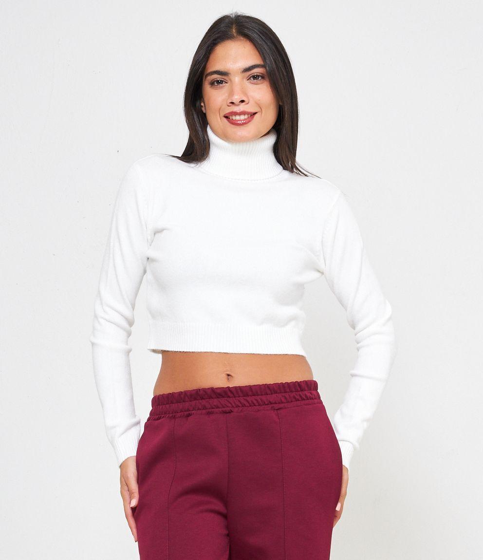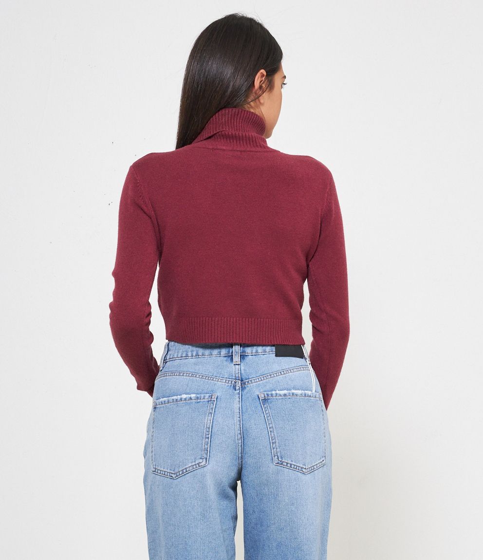 Maglia modello crop a collo alto con risvolto e bordi a costine.