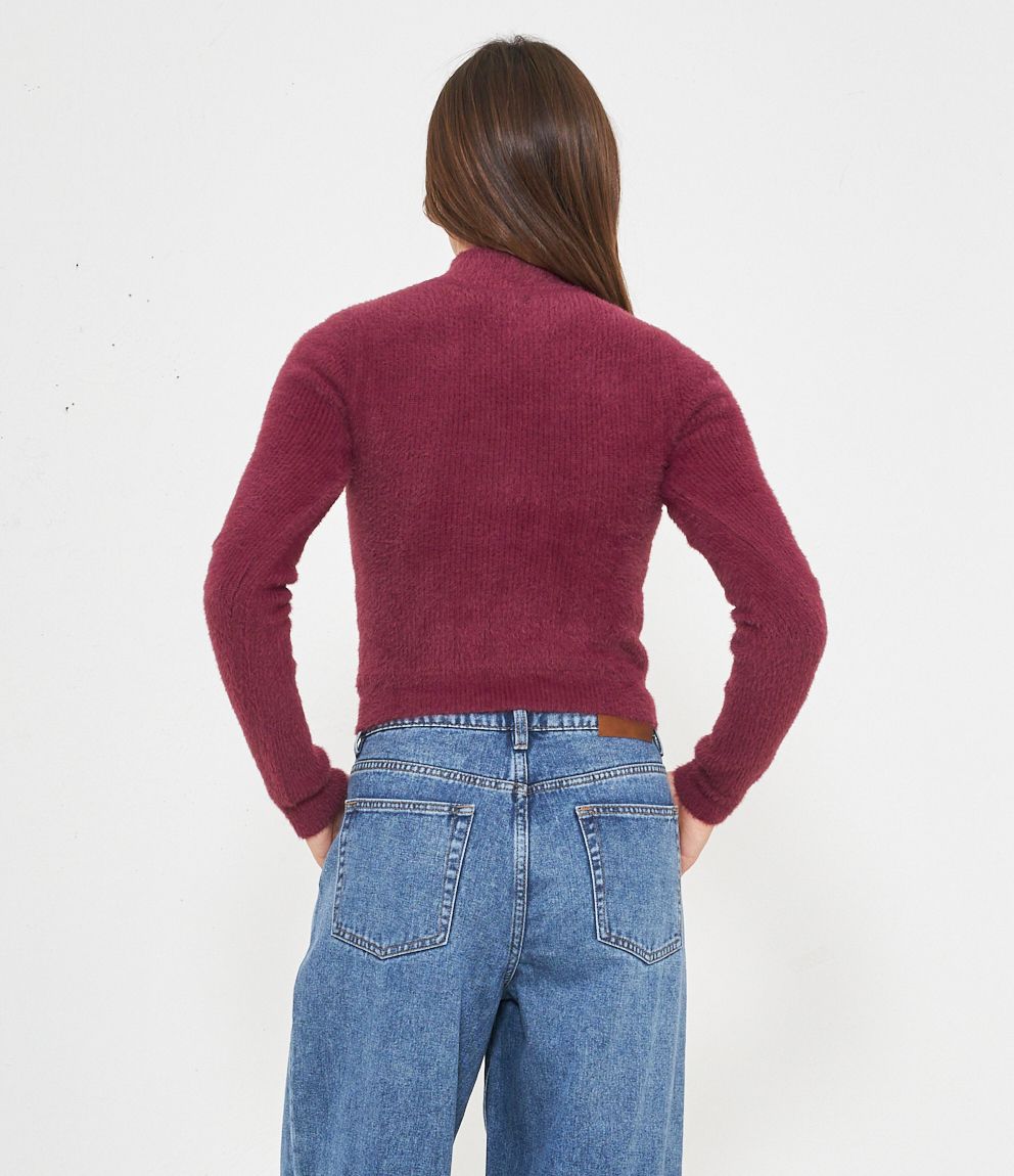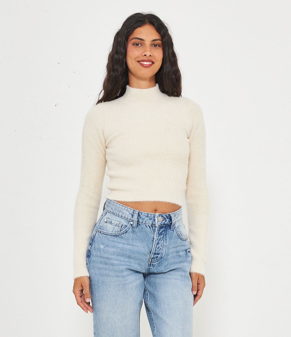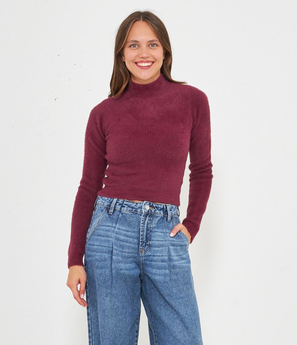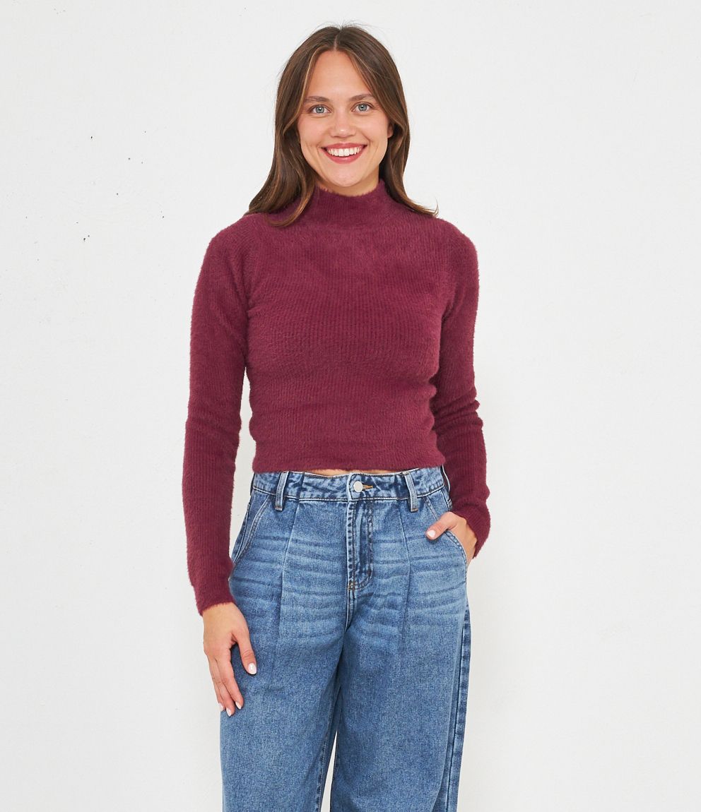 Maglia effetto peluche modello crop con mezzo collo.
