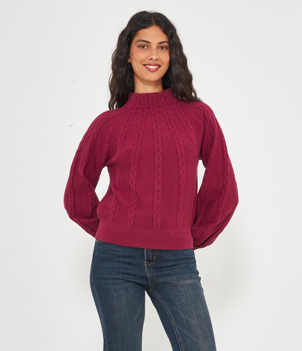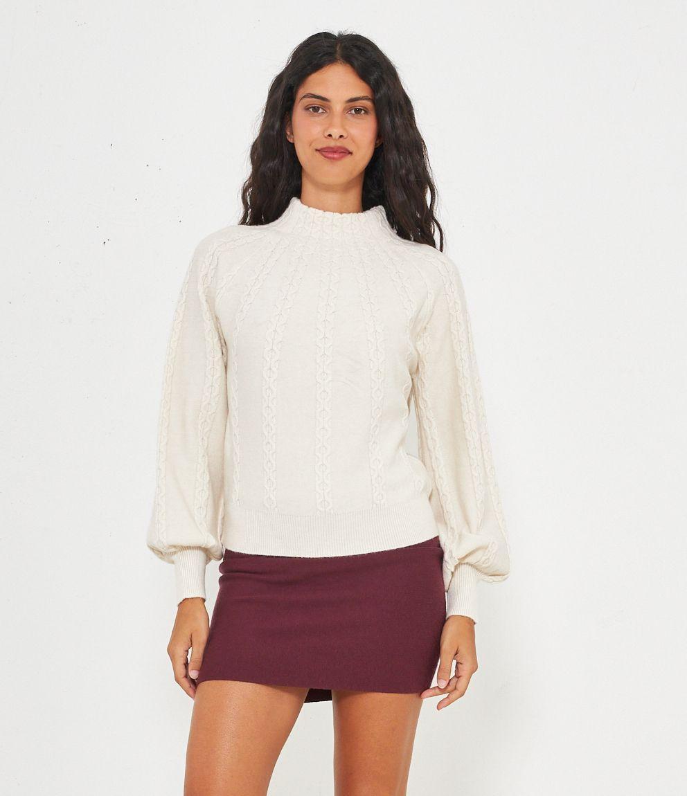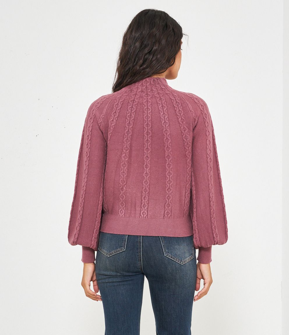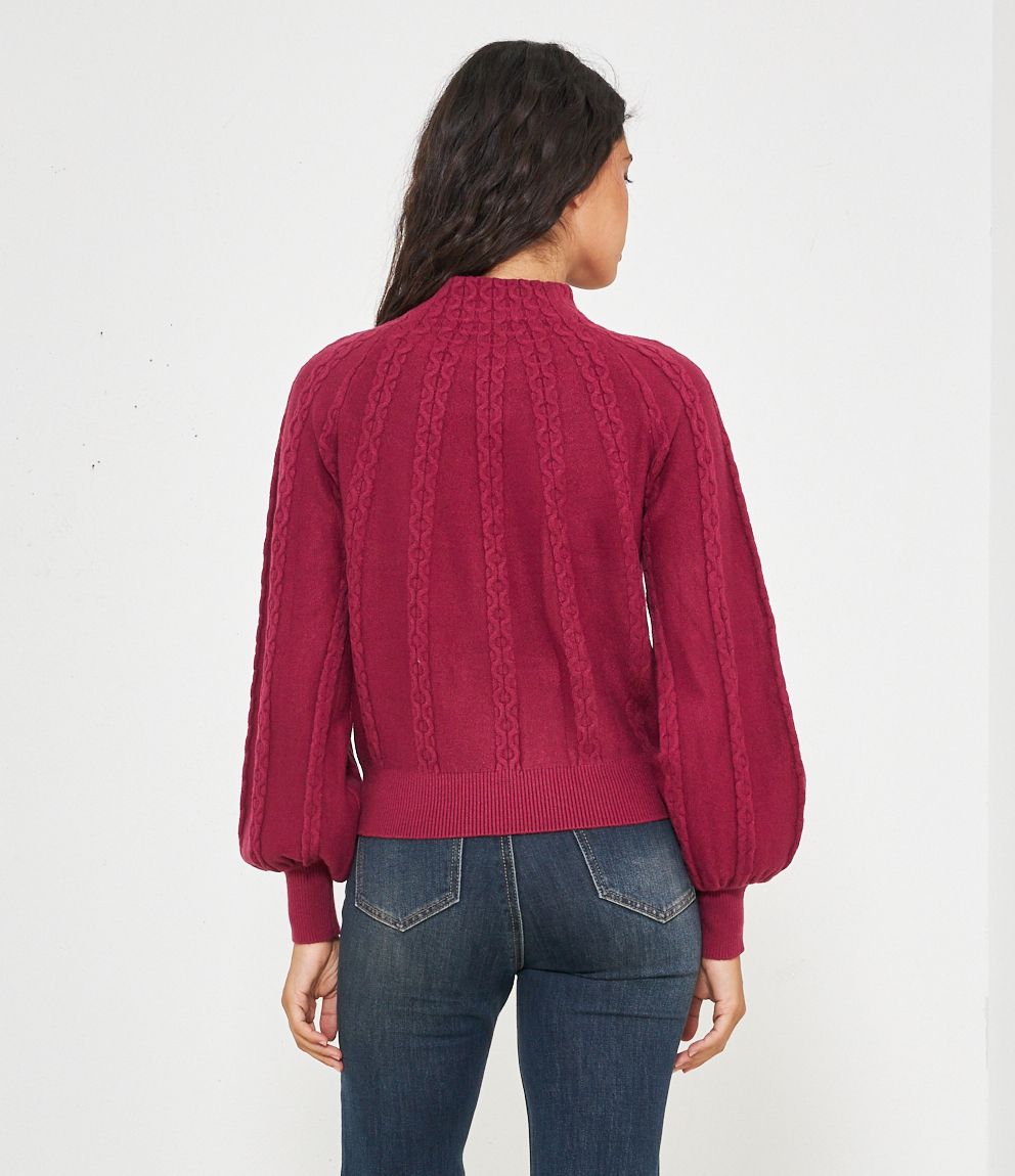 Maglia lavorata con mezzo collo e maniche con fondo elastico a costine.