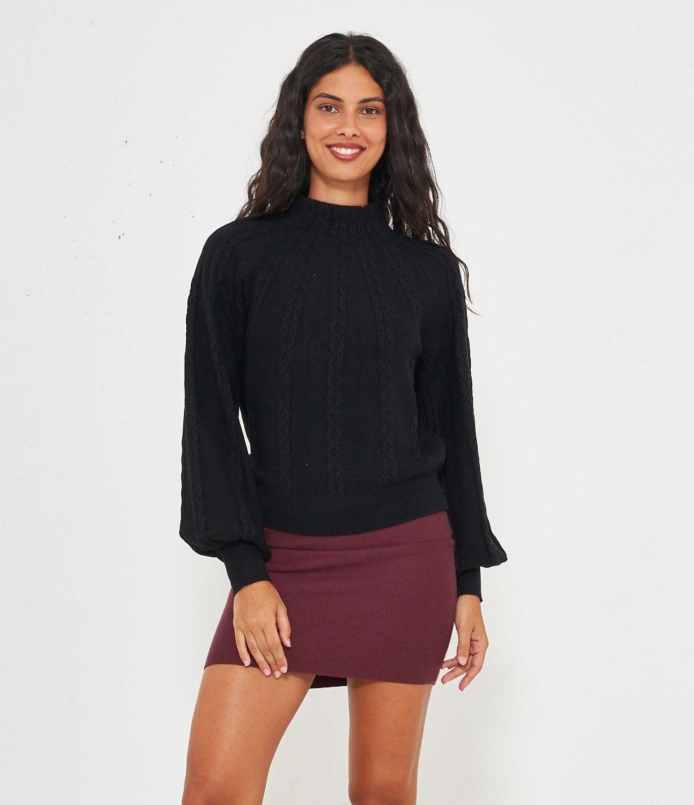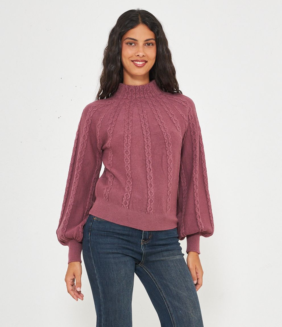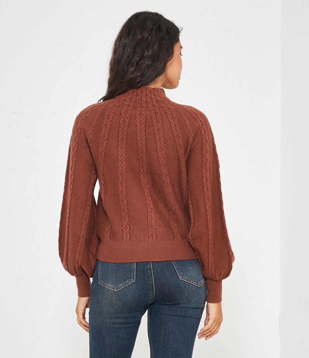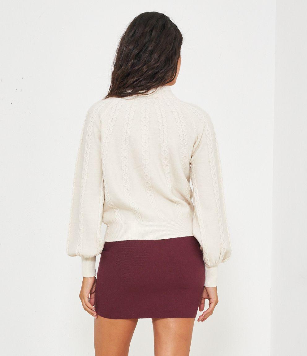 Maglia lavorata con mezzo collo e maniche con fondo elastico a costine.