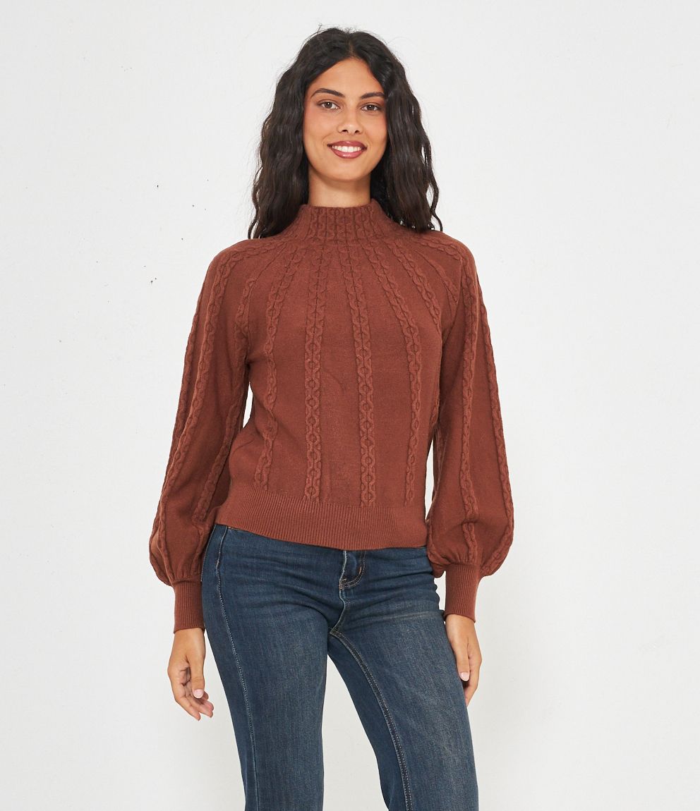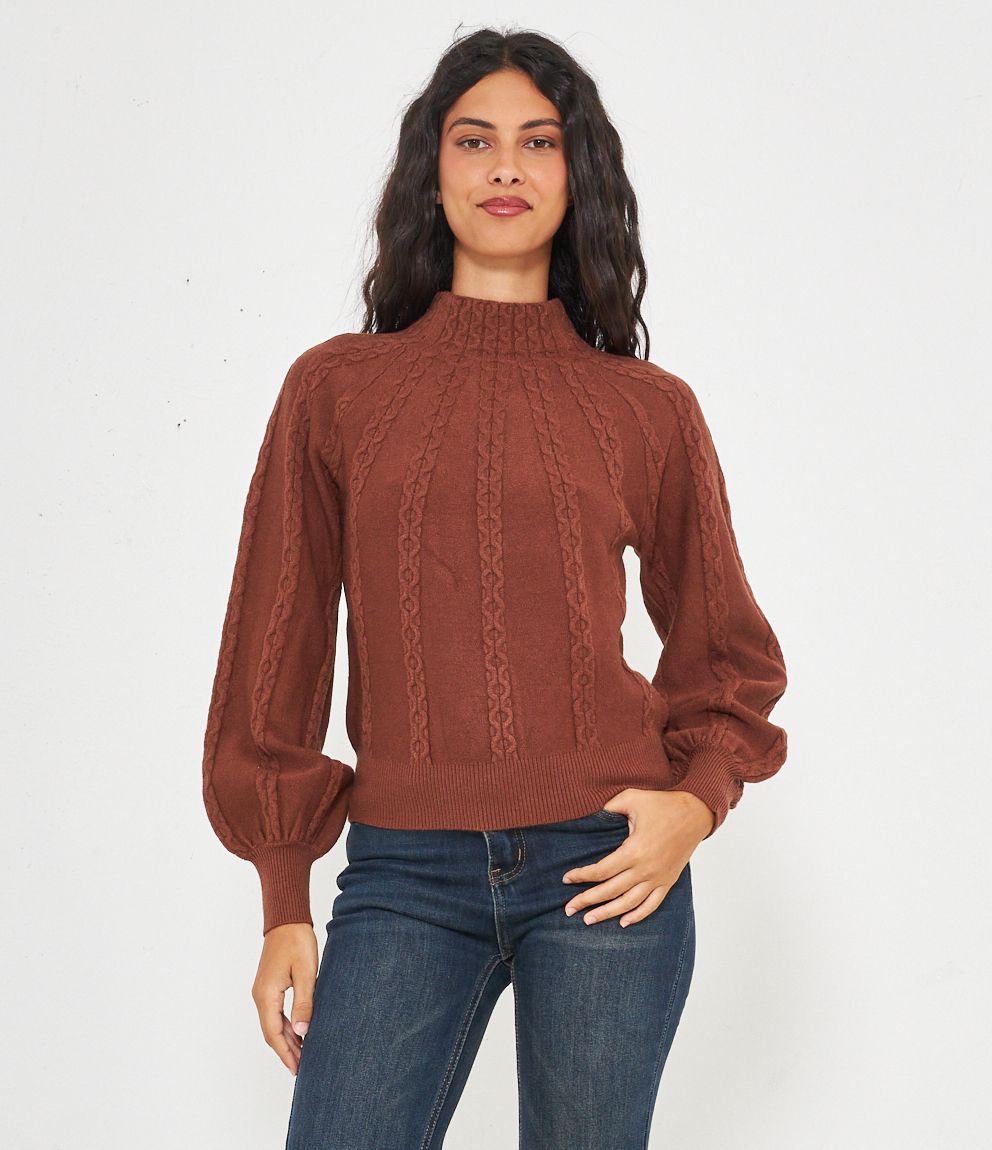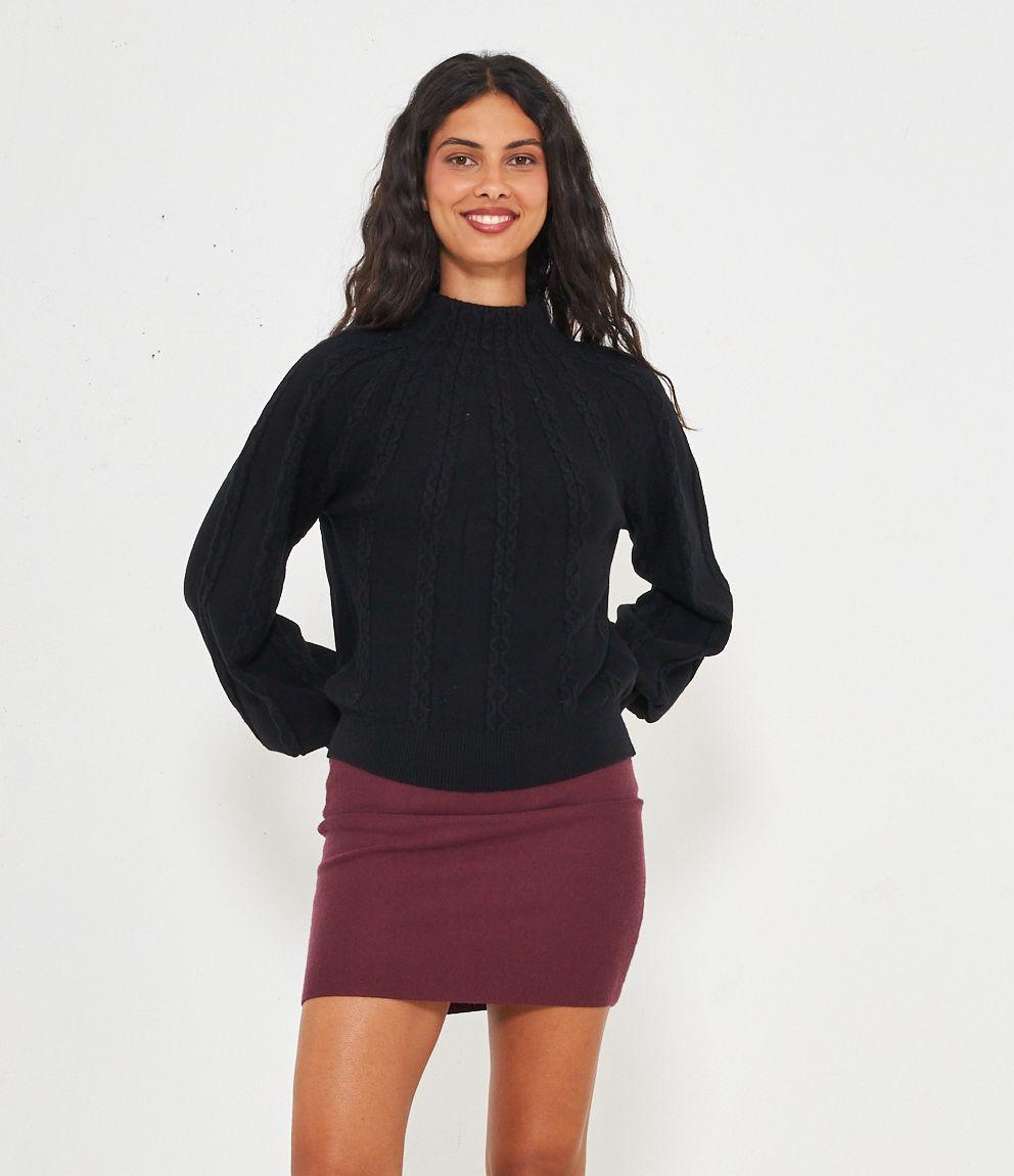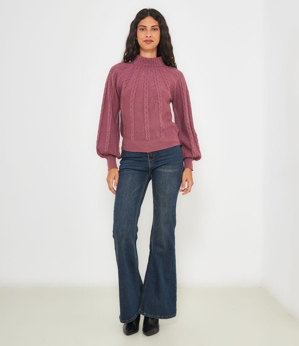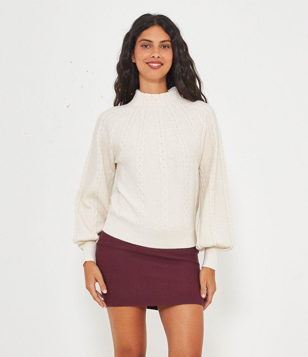 Maglia lavorata con mezzo collo e maniche con fondo elastico a costine.