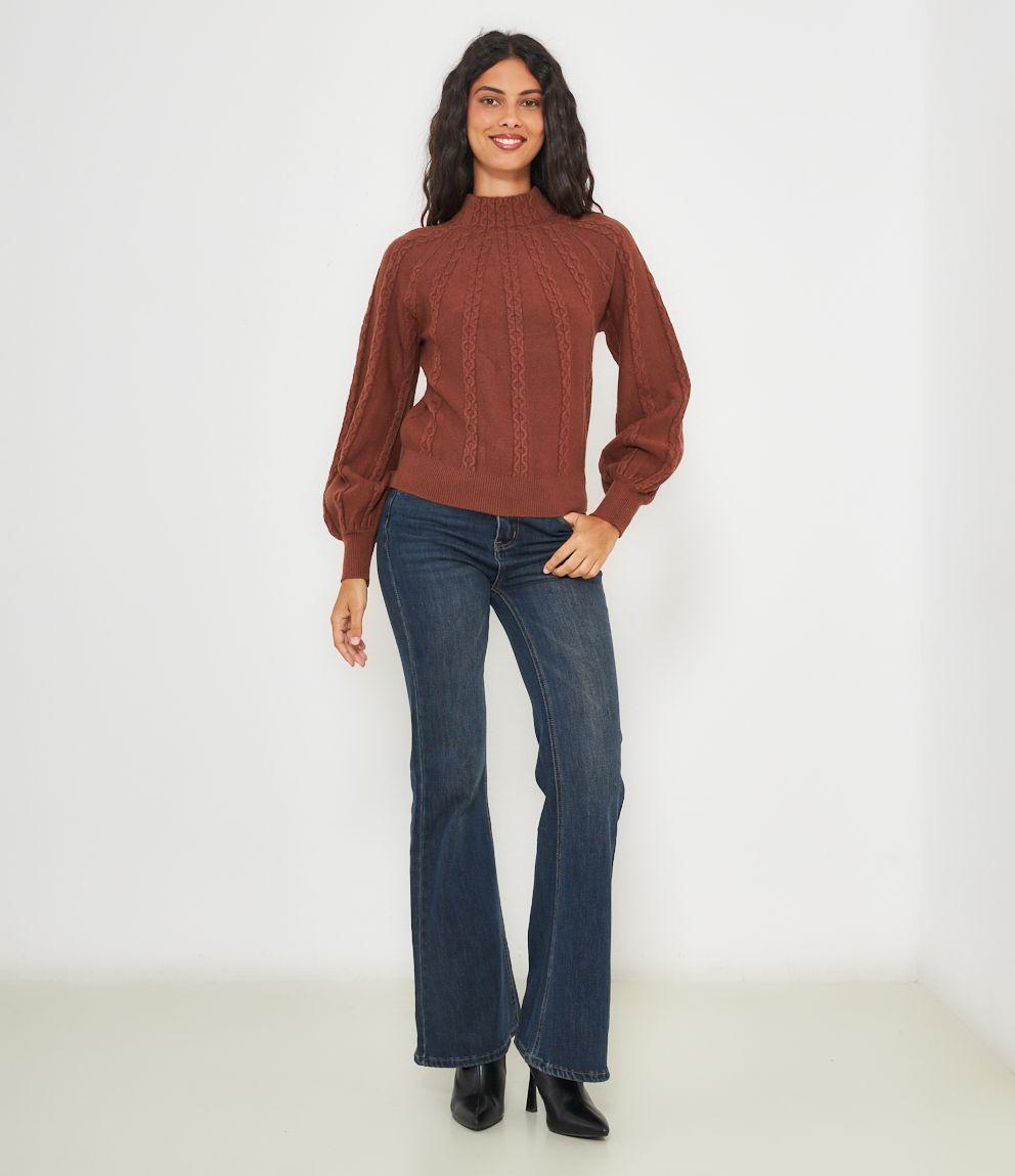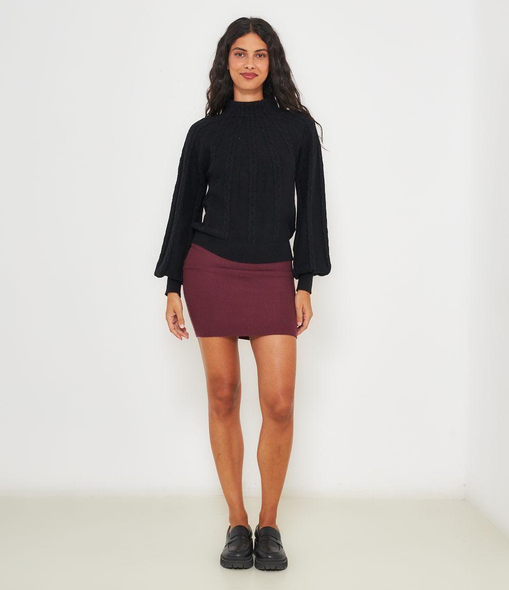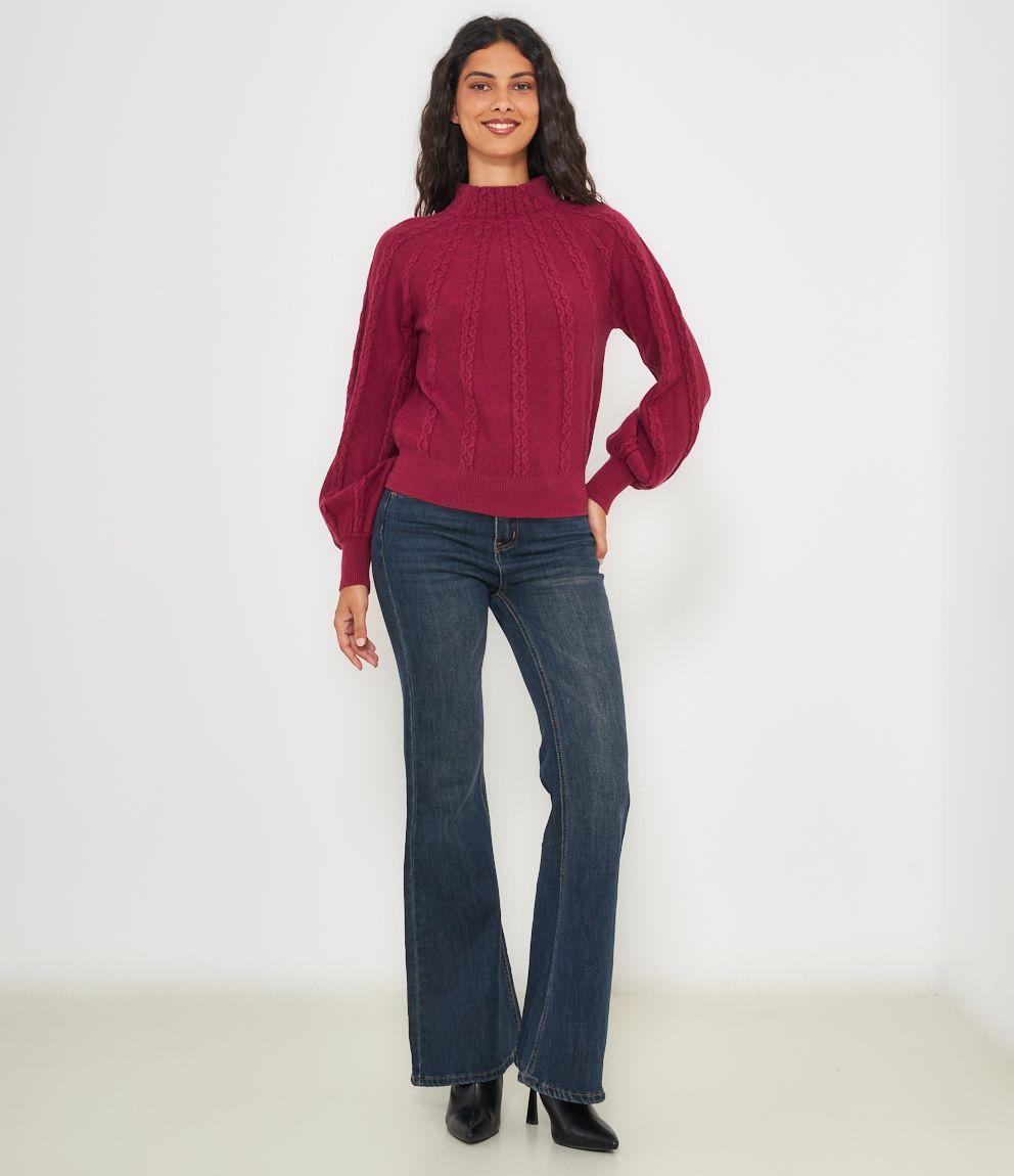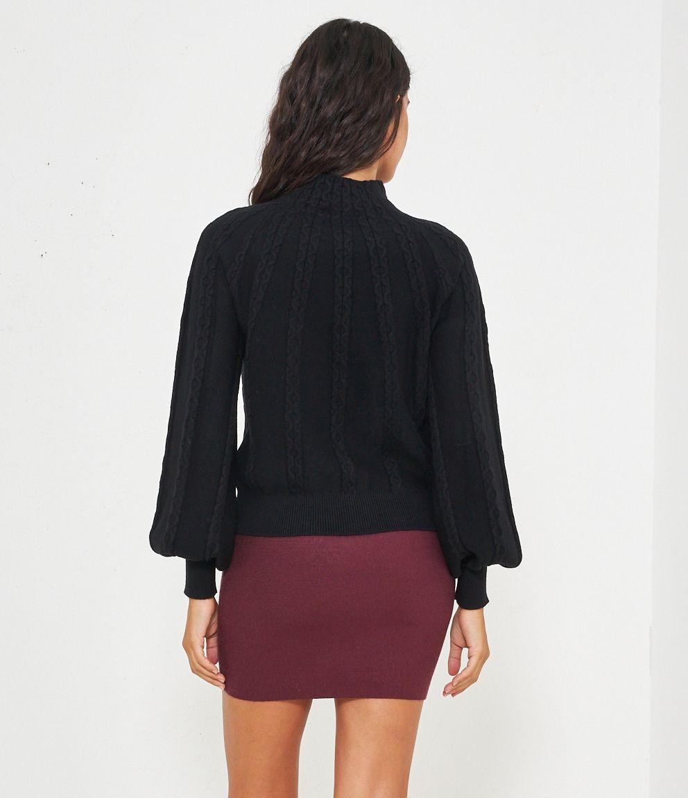 Maglia lavorata con mezzo collo e maniche con fondo elastico a costine.