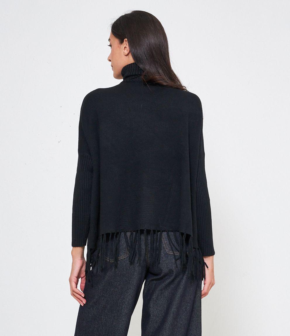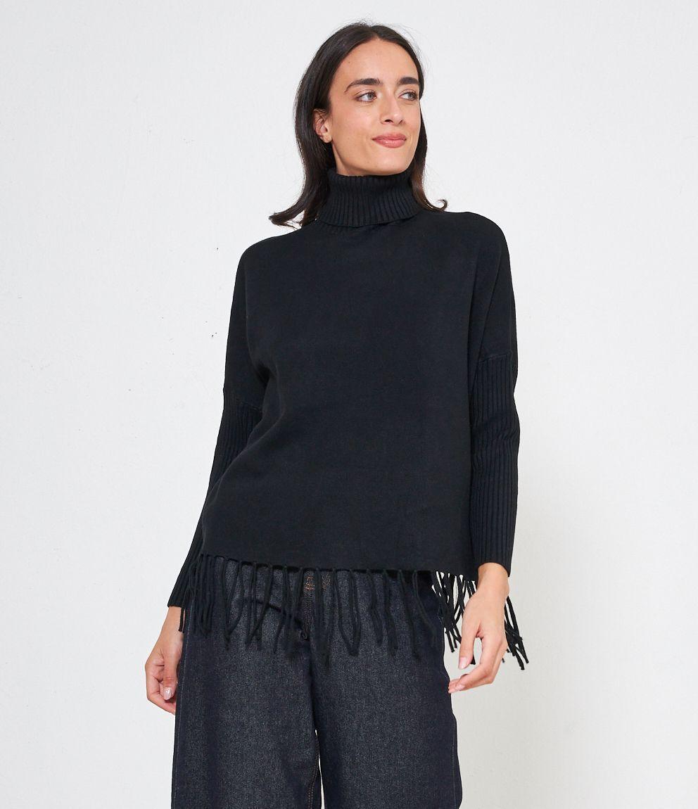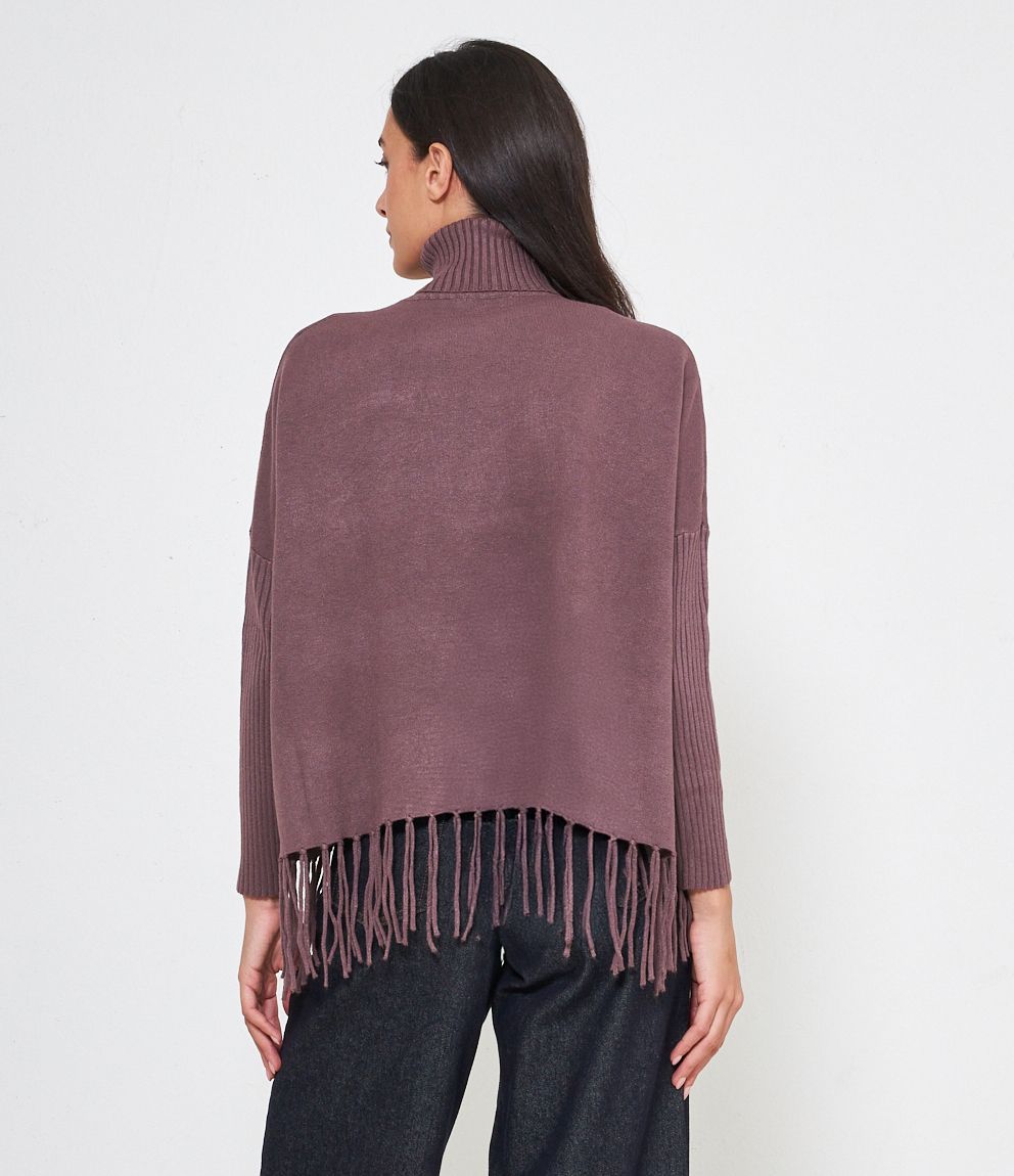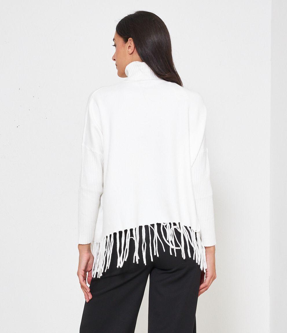 Maglia modello over con frange sul fondo, collo alto e maniche a costine.