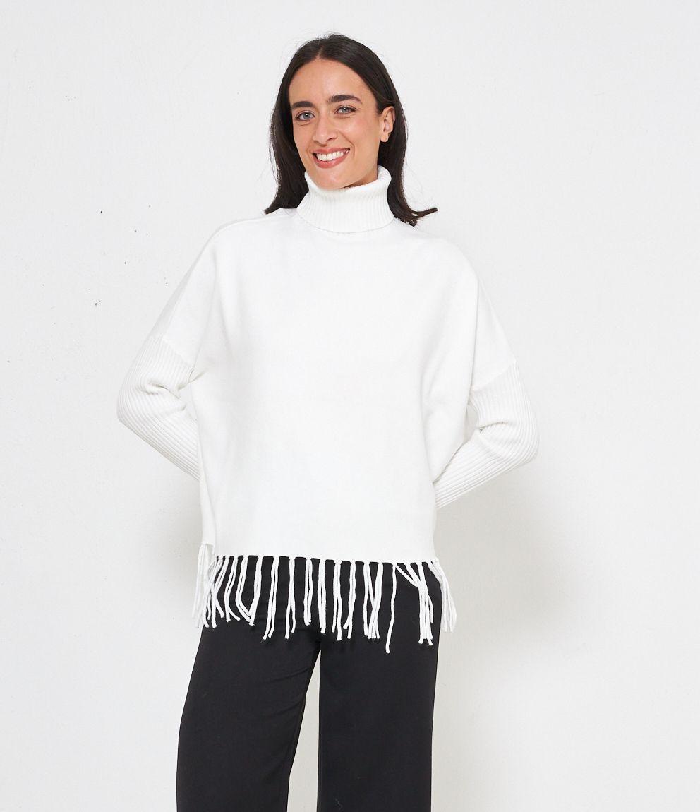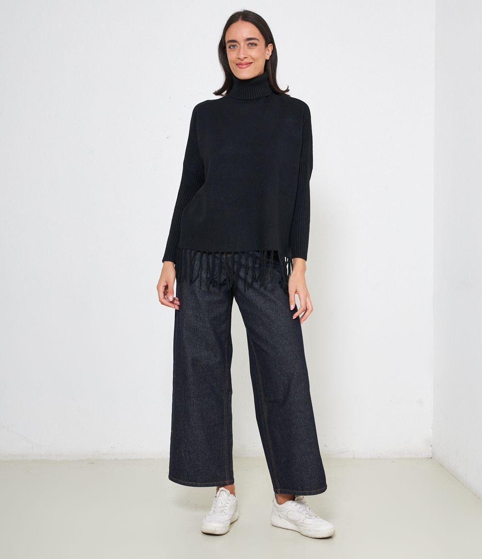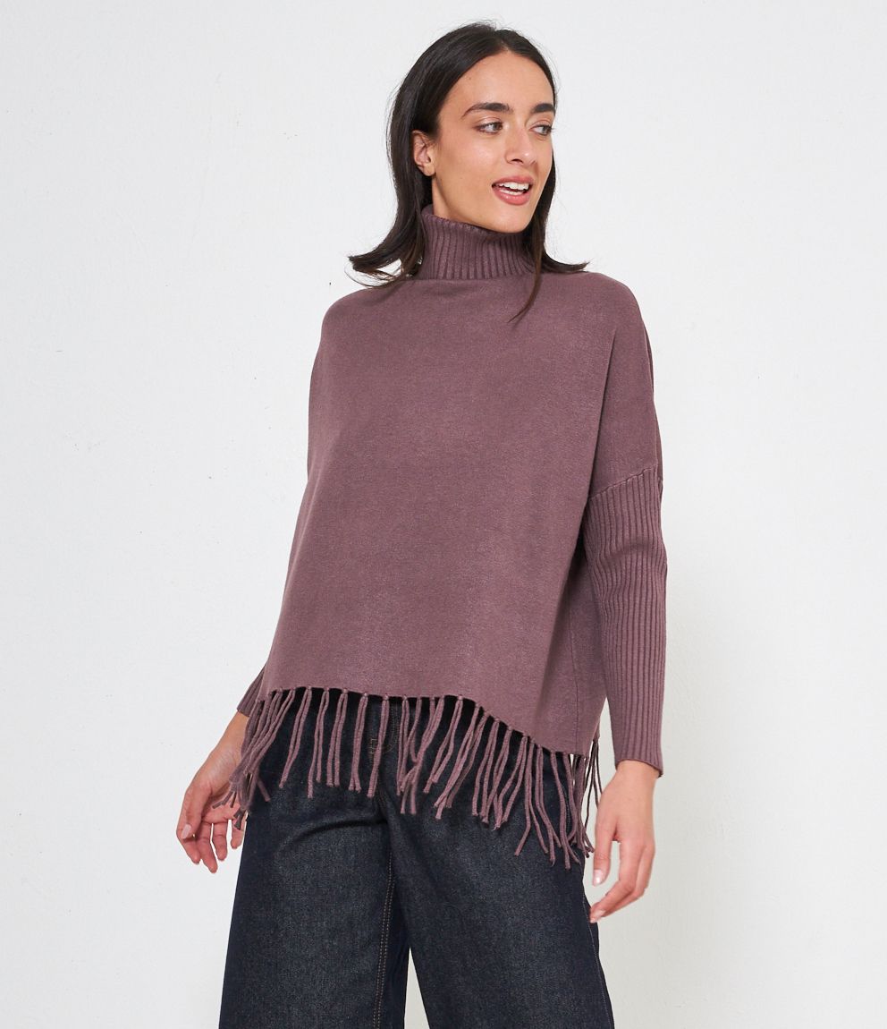 Maglia modello over con frange sul fondo, collo alto e maniche a costine.