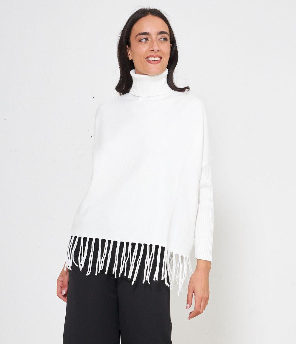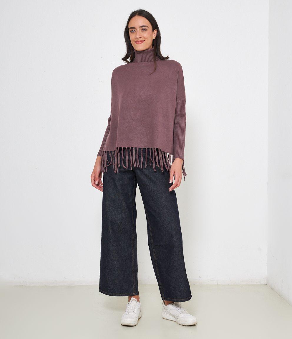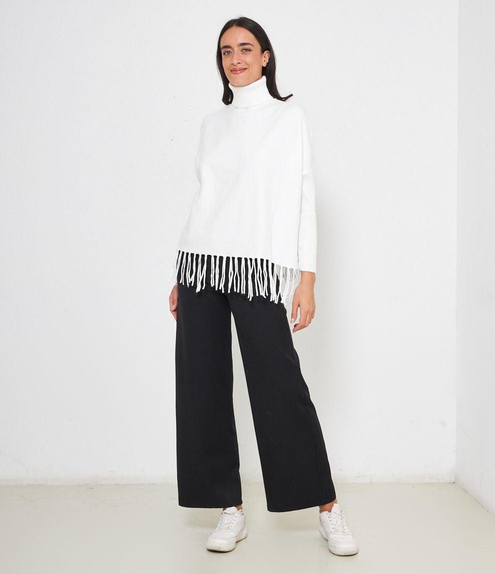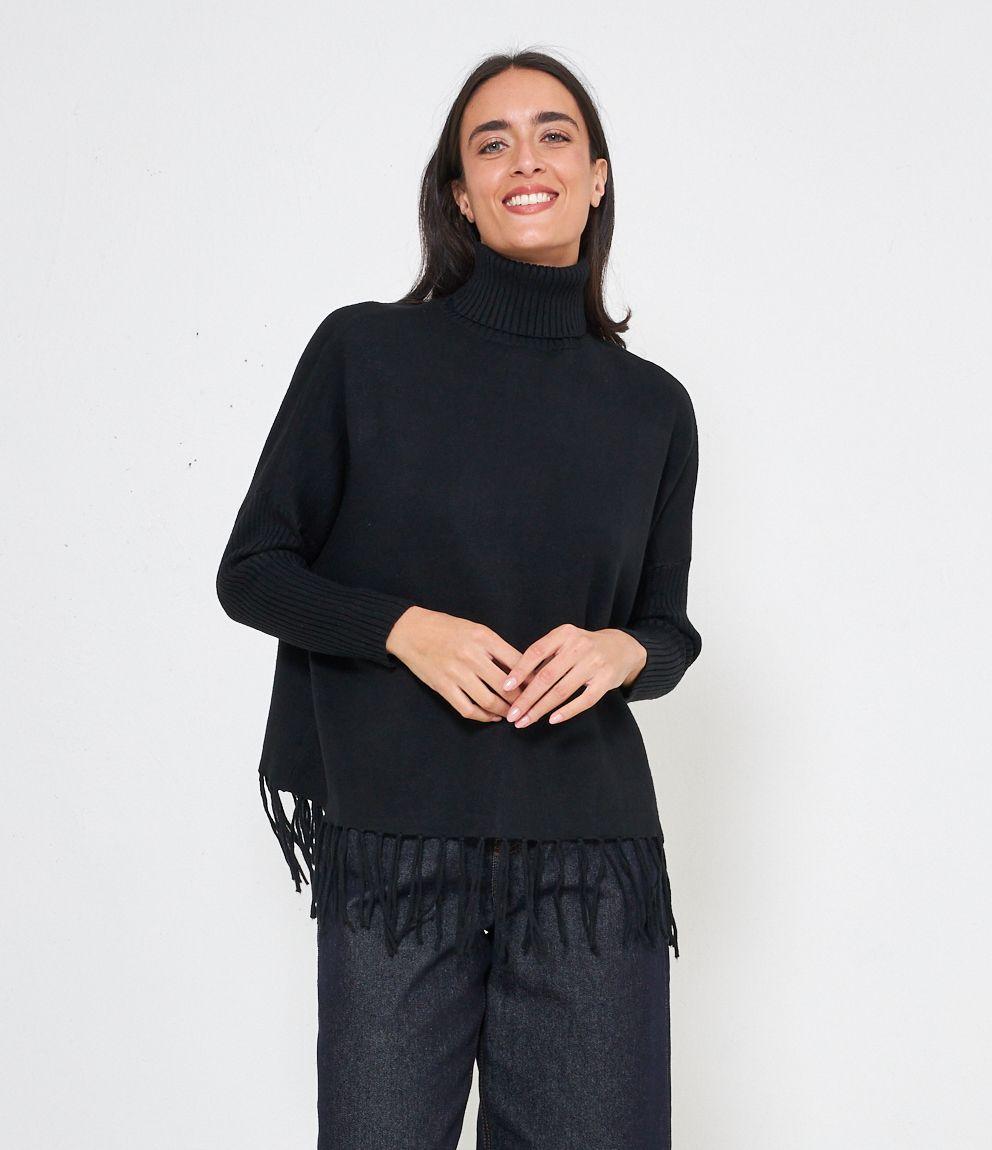 Maglia modello over con frange sul fondo, collo alto e maniche a costine.