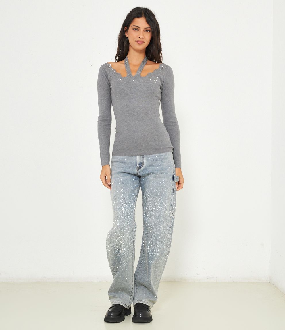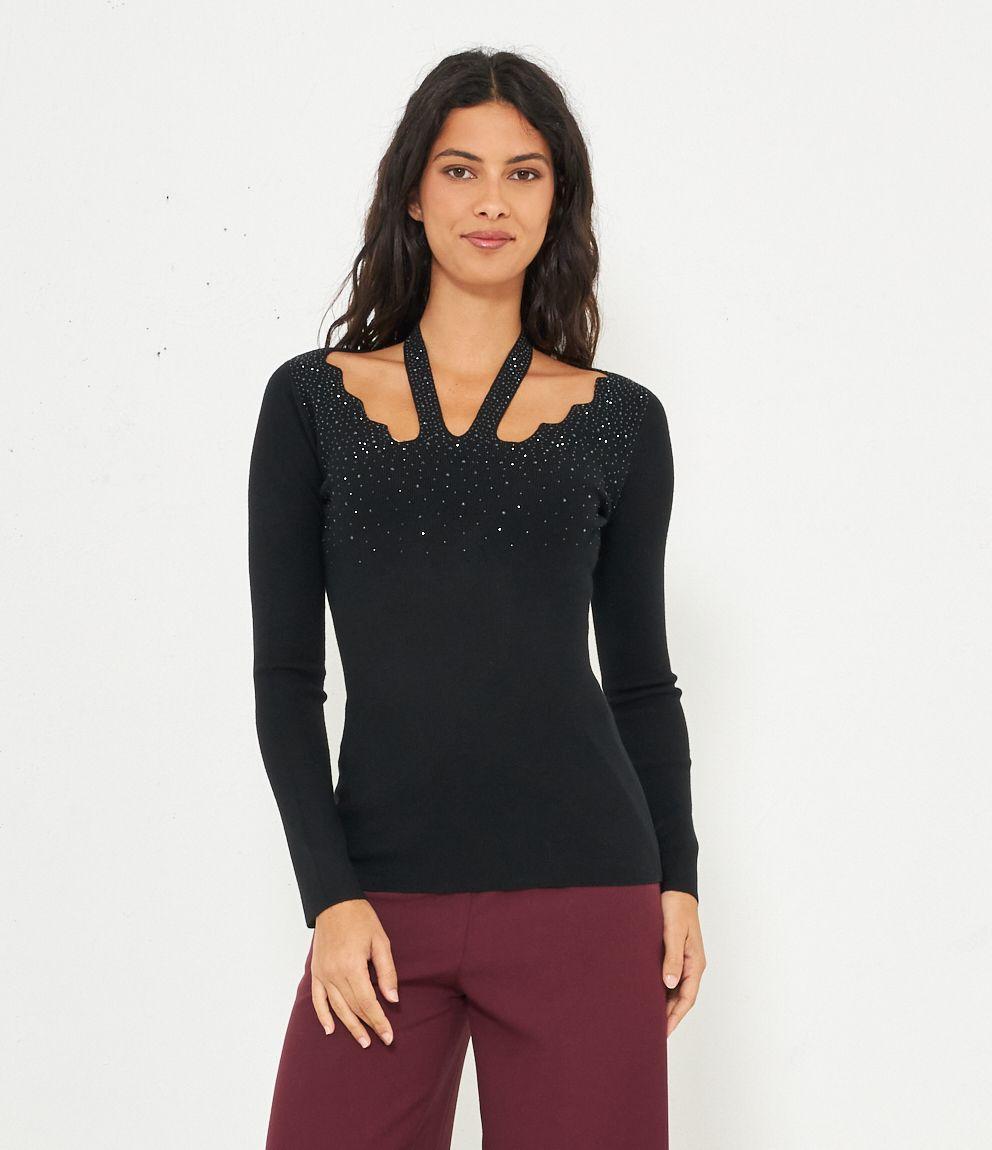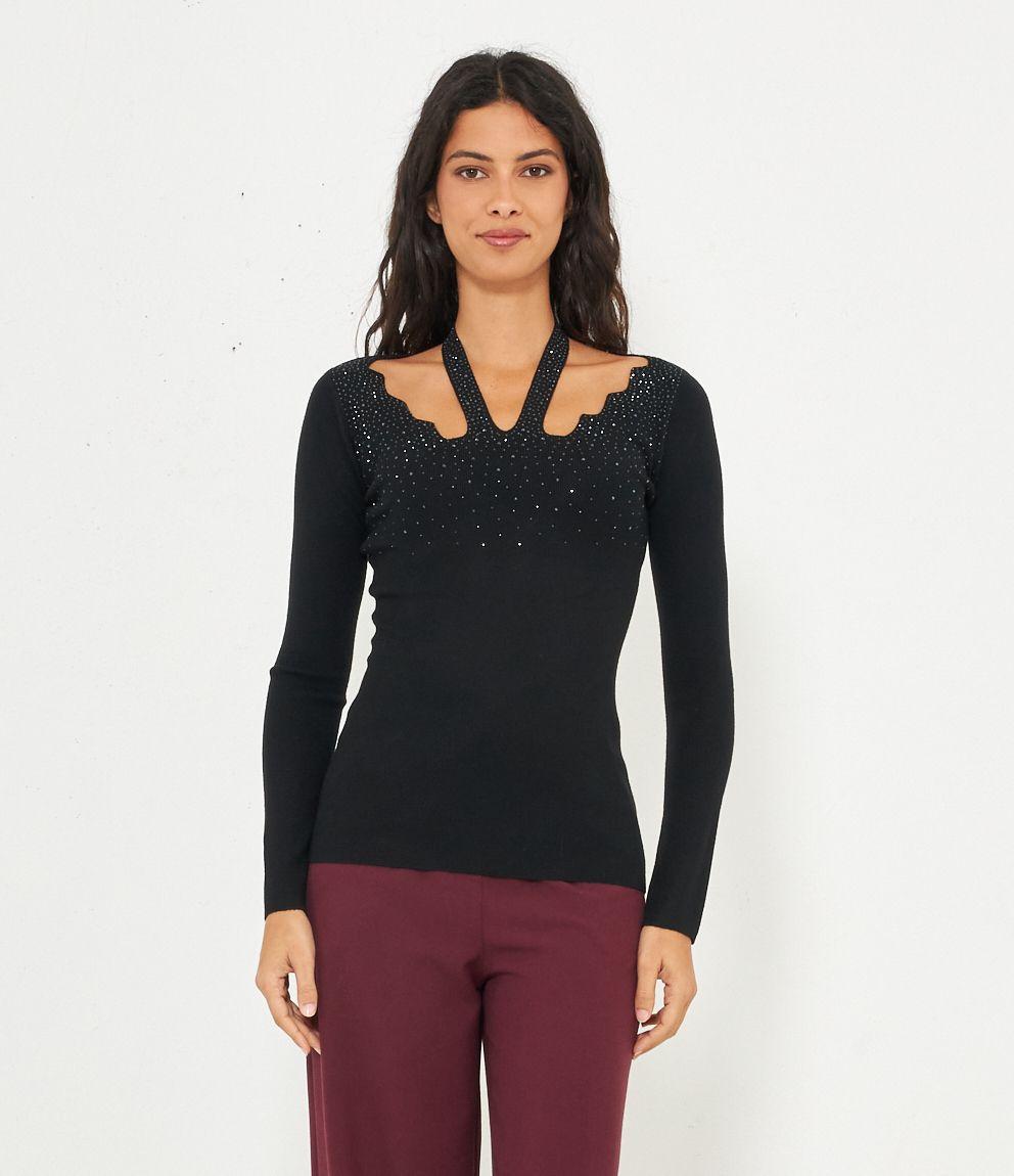 Maglia con strass modello slim fit, scollo ampio con cut out.