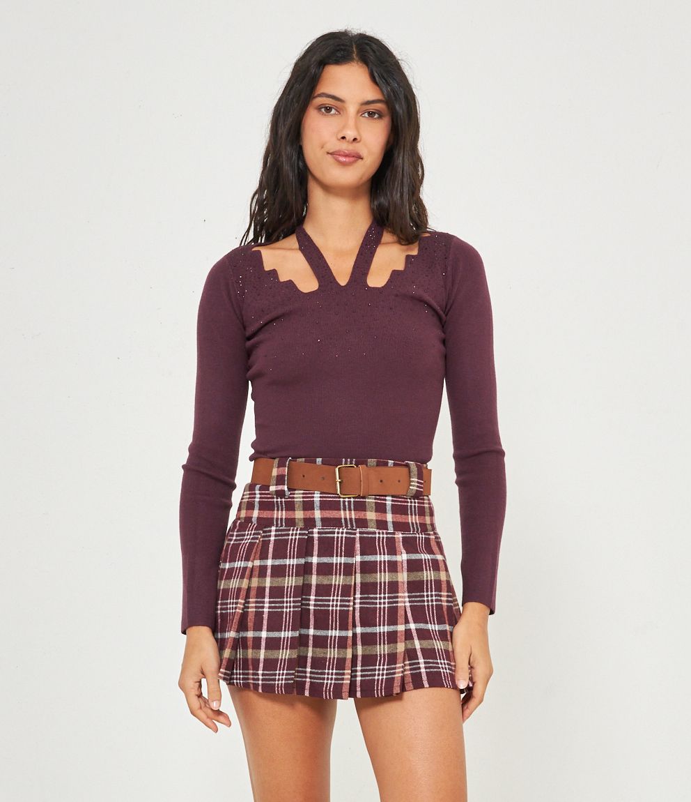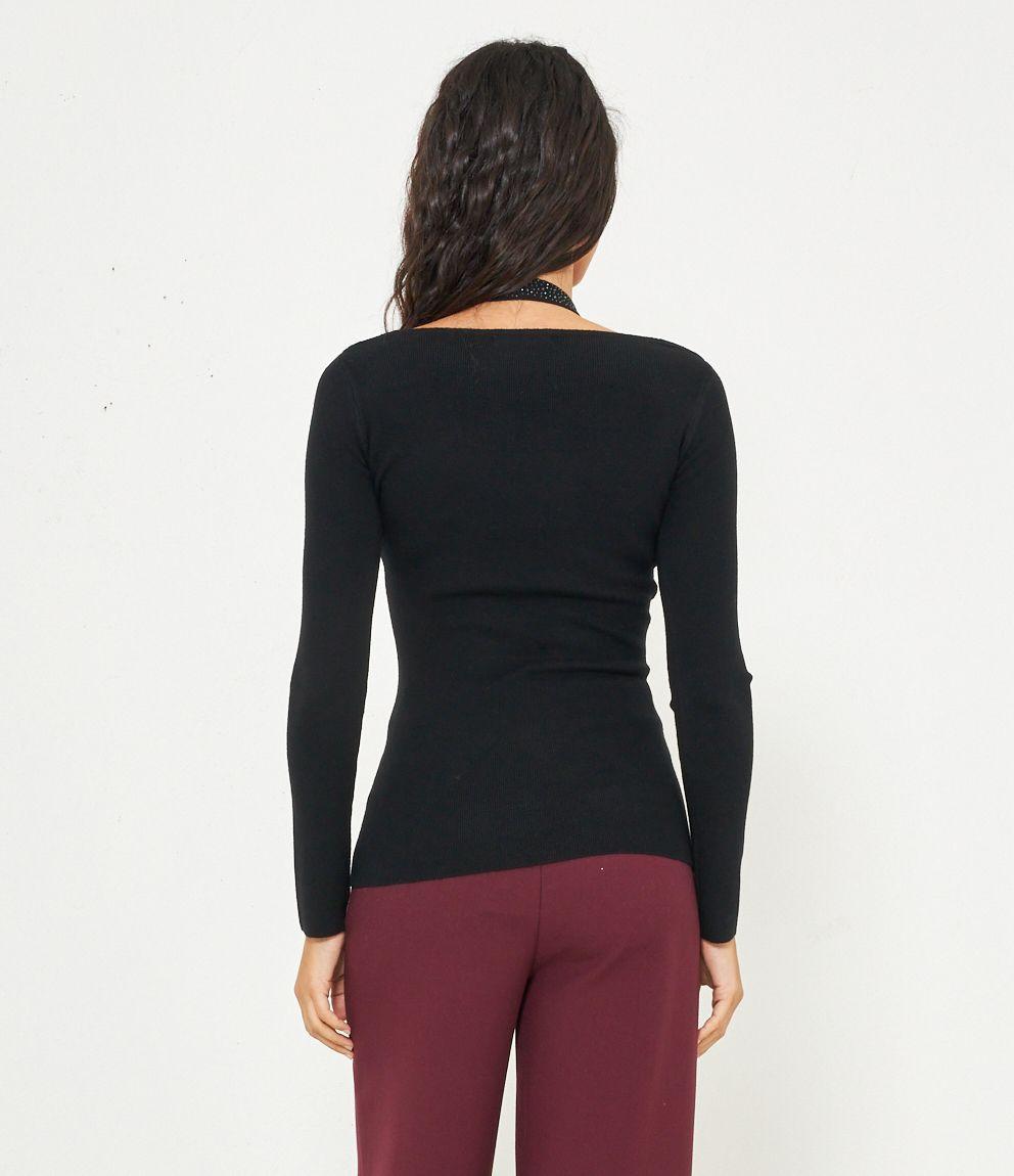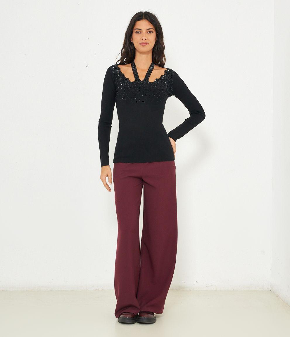 Maglia con strass modello slim fit, scollo ampio con cut out.
