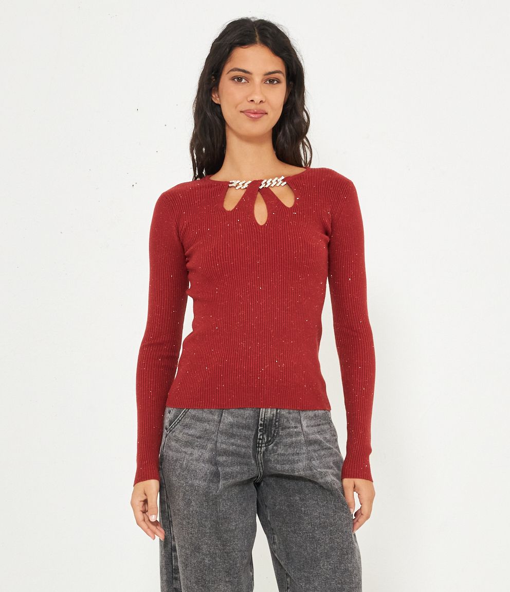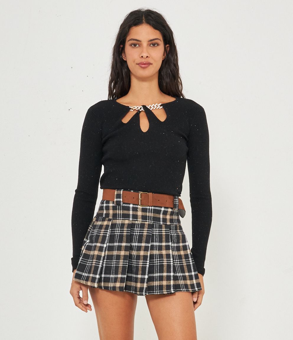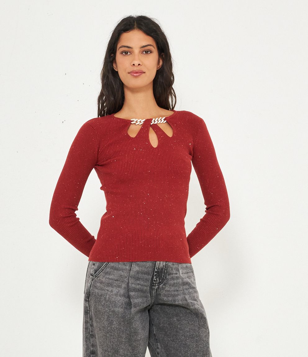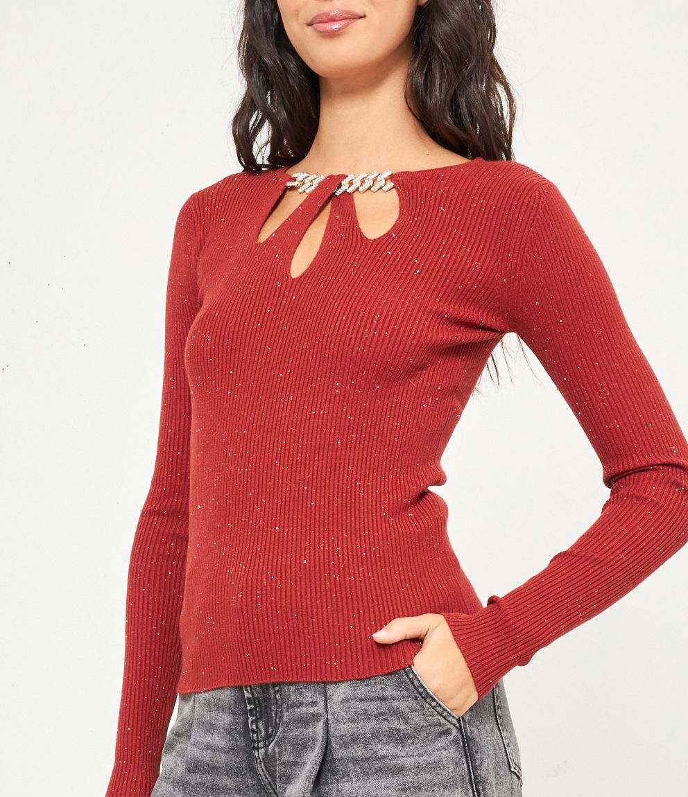 Maglia lurex a girocollo con catena in strass e scollo con cut out.
