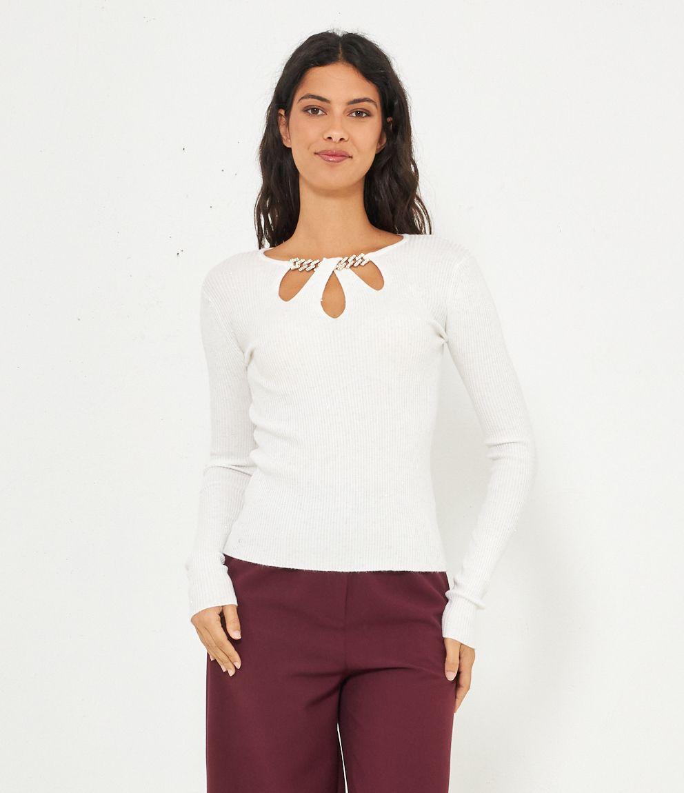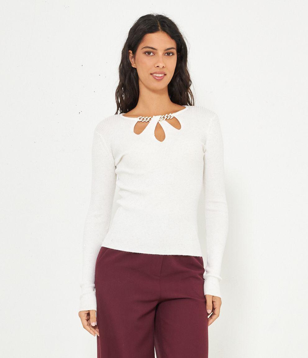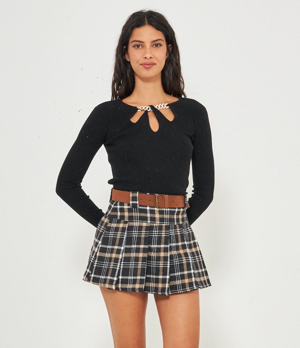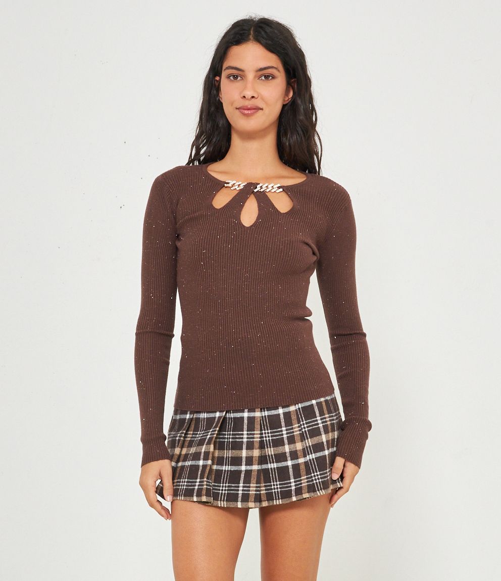 Maglia lurex a girocollo con catena in strass e scollo con cut out.