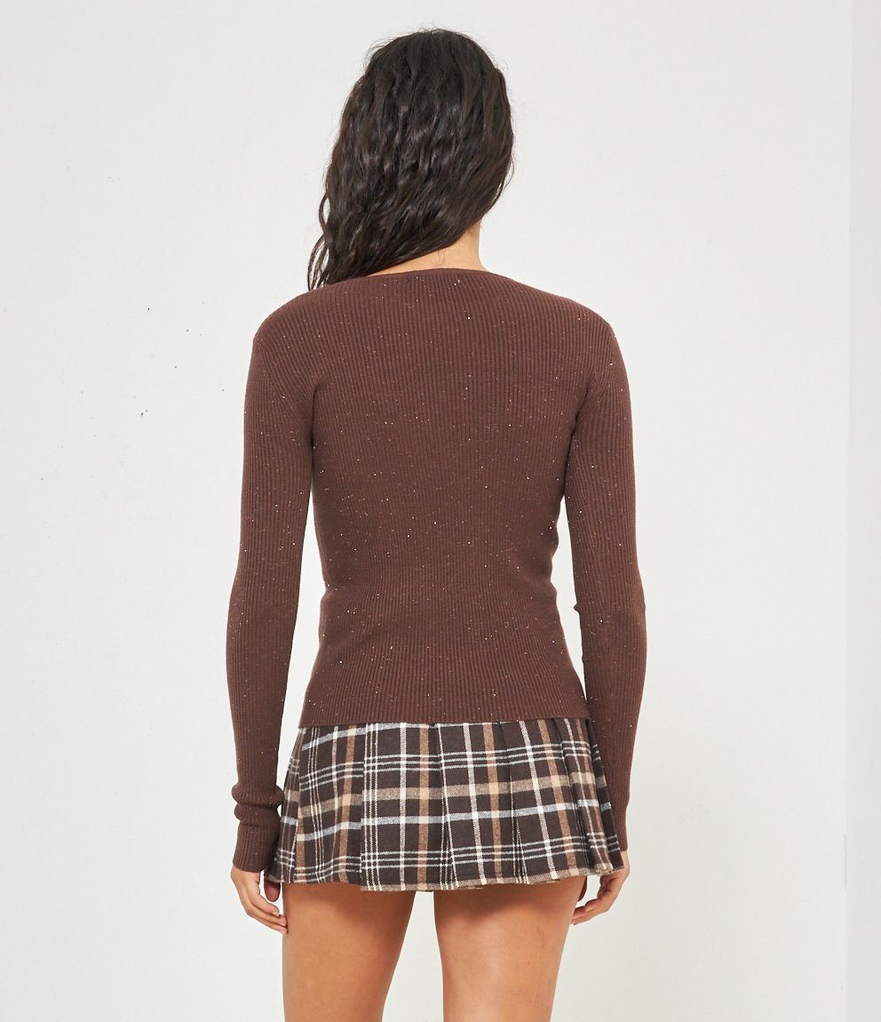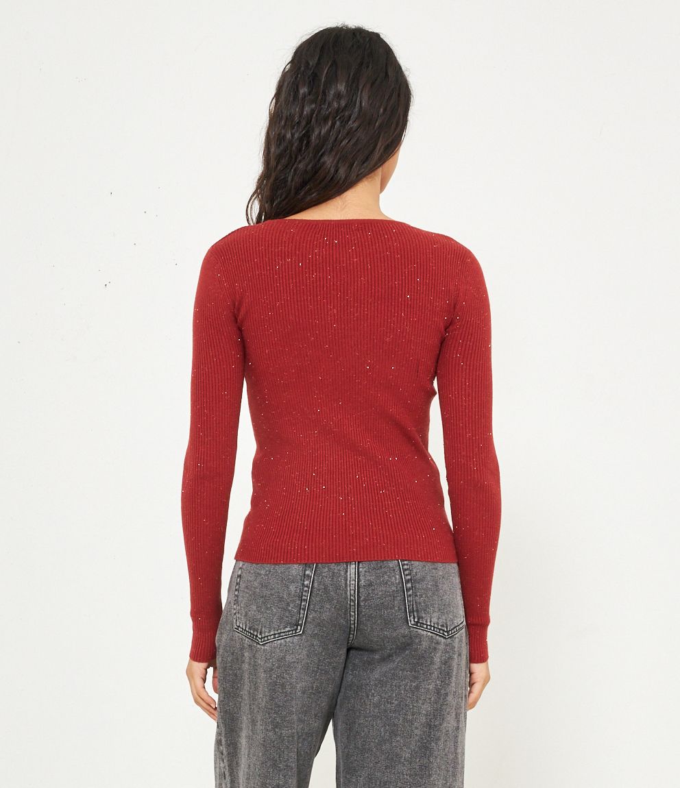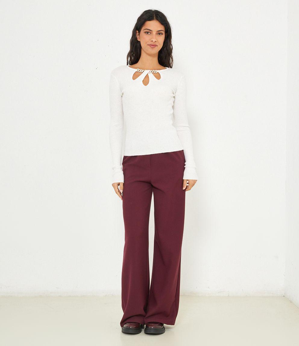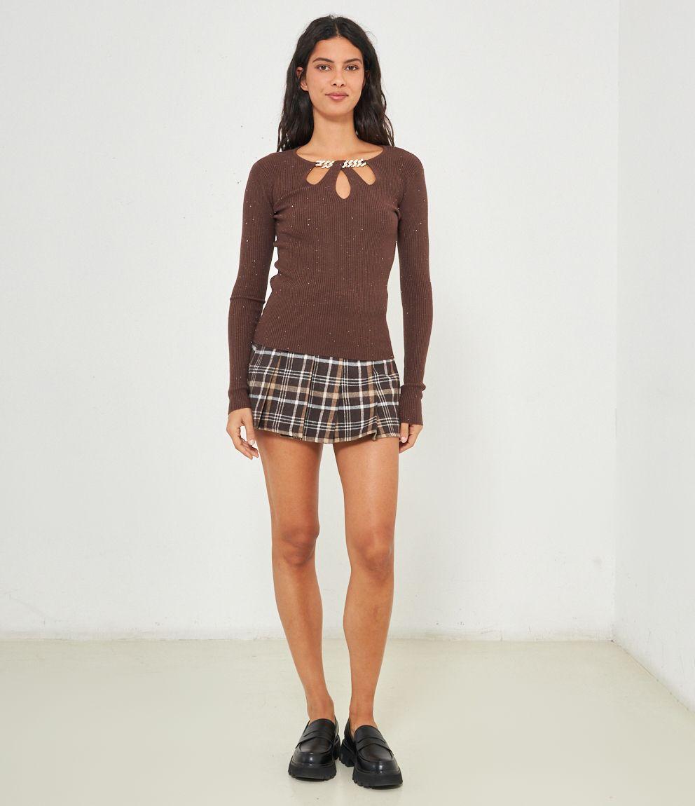 Maglia lurex a girocollo con catena in strass e scollo con cut out.