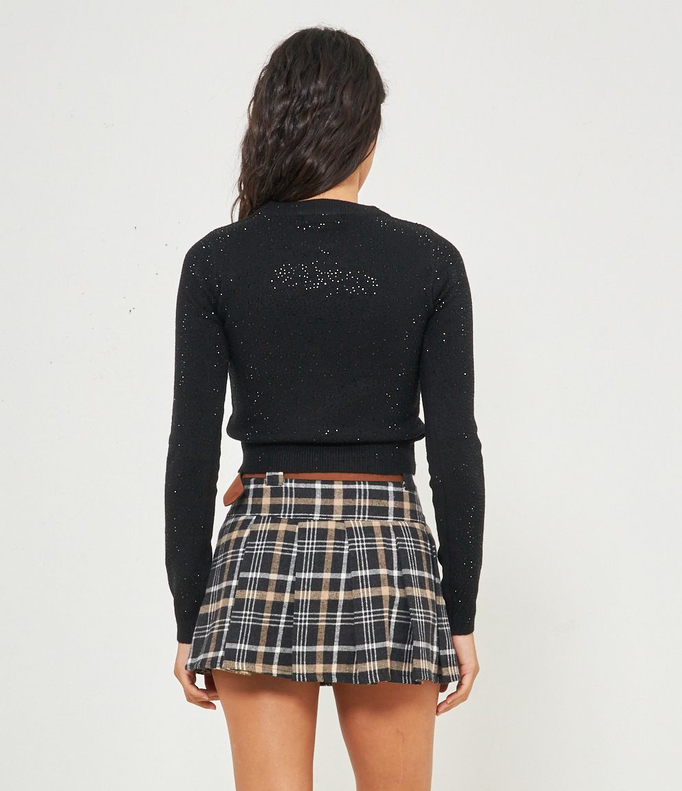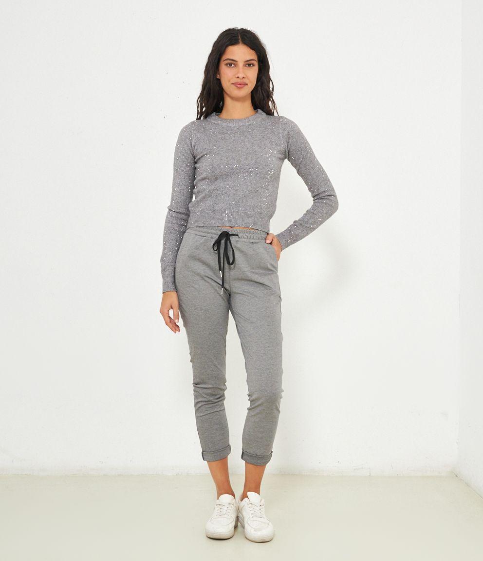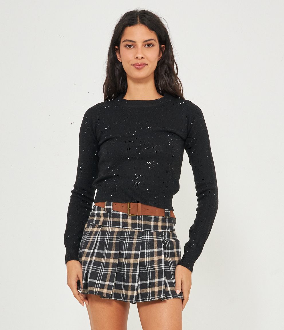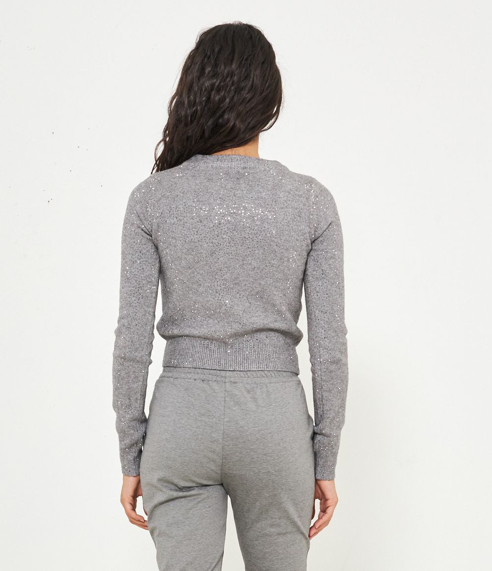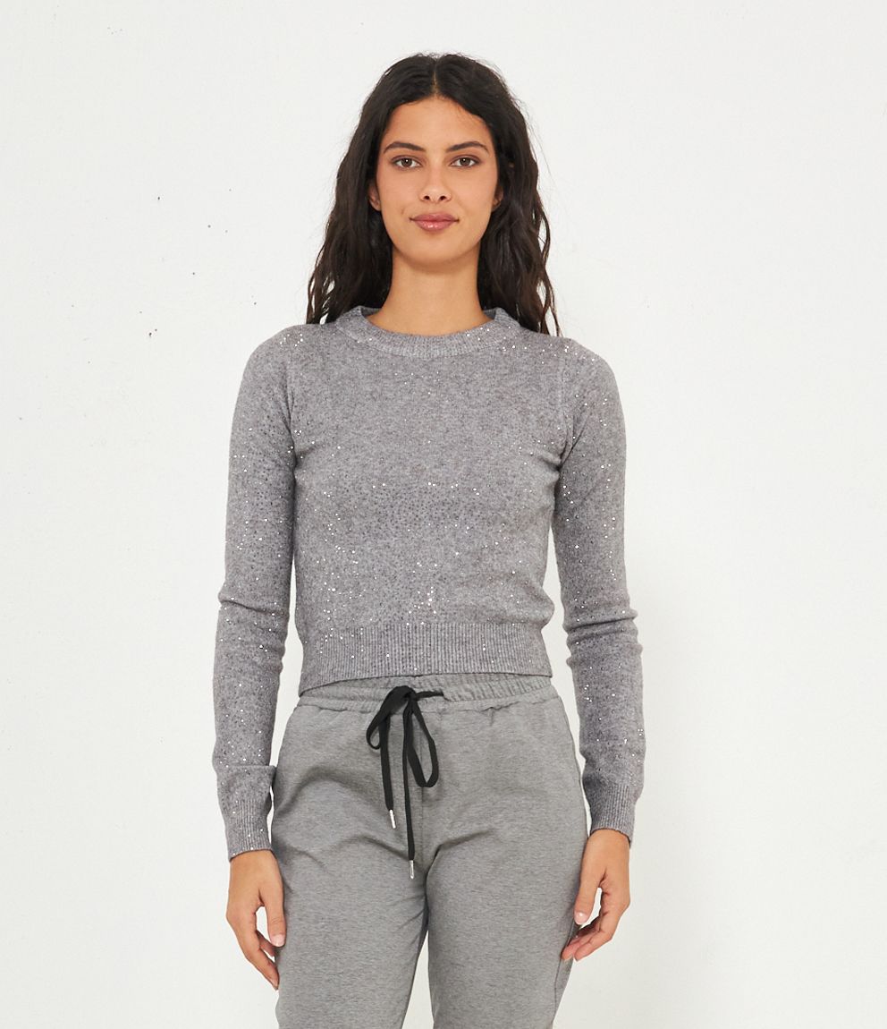 Maglia modello crop a girocollo con strass e bordi a costine.