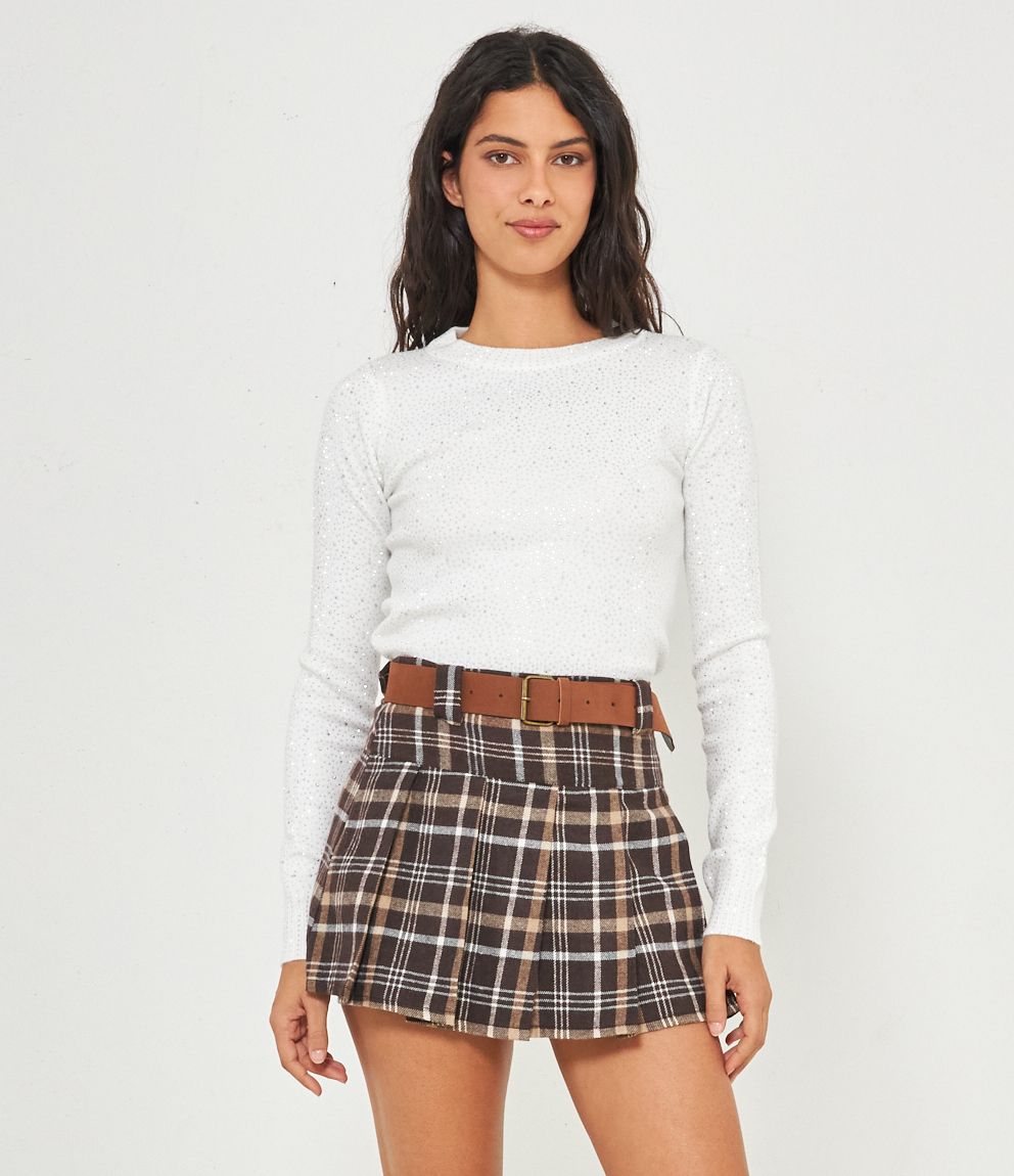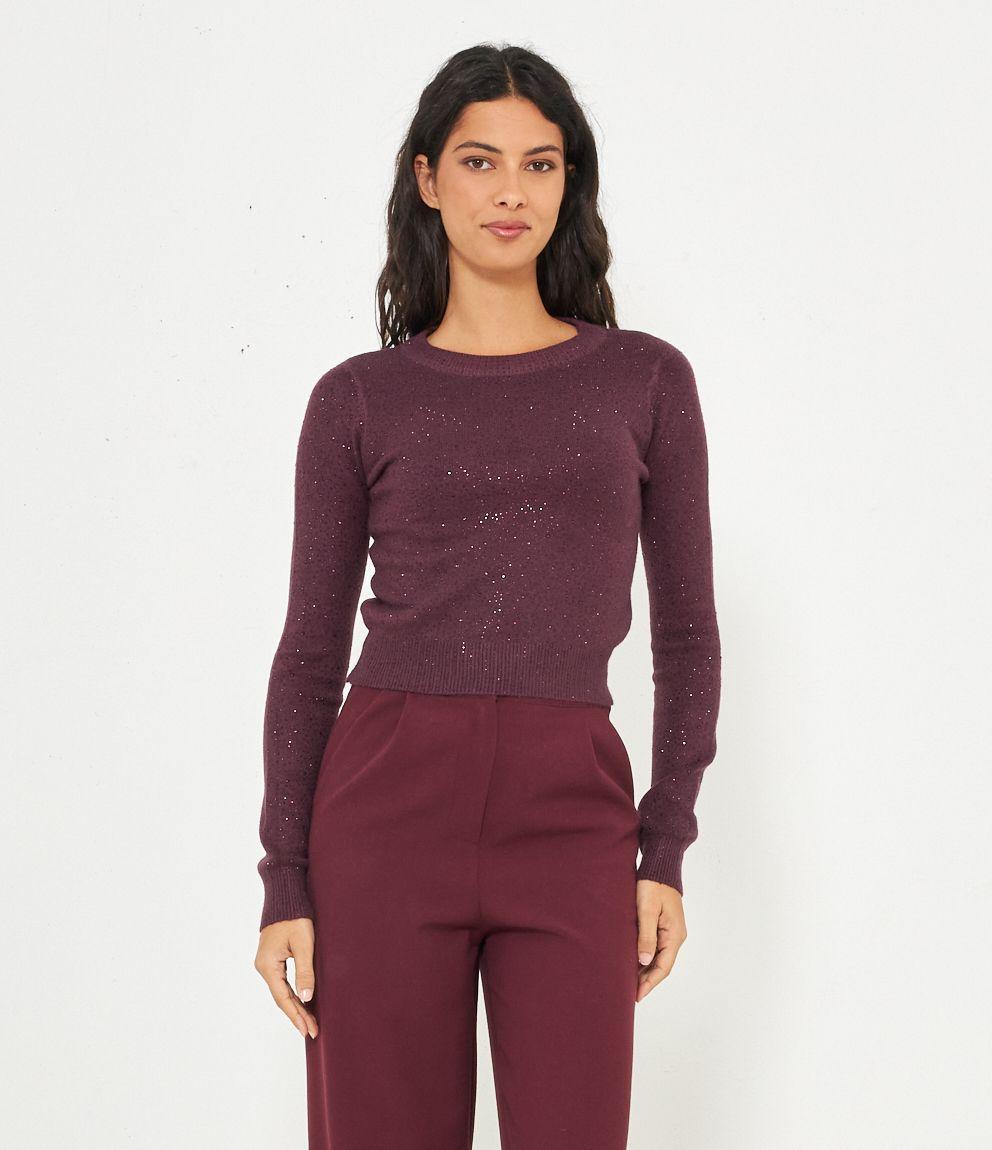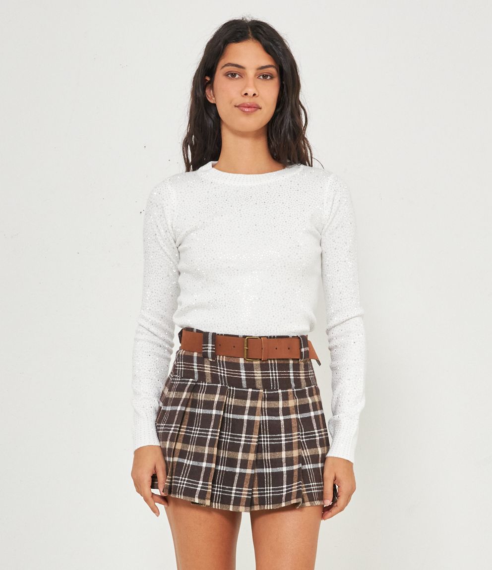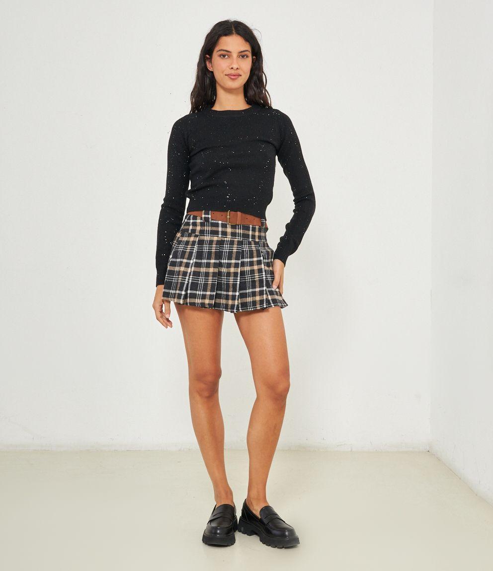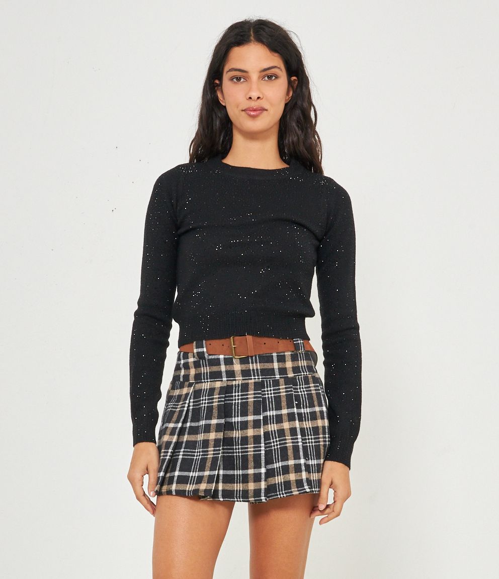 Maglia modello crop a girocollo con strass e bordi a costine.