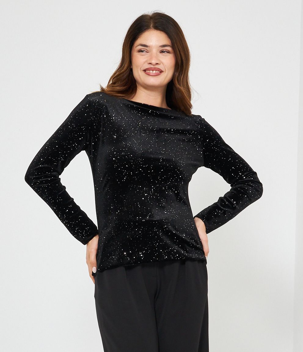 Maglia glitterata con scollo a barca.