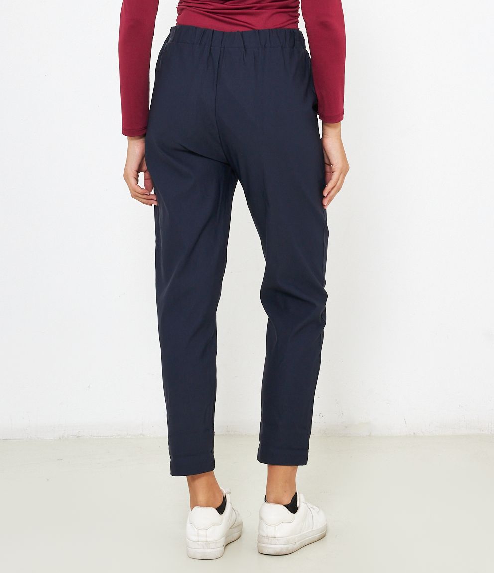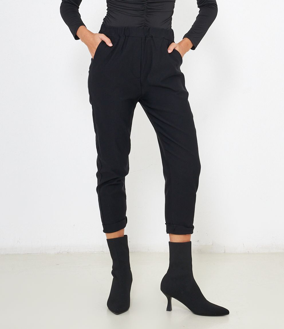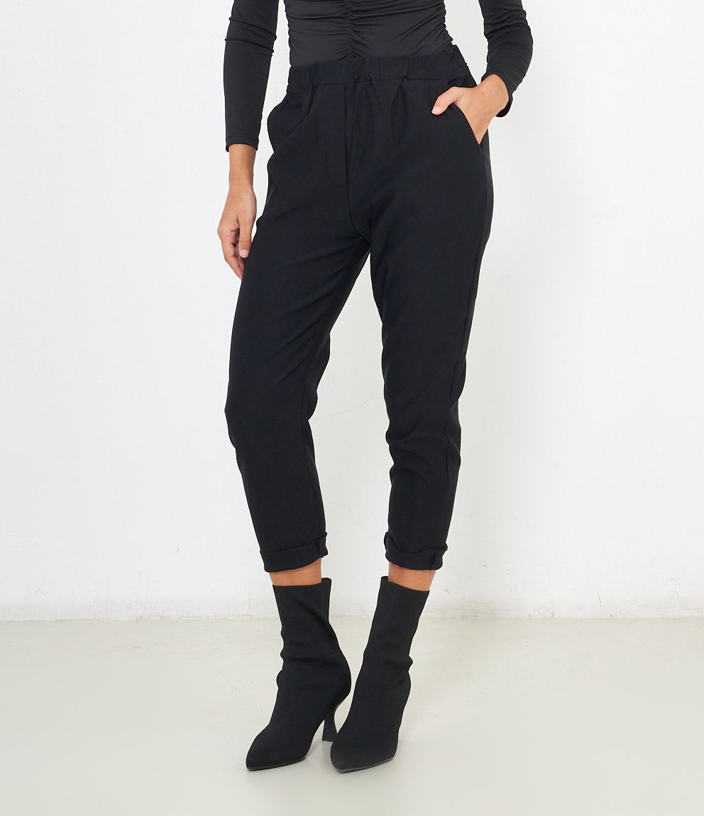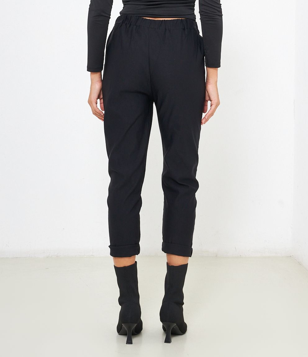 Pantaloni con elastico in vita e risvolti sul fondo.
