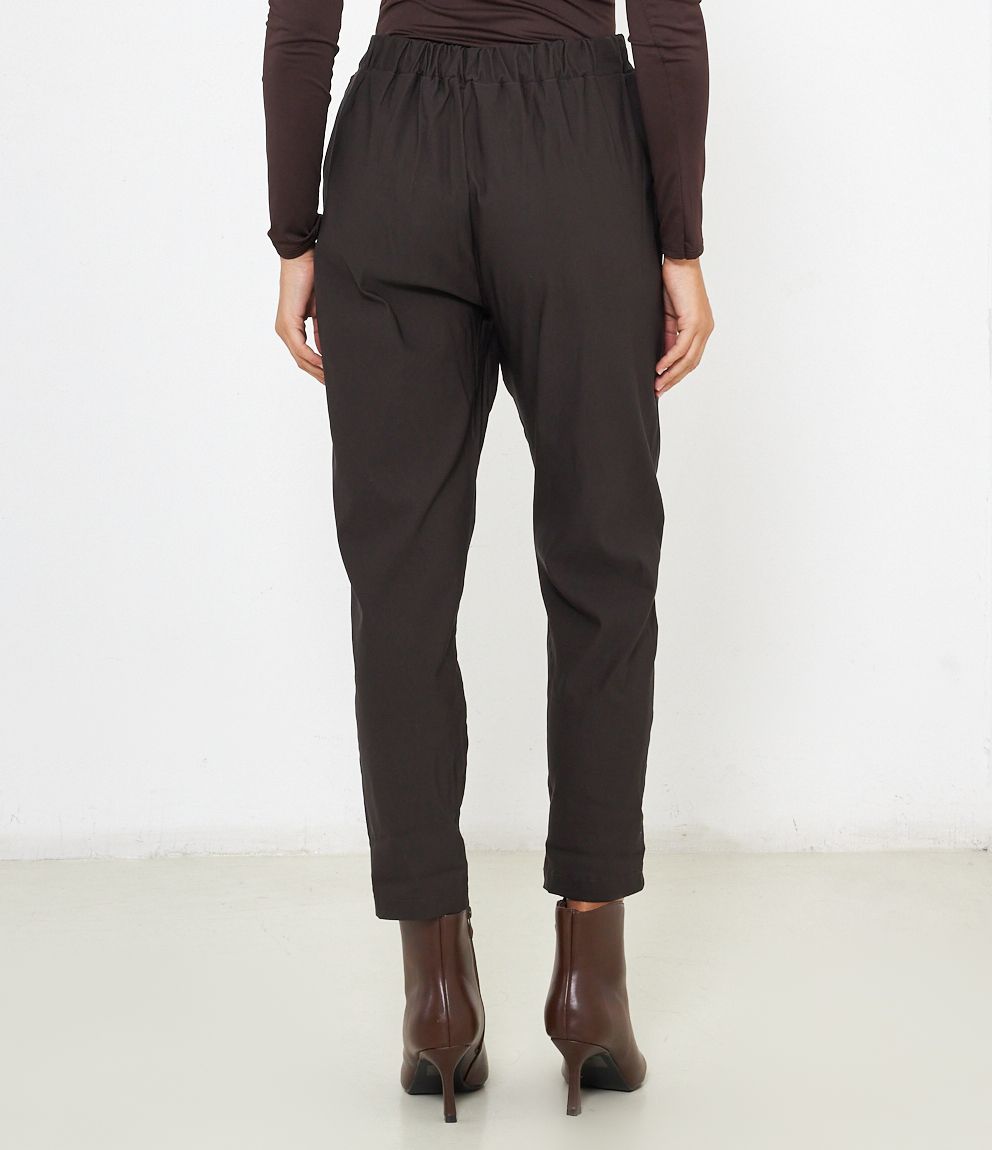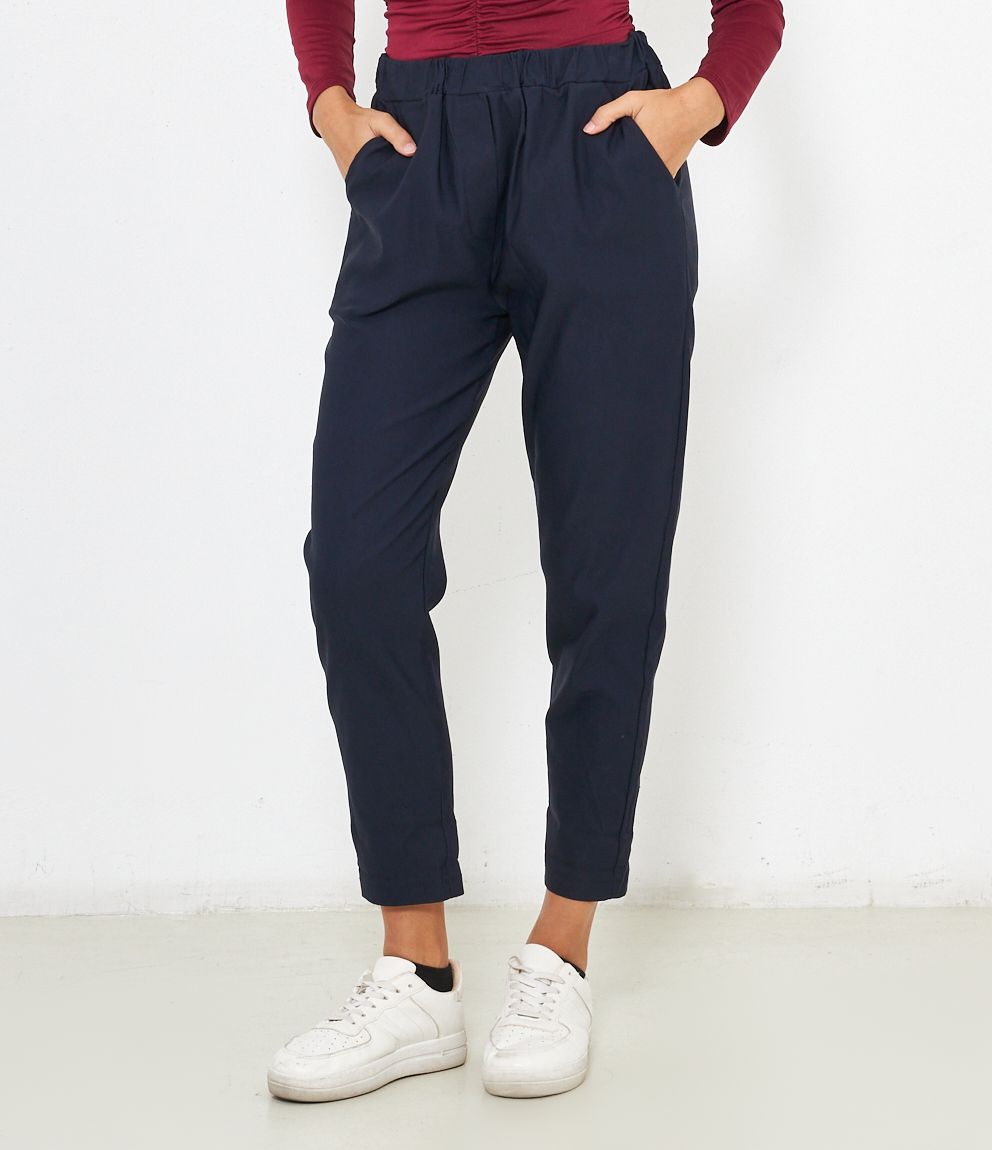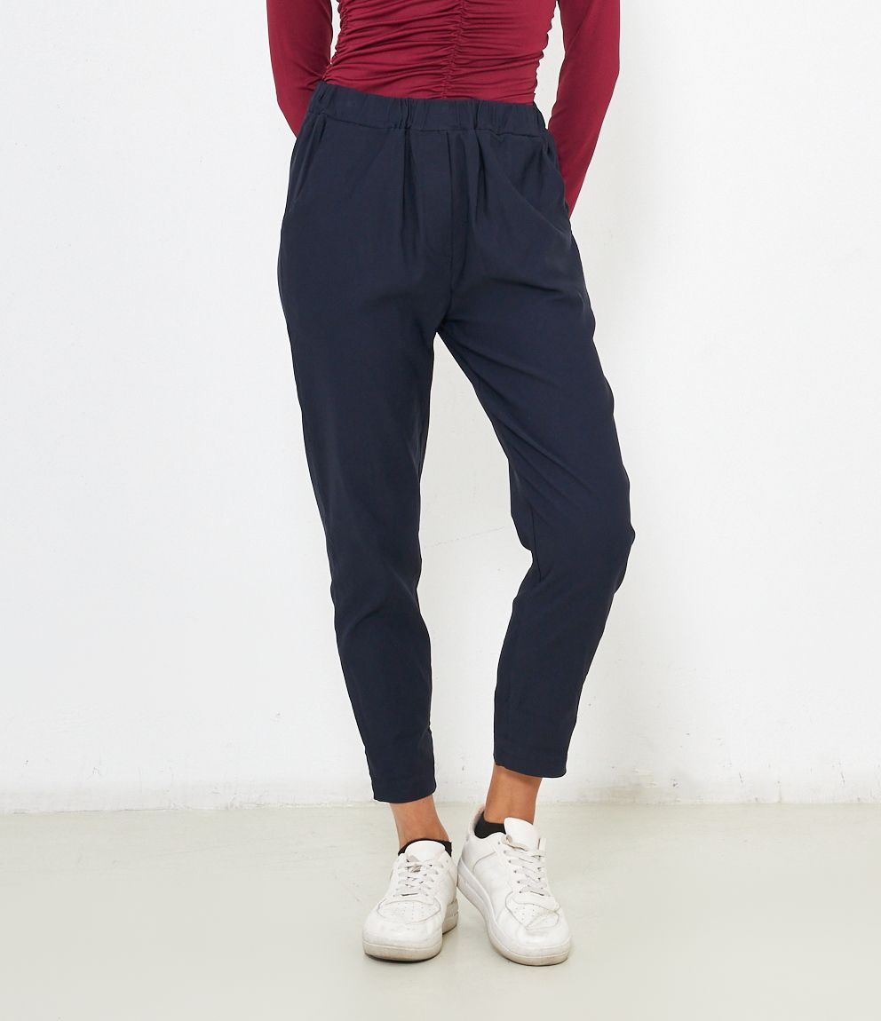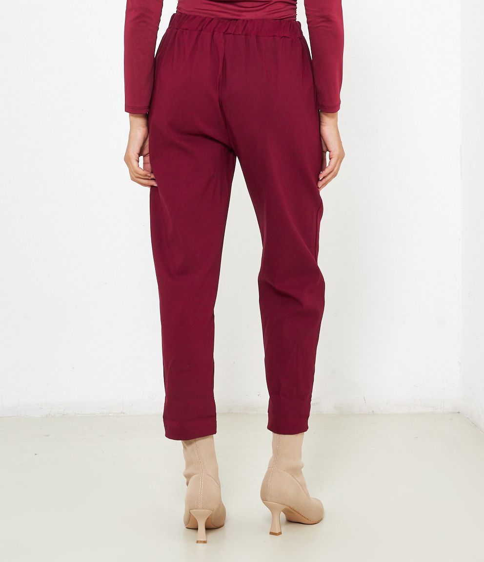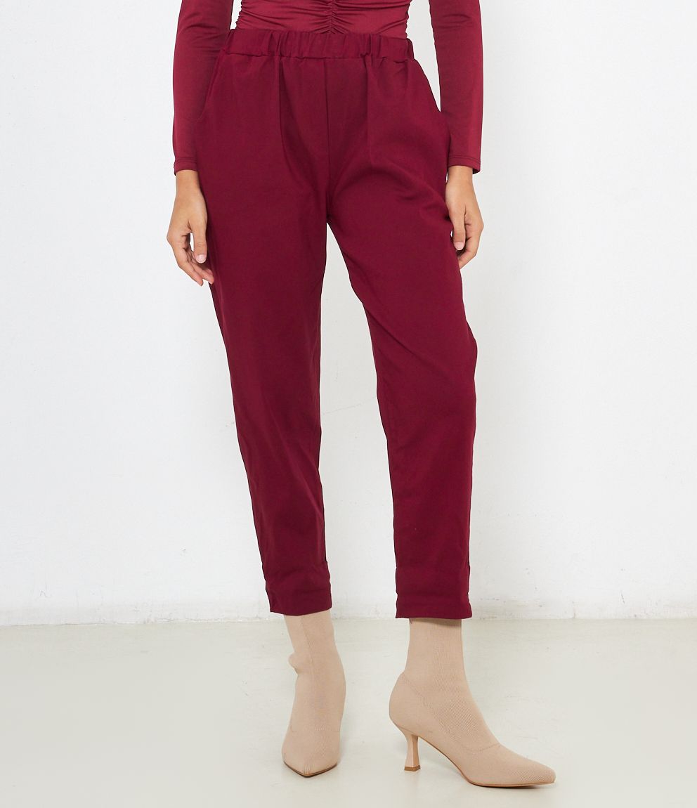 Pantaloni con elastico in vita e risvolti sul fondo.