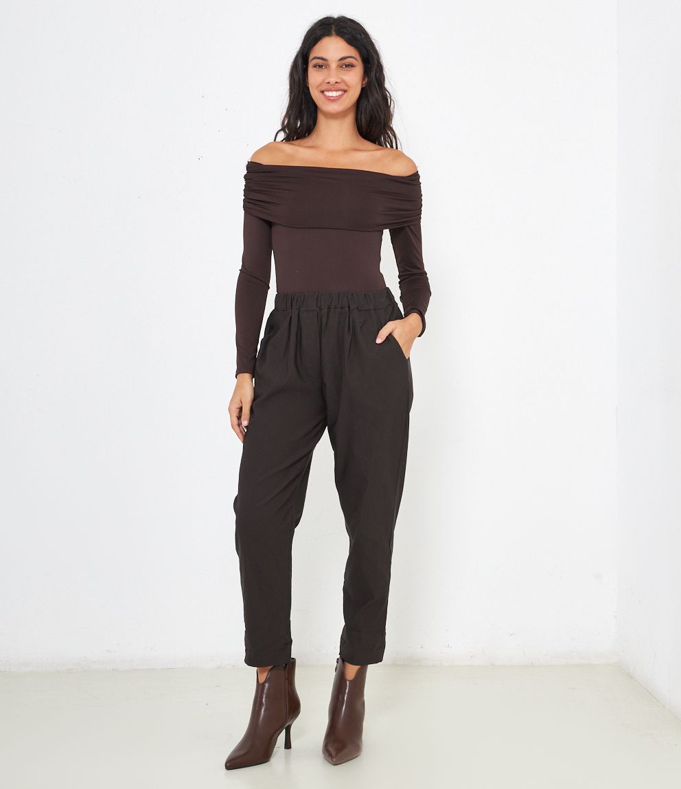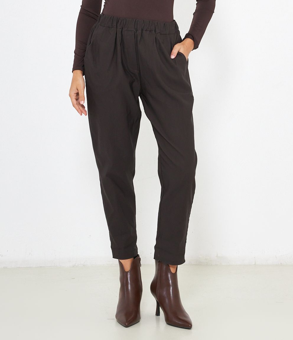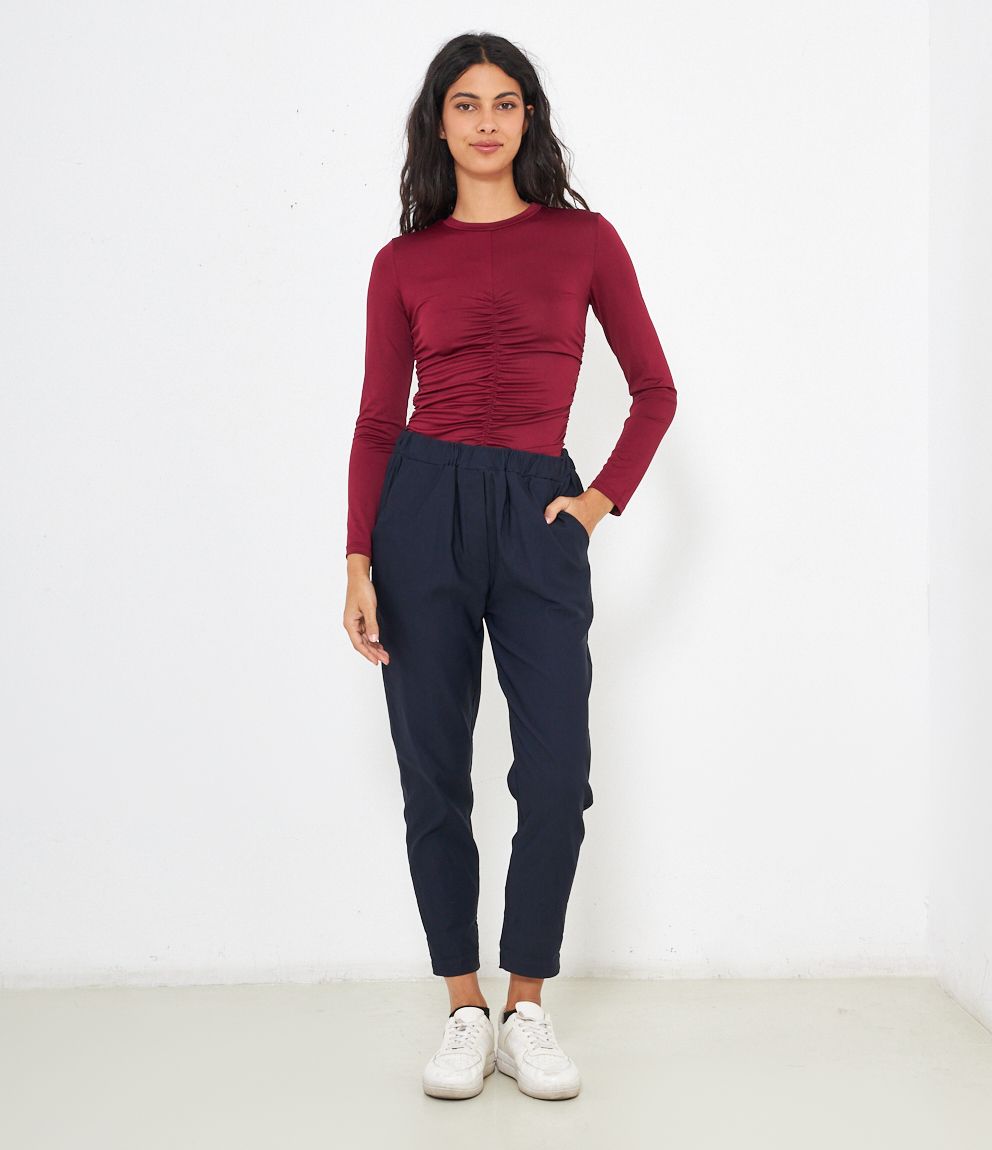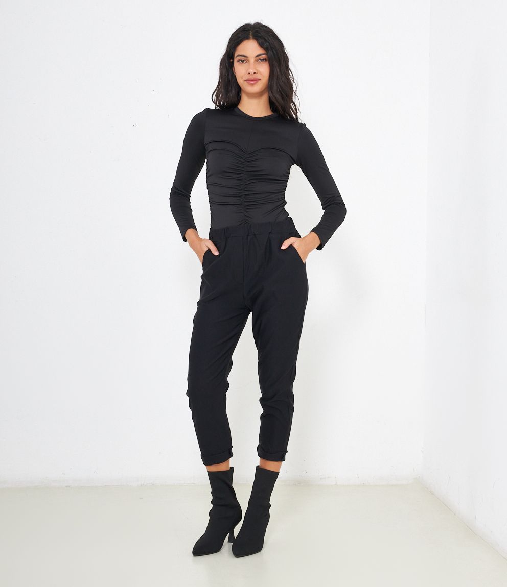 Pantaloni con elastico in vita e risvolti sul fondo.