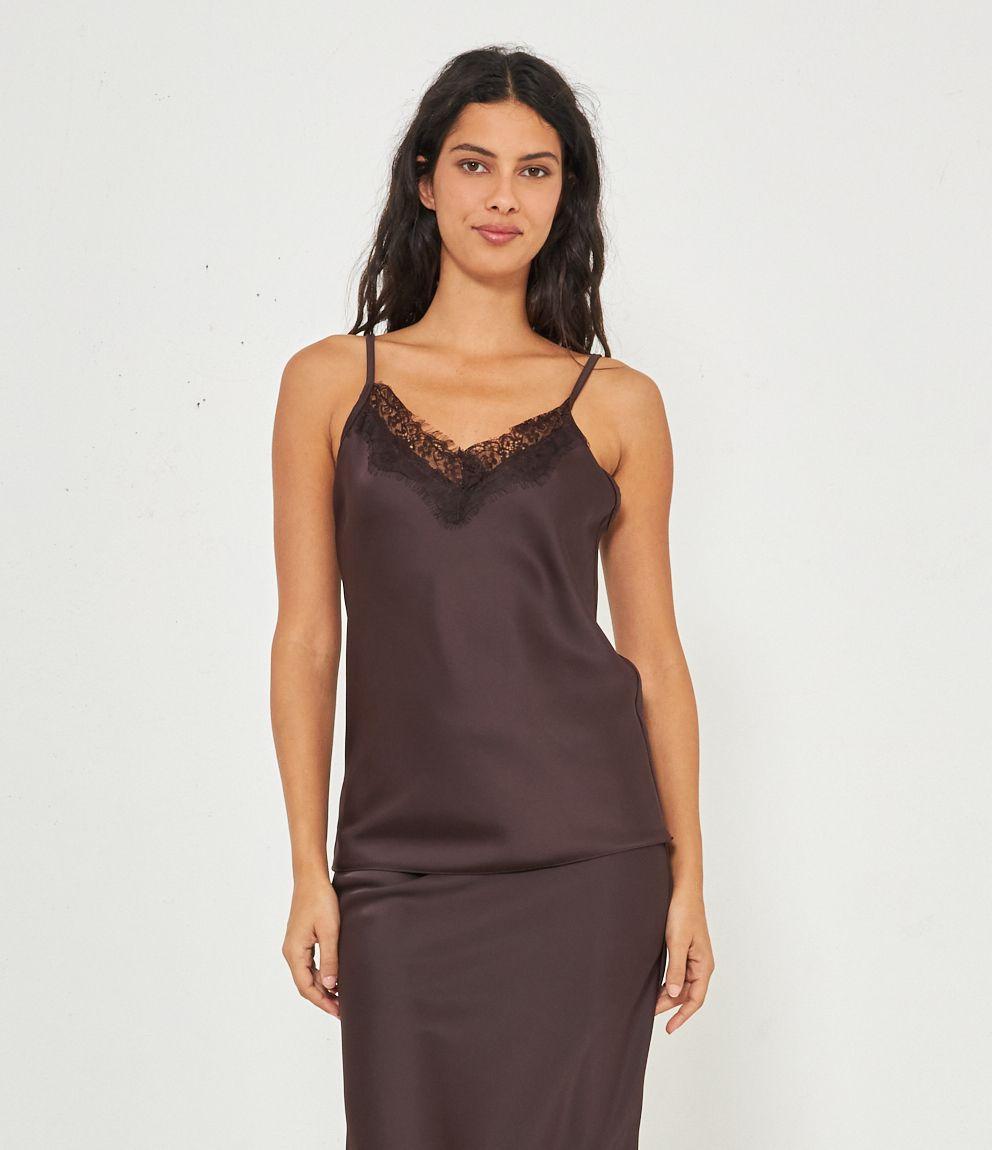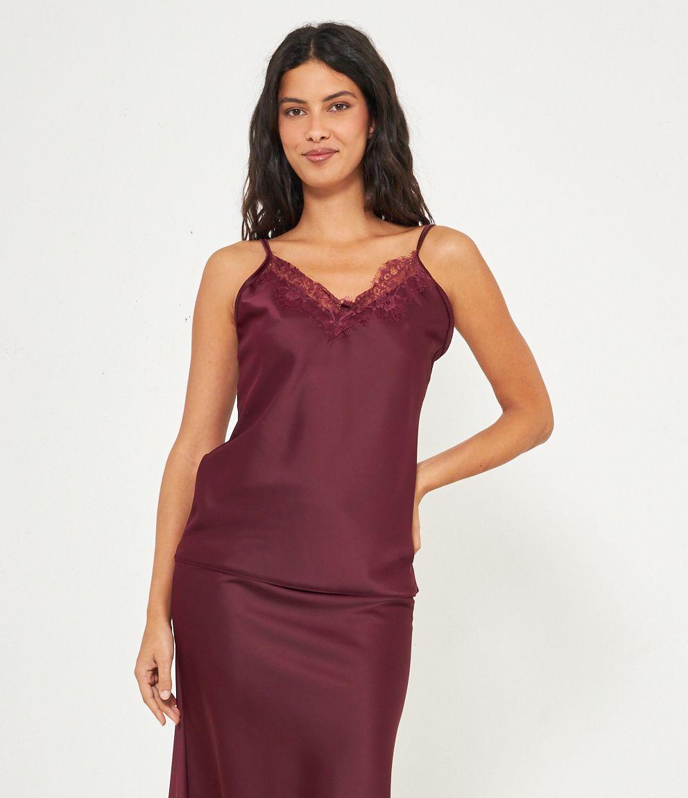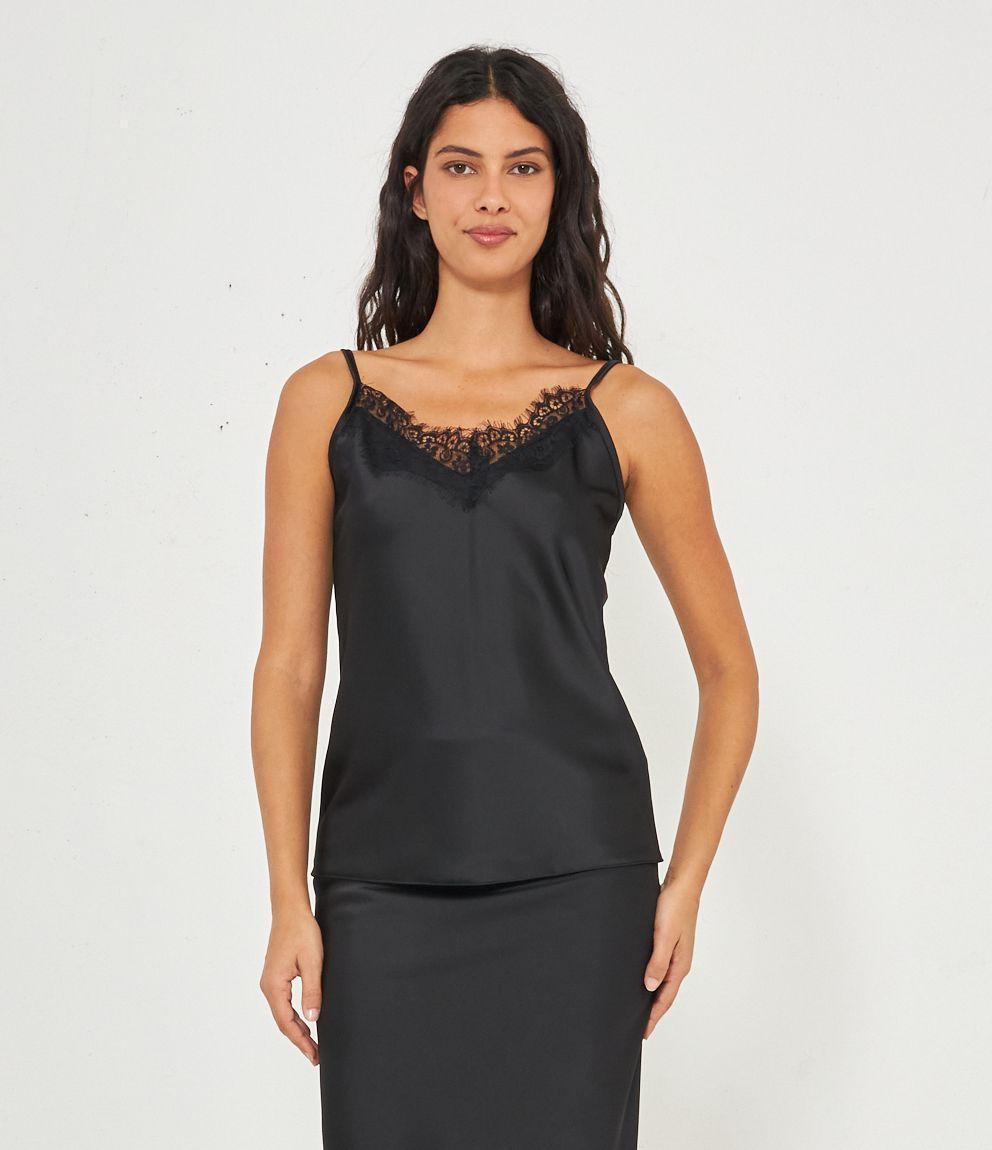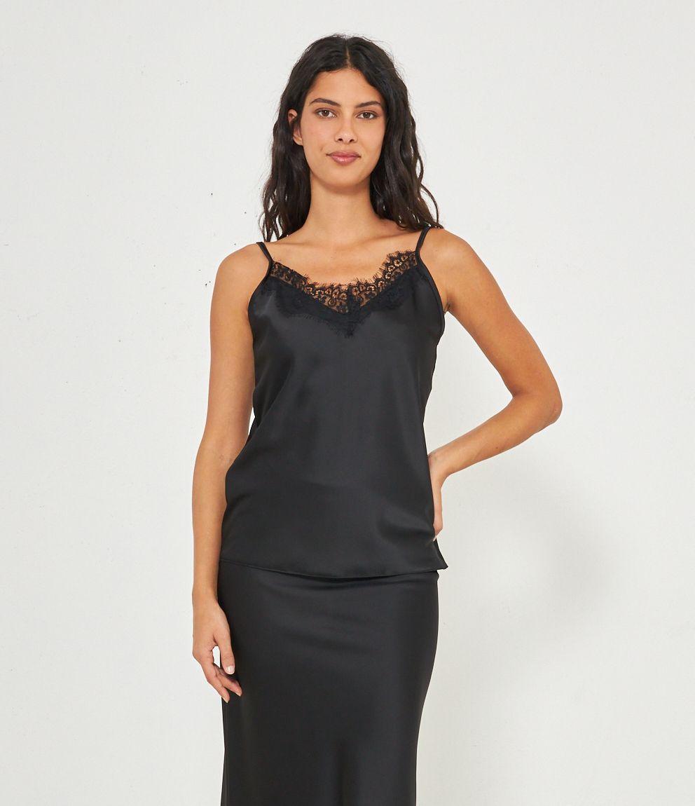 Top modello regular in raso con scollo ampio in pizzo e spalline sottili.