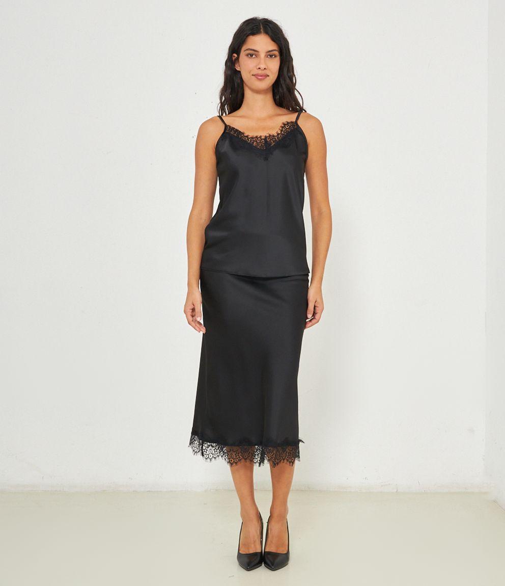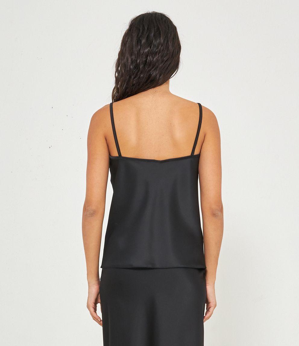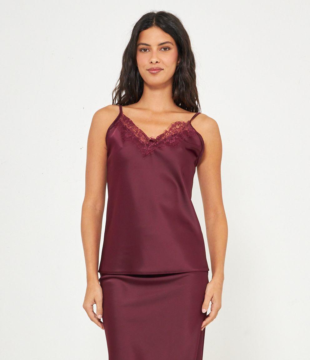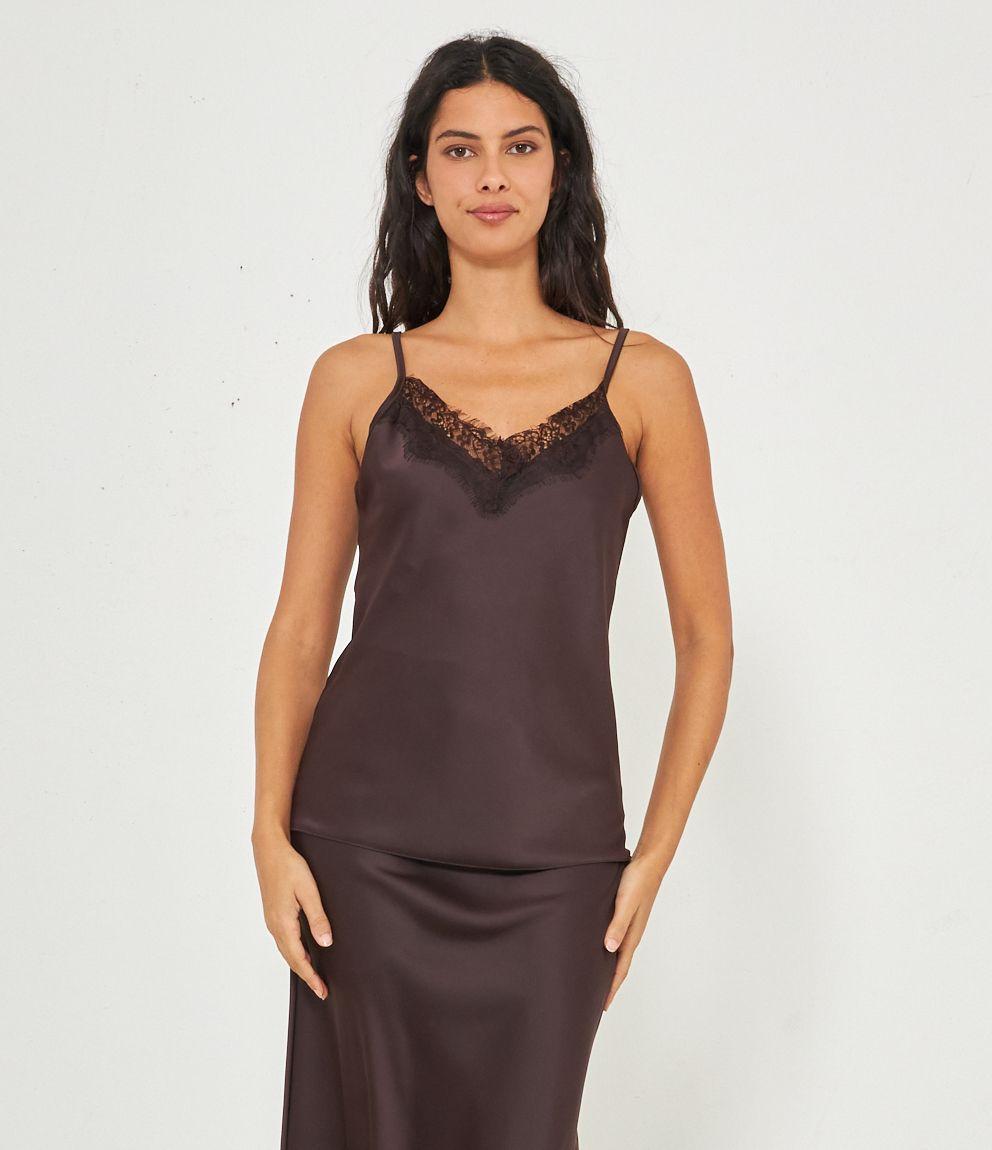 Top modello regular in raso con scollo ampio in pizzo e spalline sottili.