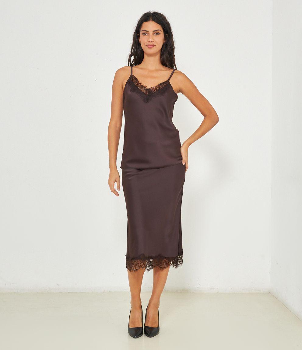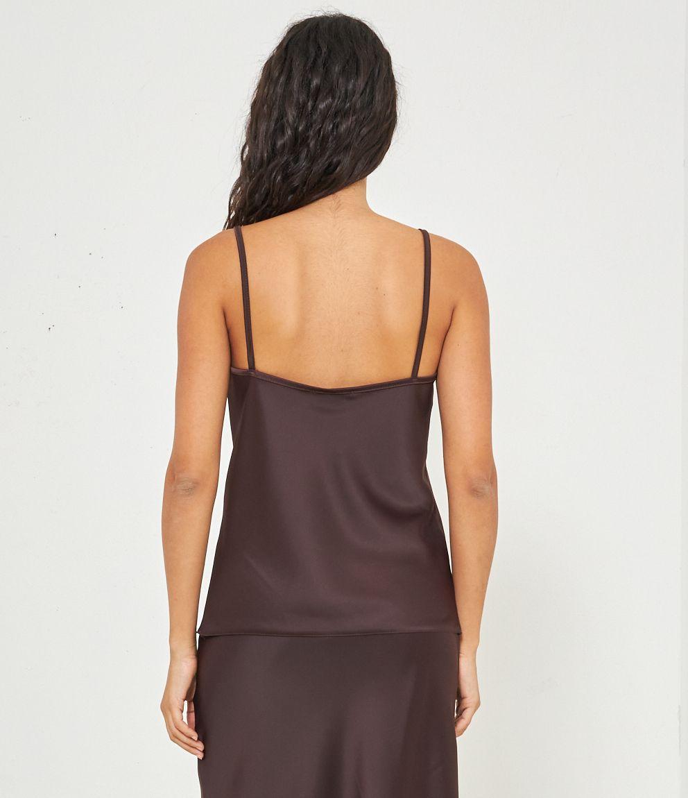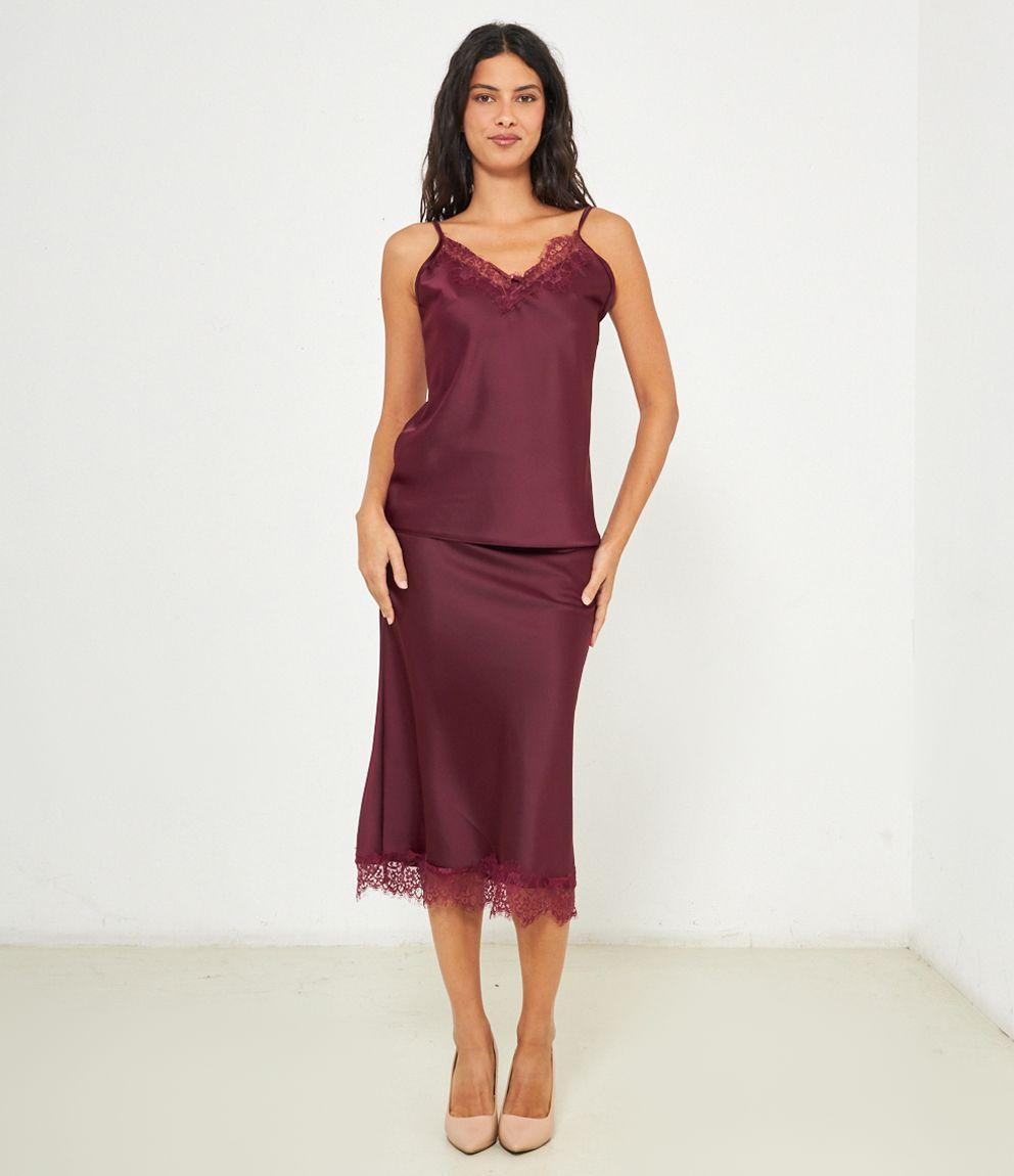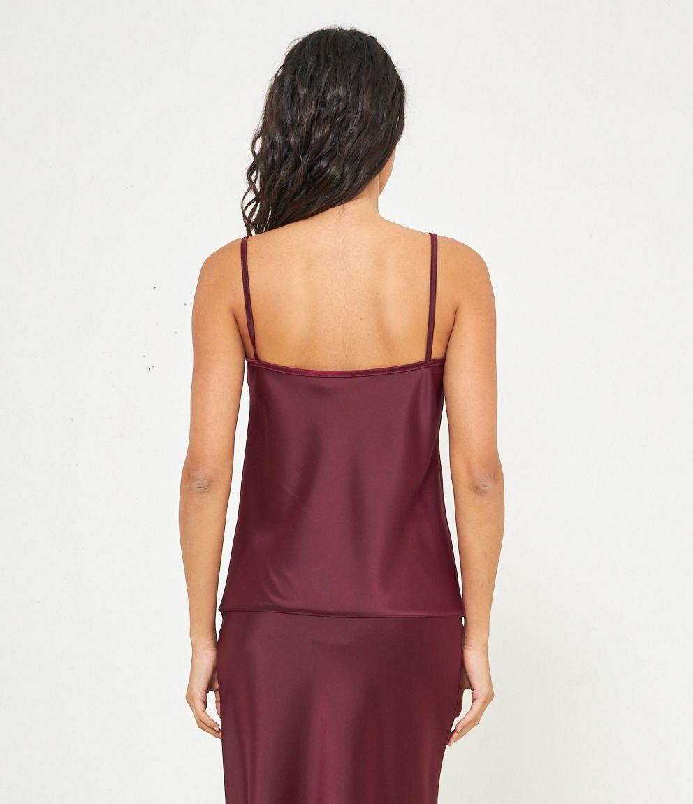 Top modello regular in raso con scollo ampio in pizzo e spalline sottili.