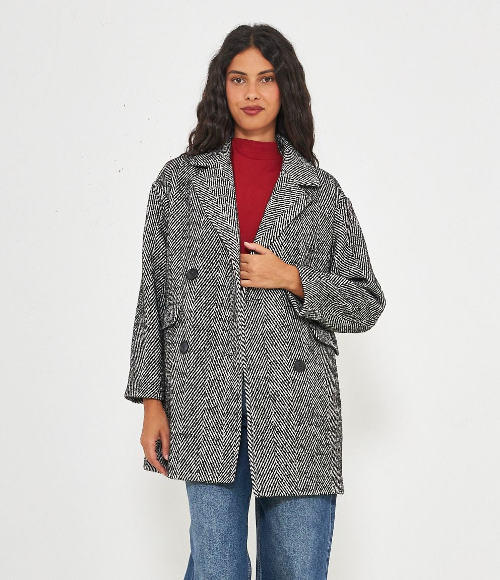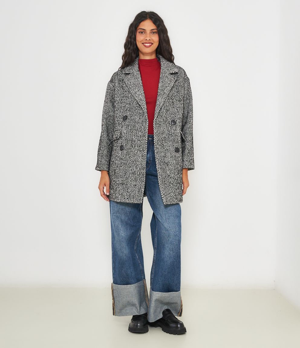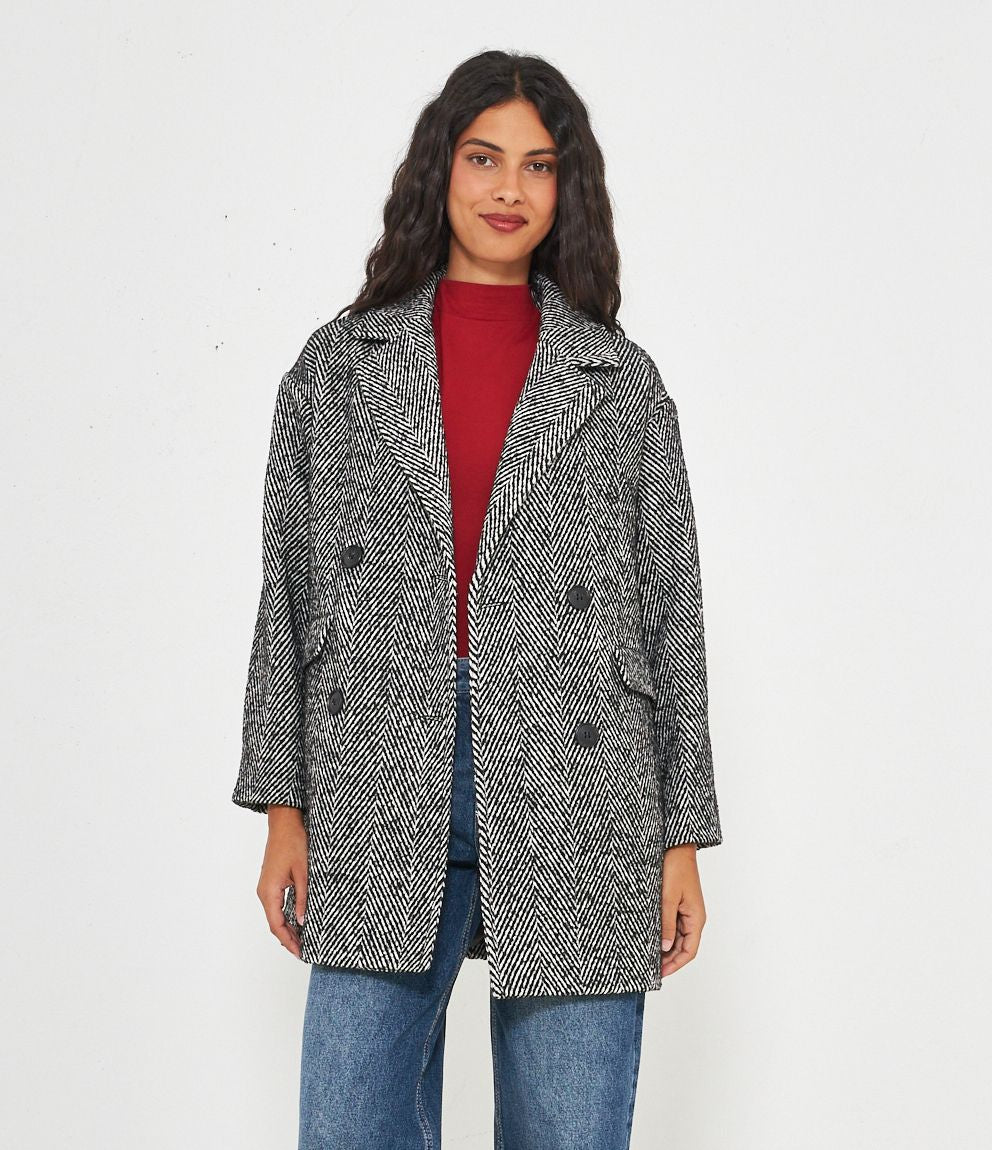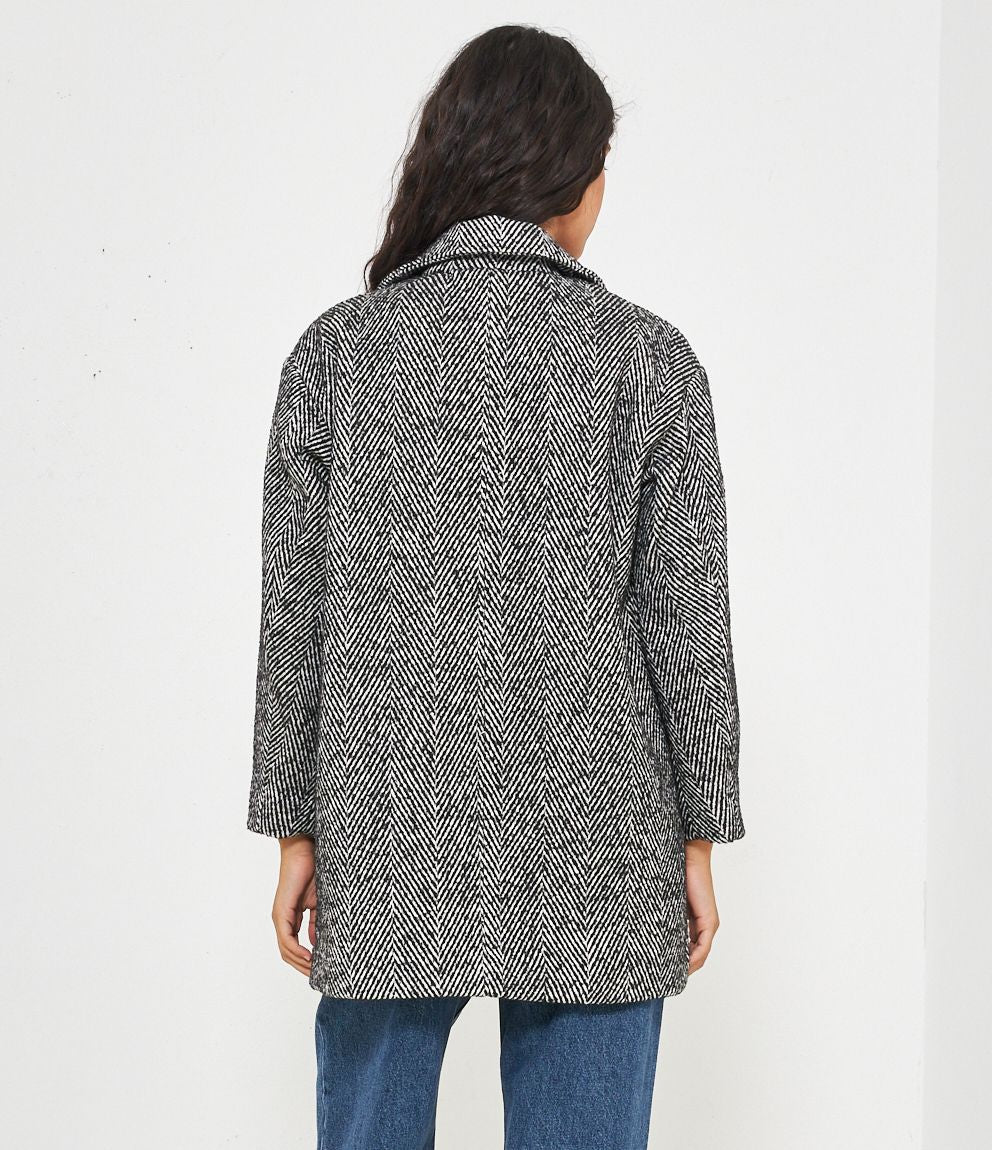 Cappotto spigato con collo revers e quattro bottoni.