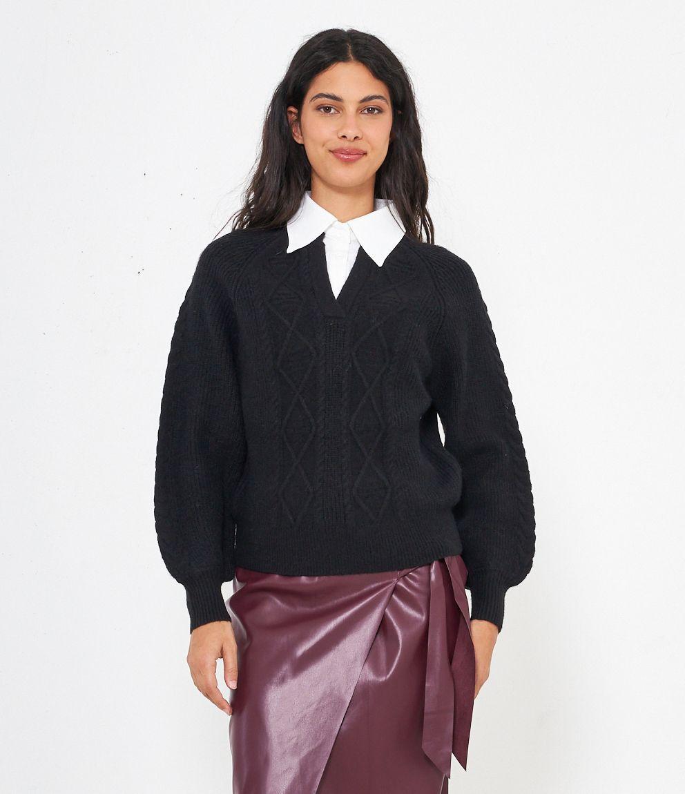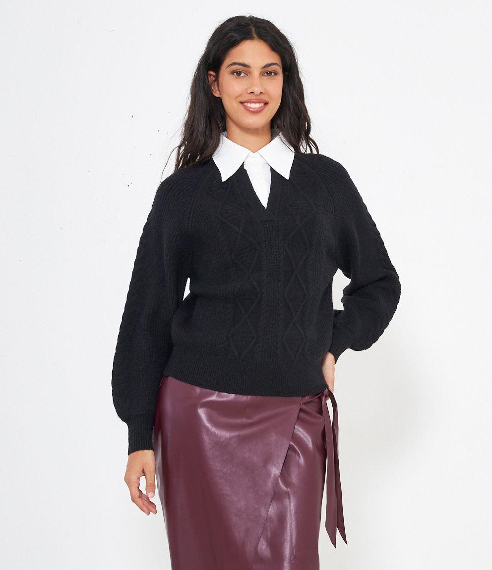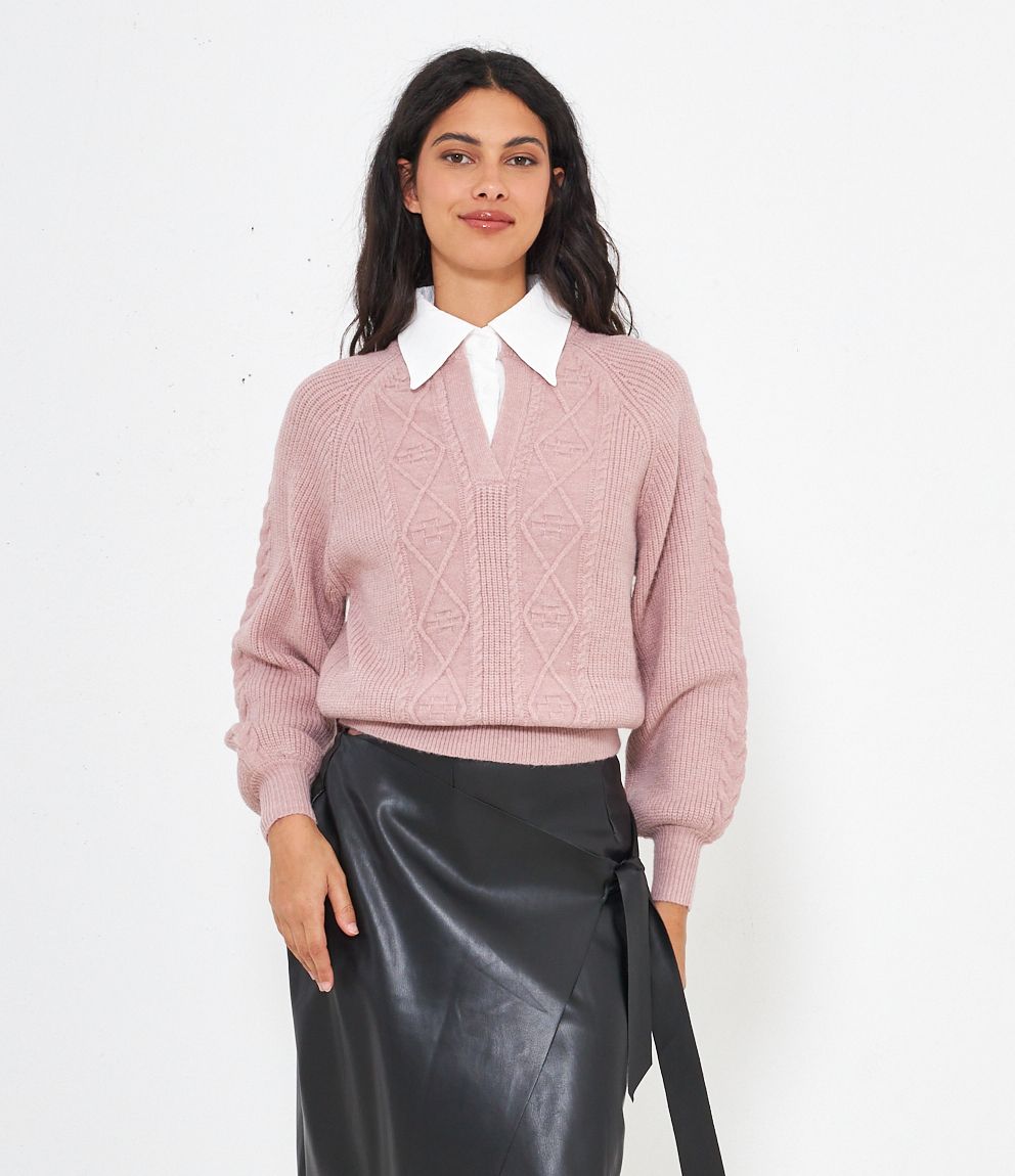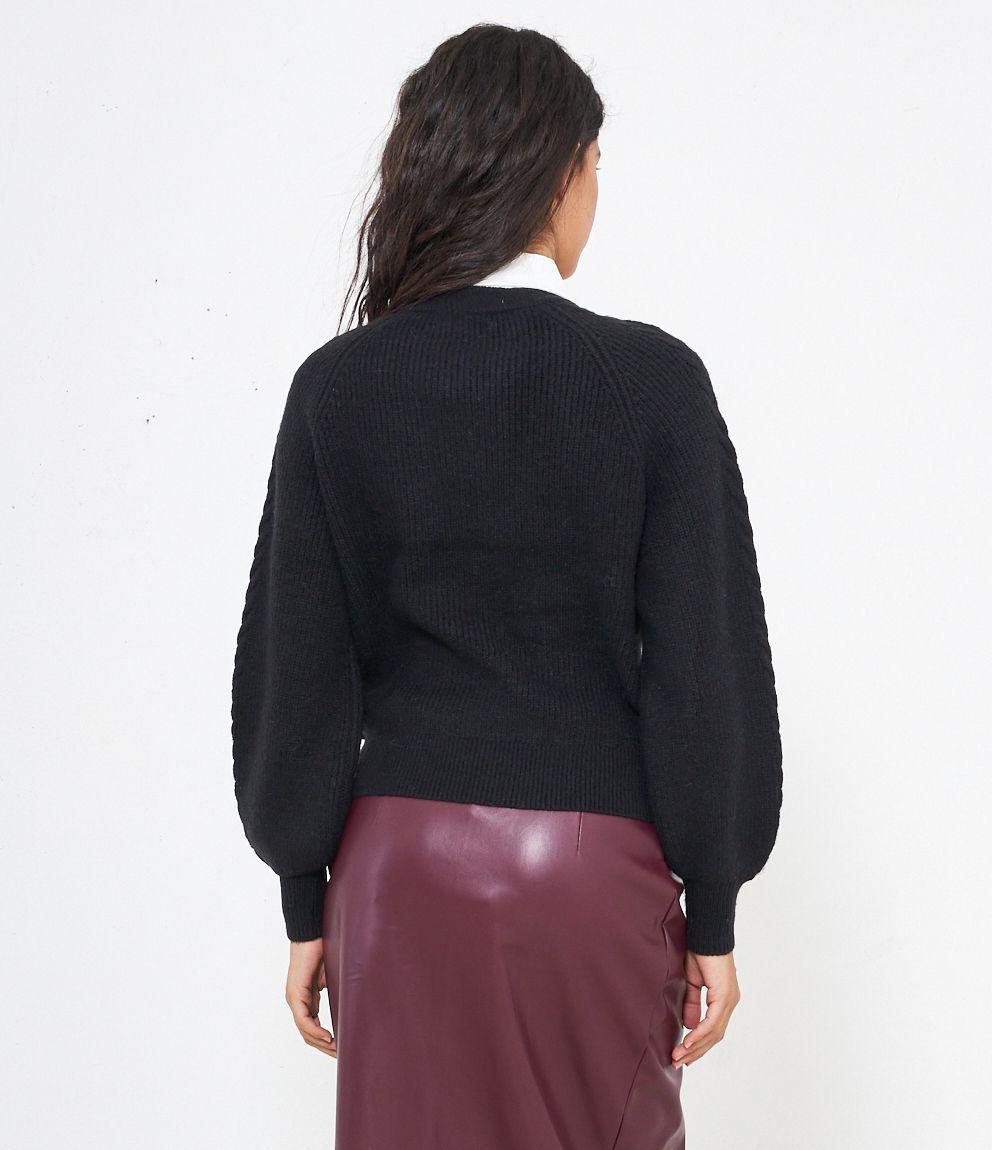 Maglia con lavorazioni a rilievo, collo in camicia e scollo a V.