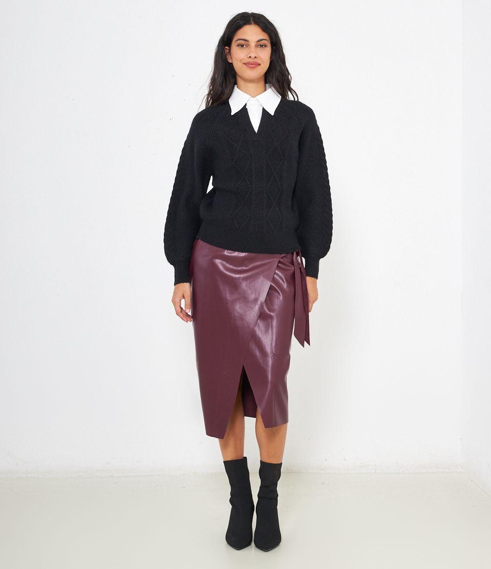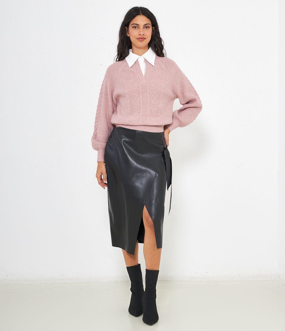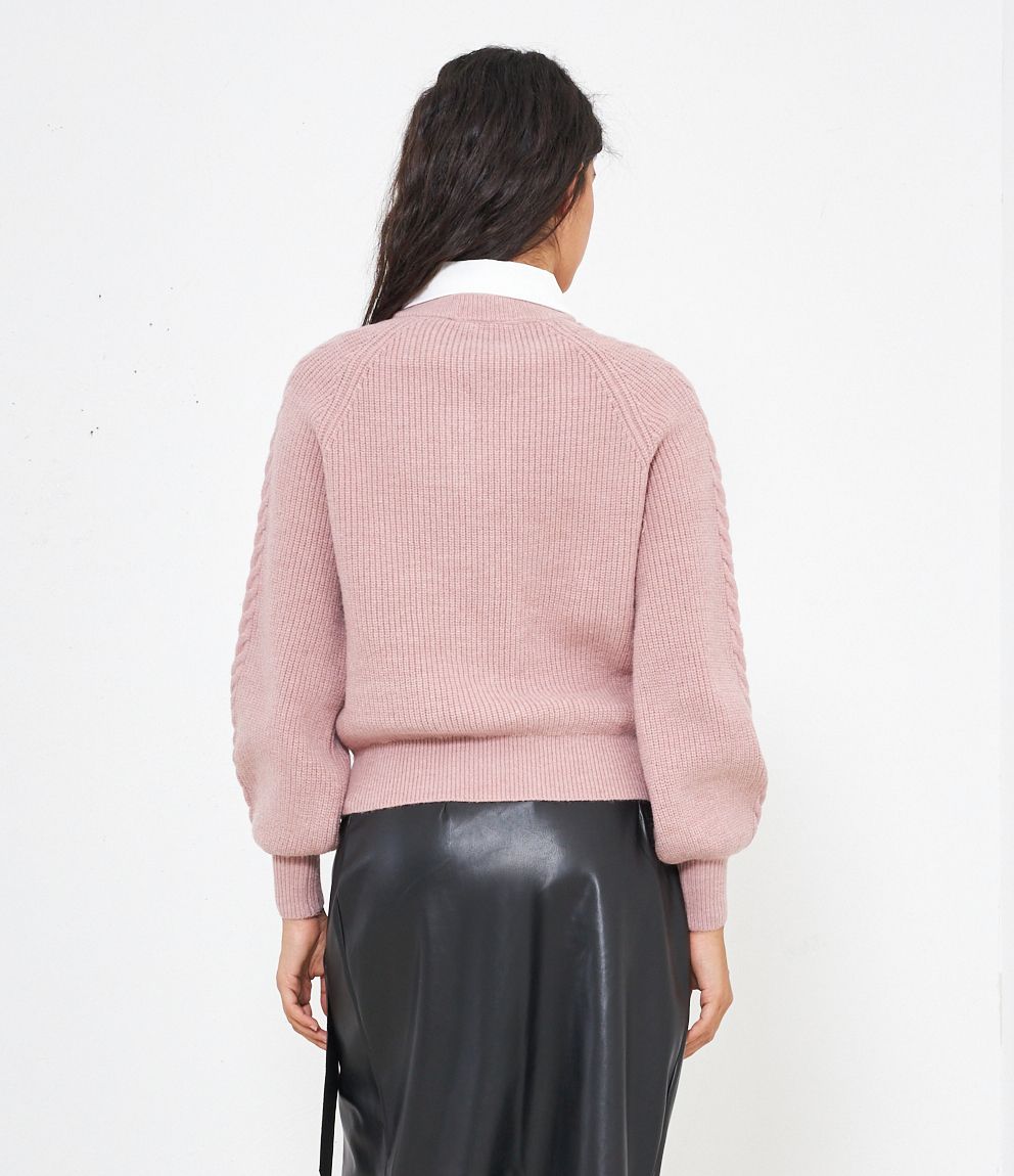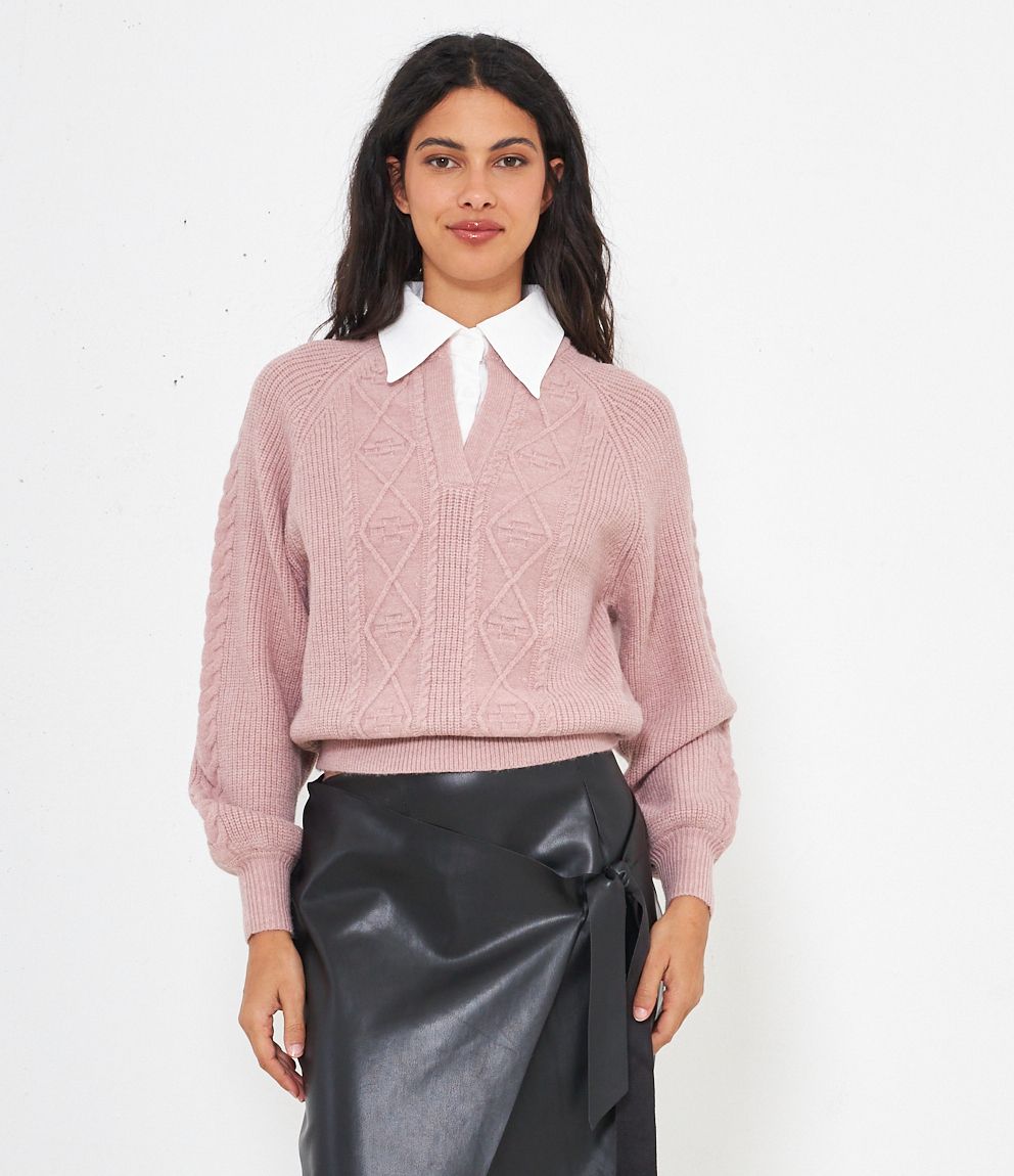 Maglia con lavorazioni a rilievo, collo in camicia e scollo a V.